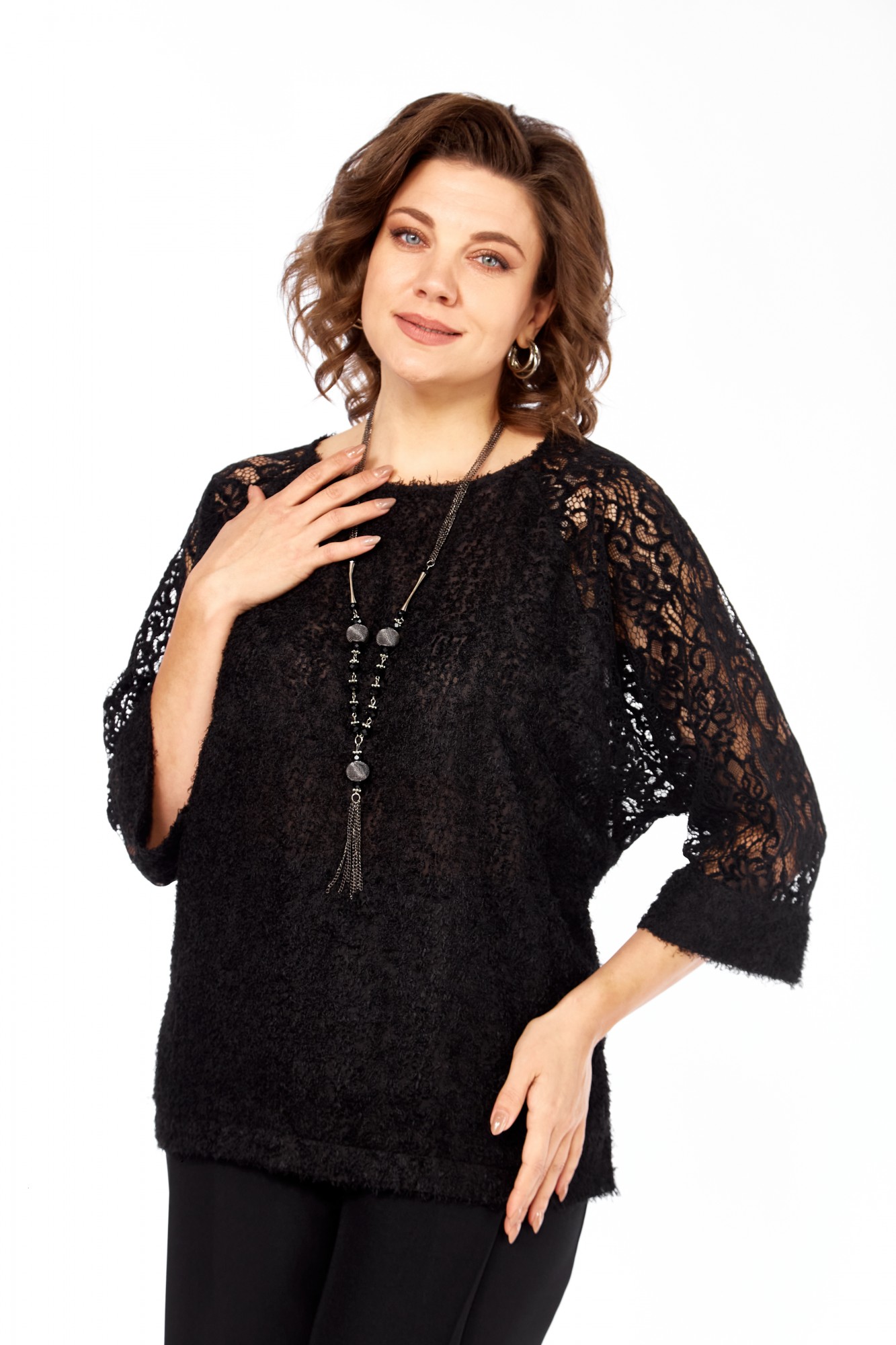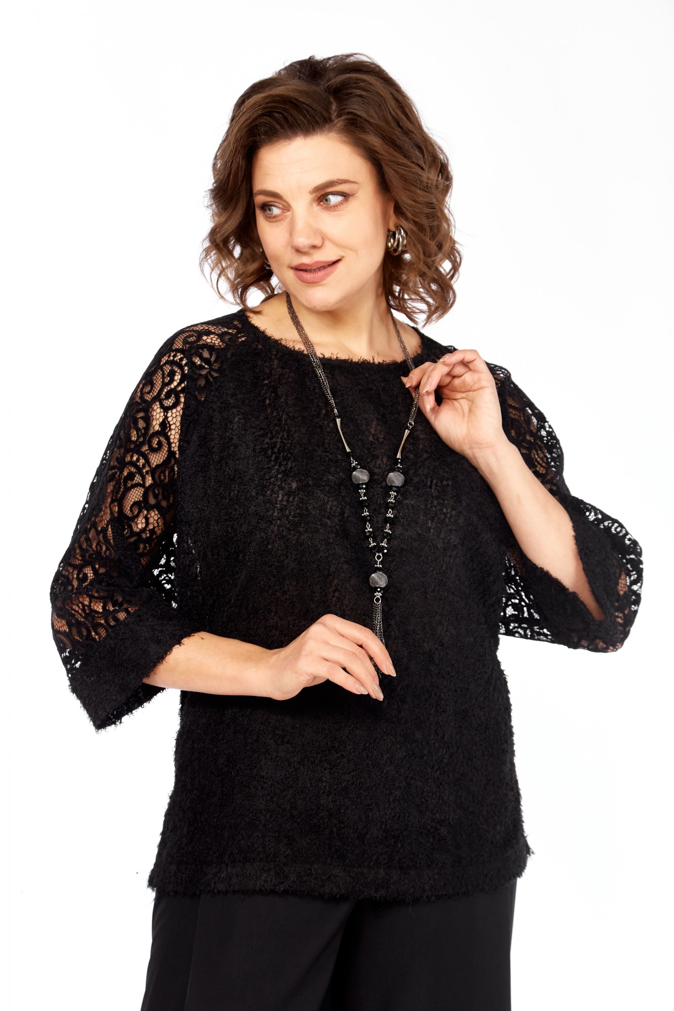 Праздничная элегантная блузка полуприлегающего силуэта, выглядит эффектно, прекрасно подойдет для вечерних мероприятий. Горловина аккуратной округлой формы. Рукав выполнен из мягкого кружева, что придает дополнительный шарм, длина 7/8. В боковых швах предусмотрены разрезы.