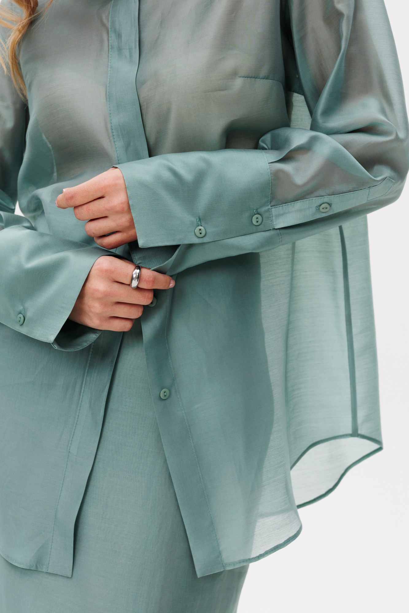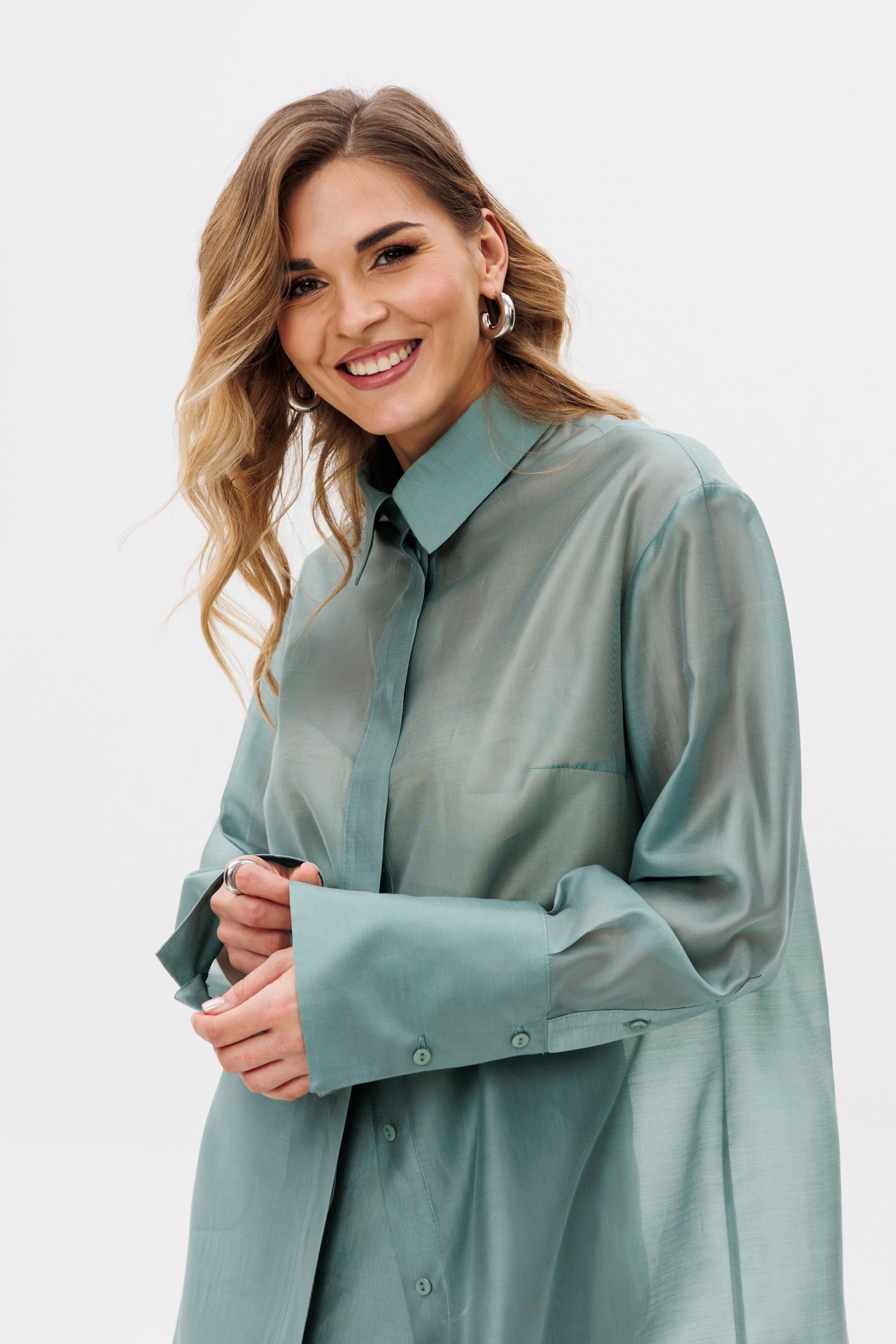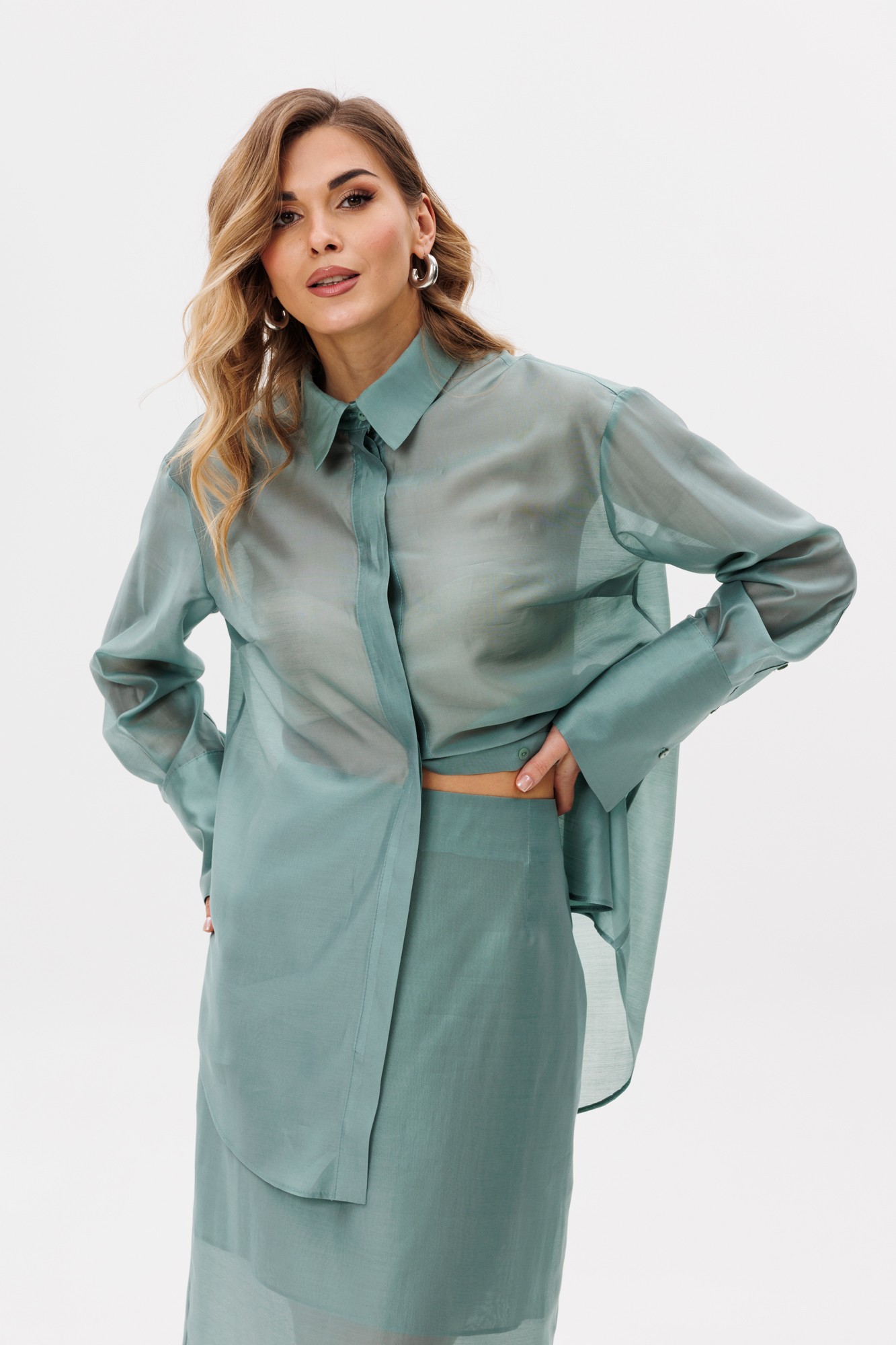 Блузка выполнена из плательно-блузочной ткани. Блузка прямого силуэта, длиной ниже линии бедер. Спереди застежка на пуговицы и потайную планку. Спинка цельная. Воротник стояче-отложной. Плечевой шов удлинен. Рукав рубашечного покроя, одношовный. Низ рукава на притачной манжете. Низ блузки фигурной формы.