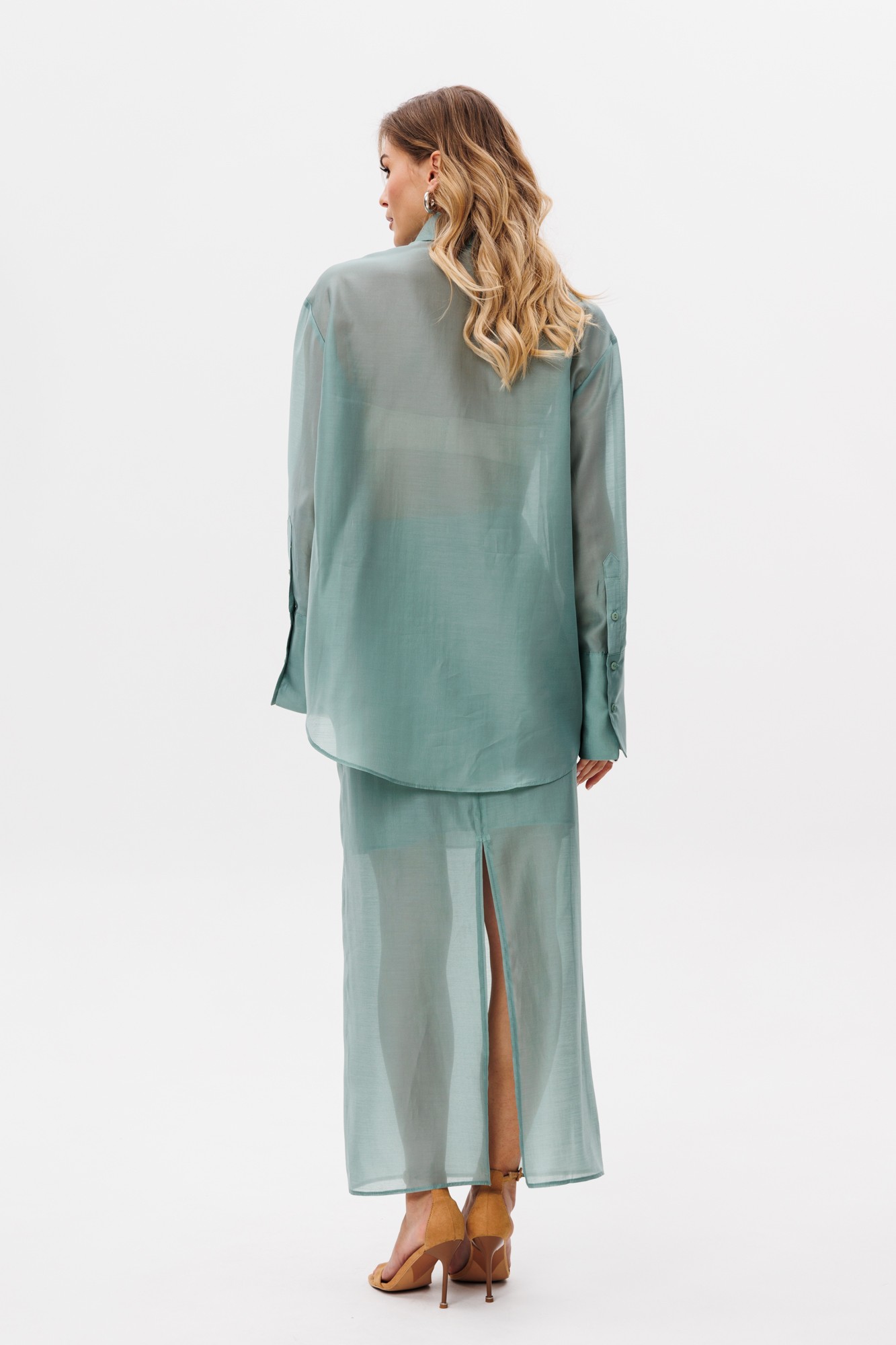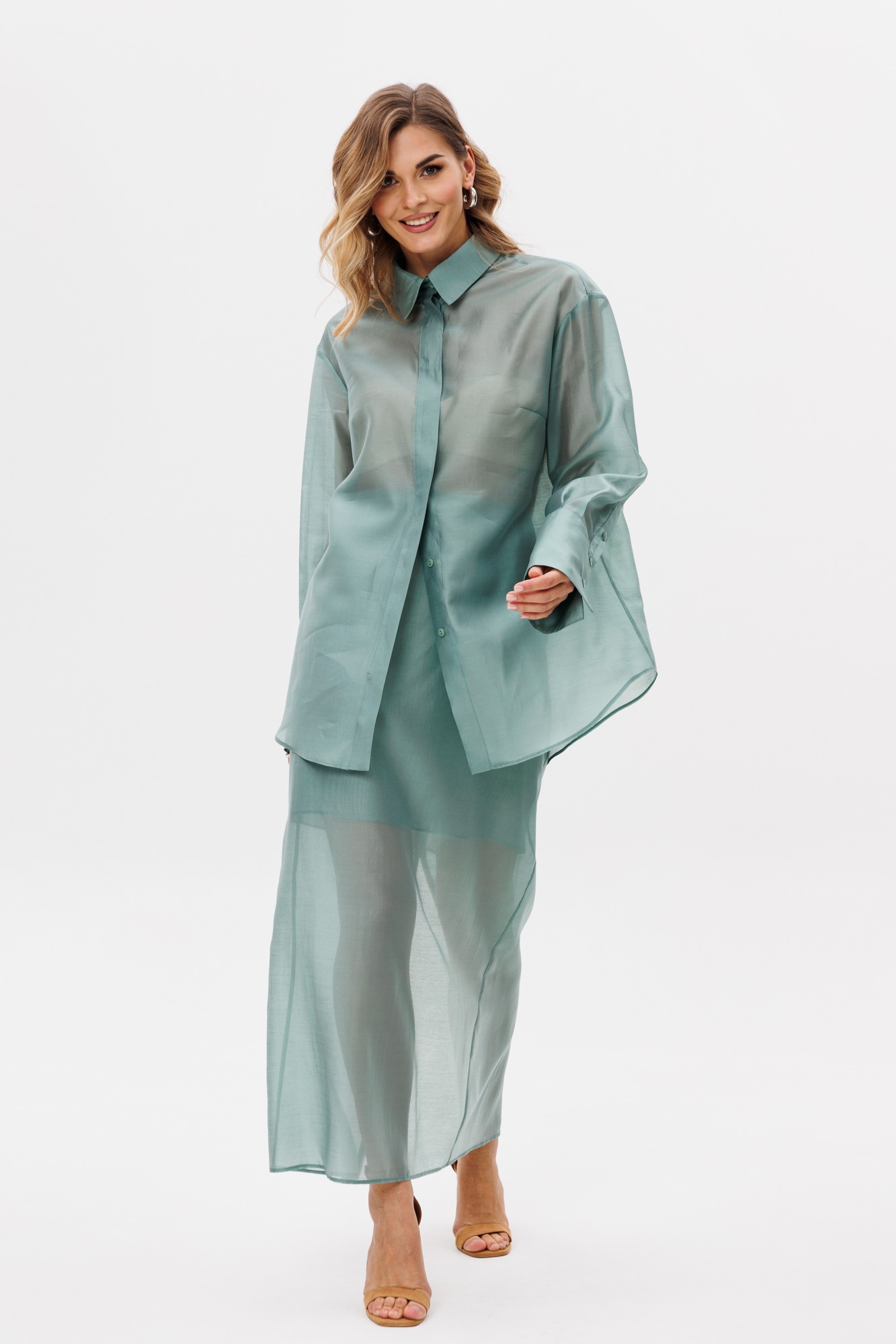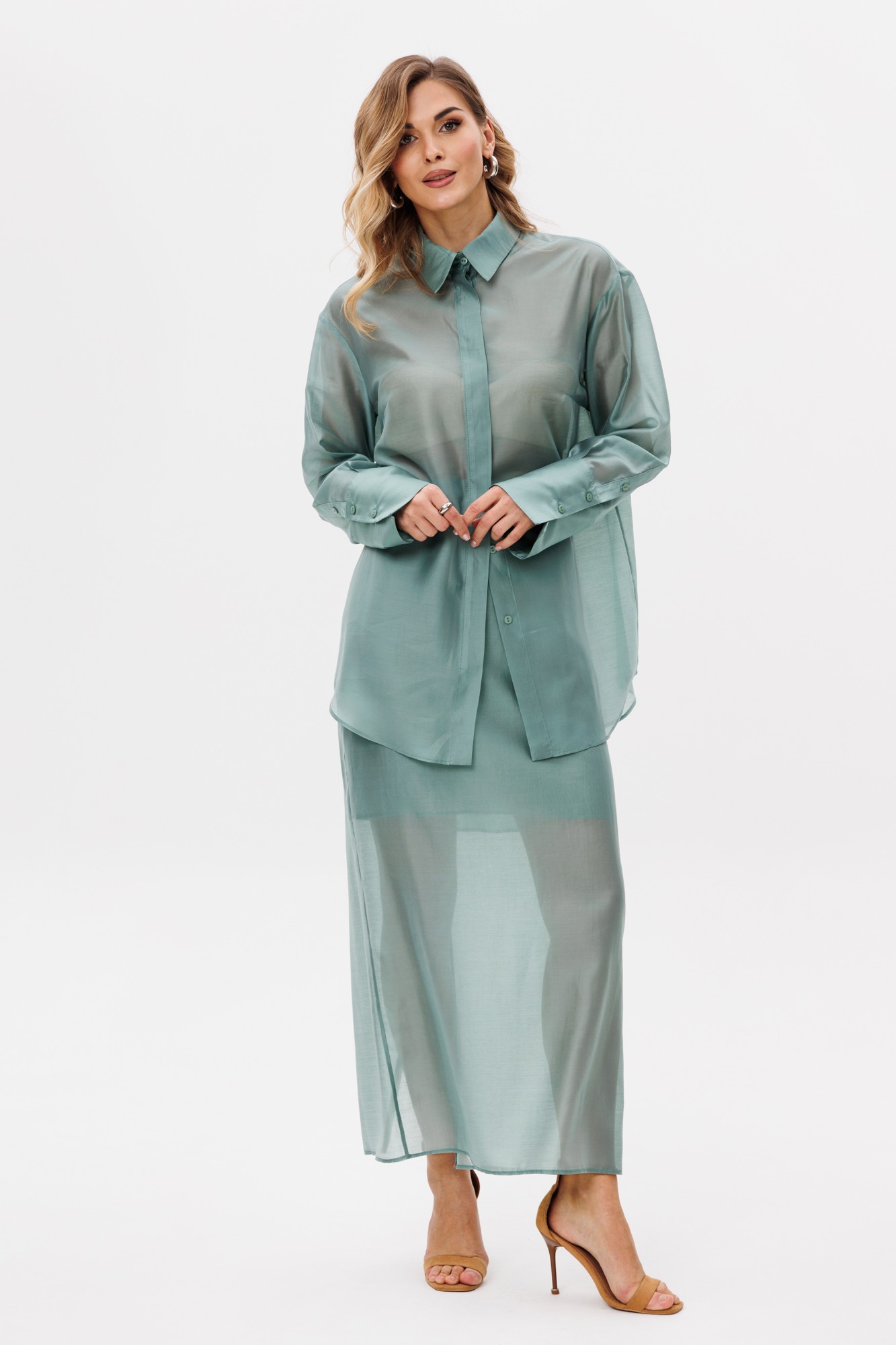 Блузка выполнена из плательно-блузочной ткани. Блузка прямого силуэта, длиной ниже линии бедер. Спереди застежка на пуговицы и потайную планку. Спинка цельная. Воротник стояче-отложной. Плечевой шов удлинен. Рукав рубашечного покроя, одношовный. Низ рукава на притачной манжете. Низ блузки фигурной формы.