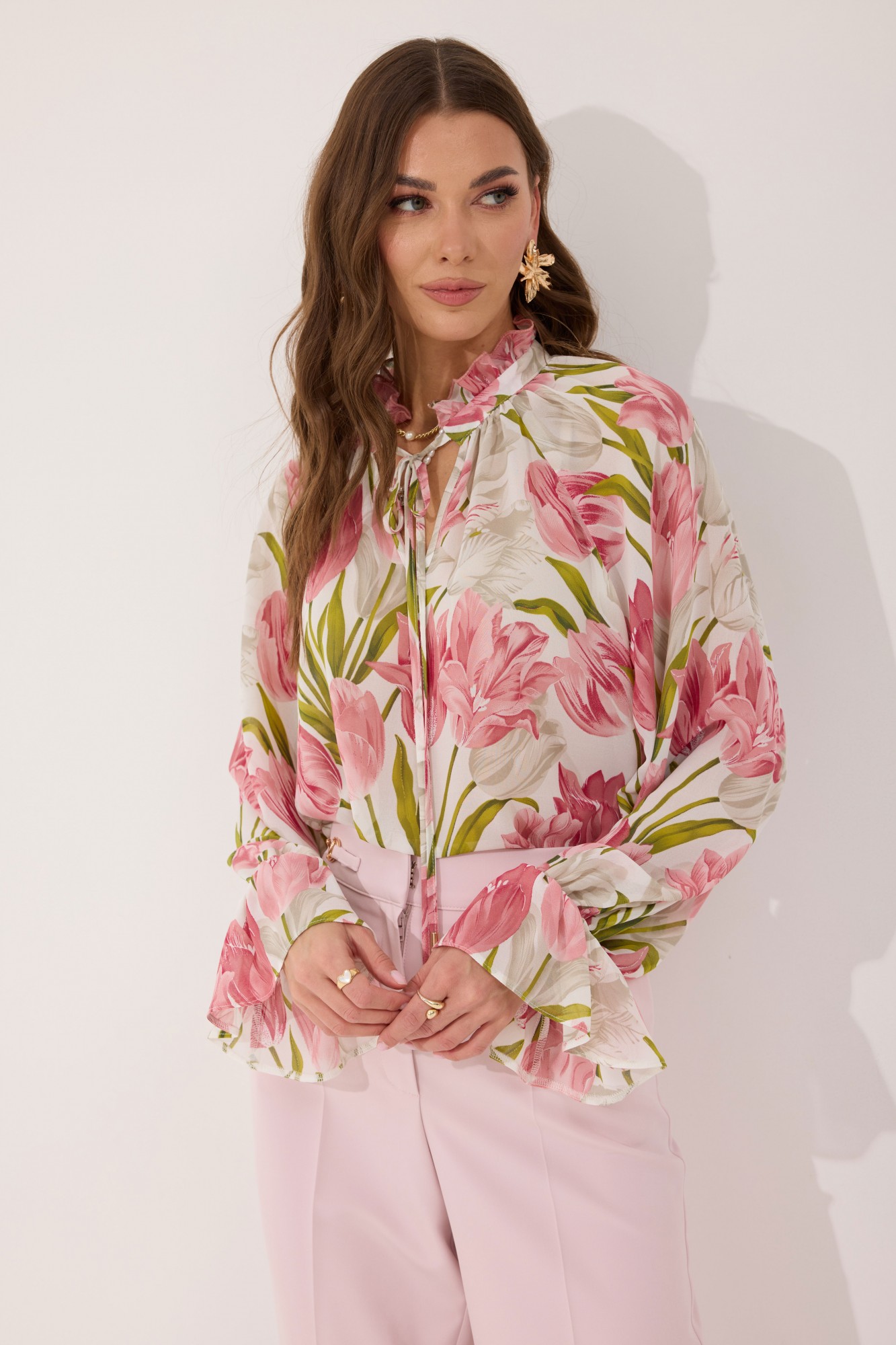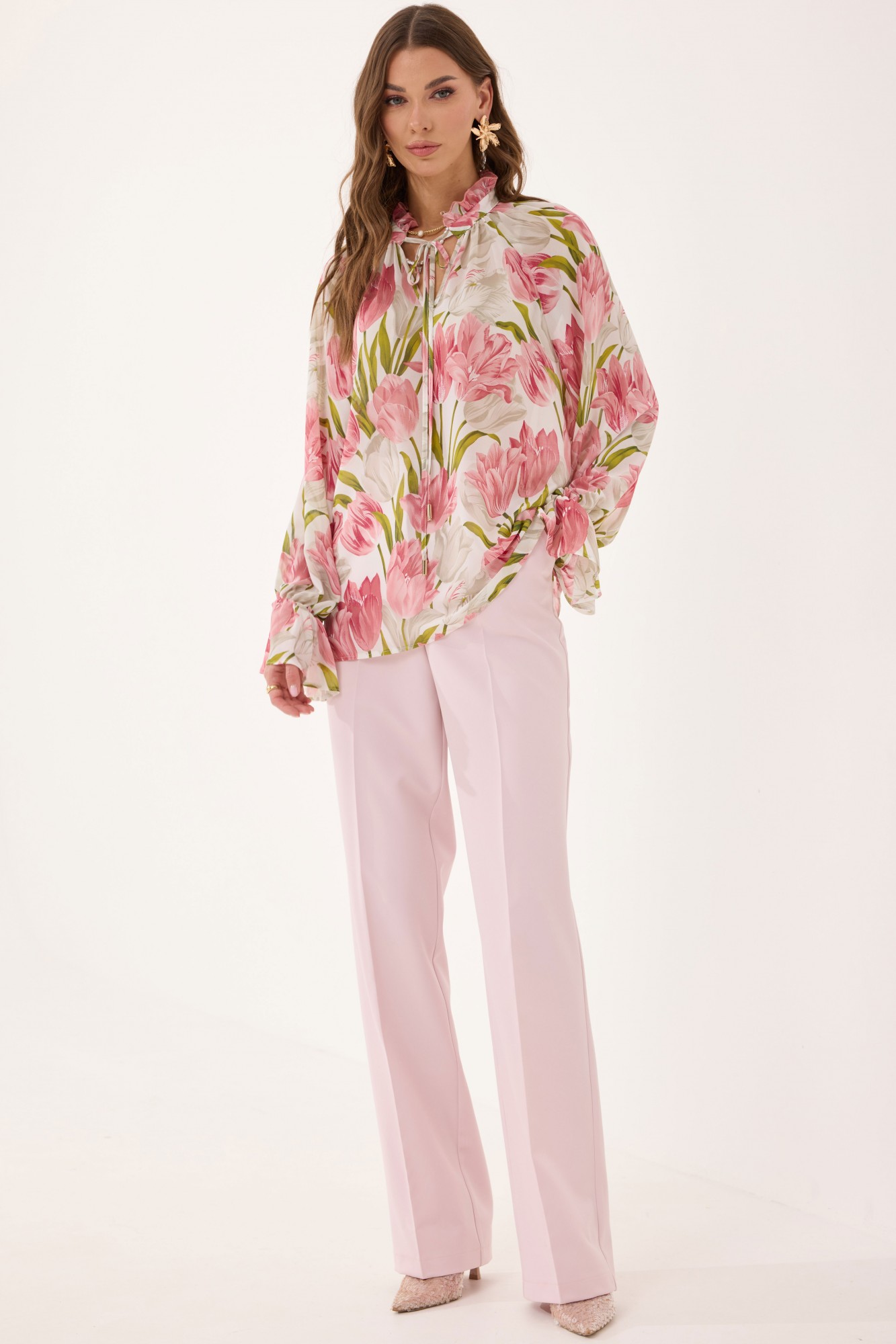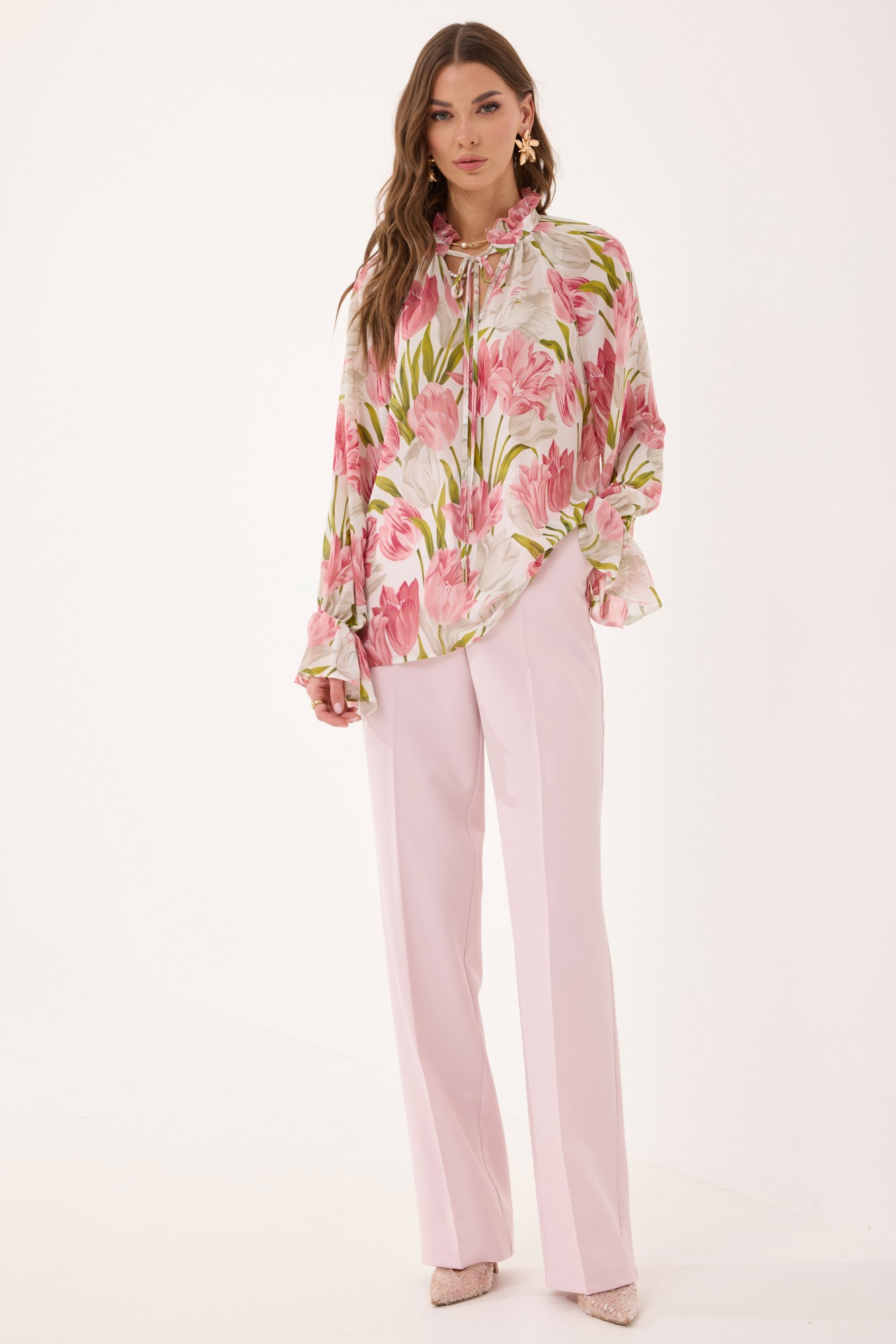 Блуза прямого силуэта из шифоновой ткани. Воротник-стойка с завязками. По переду V-образный вырез, по горловине сборка. Рукав-реглан удлиненный, по низу волан собранный на резинку. В боковых швах по низу разрезы.
