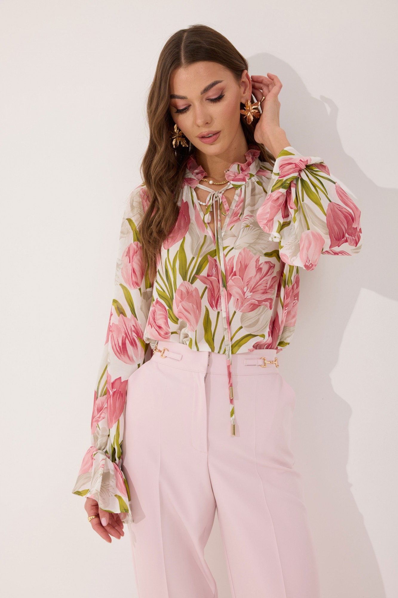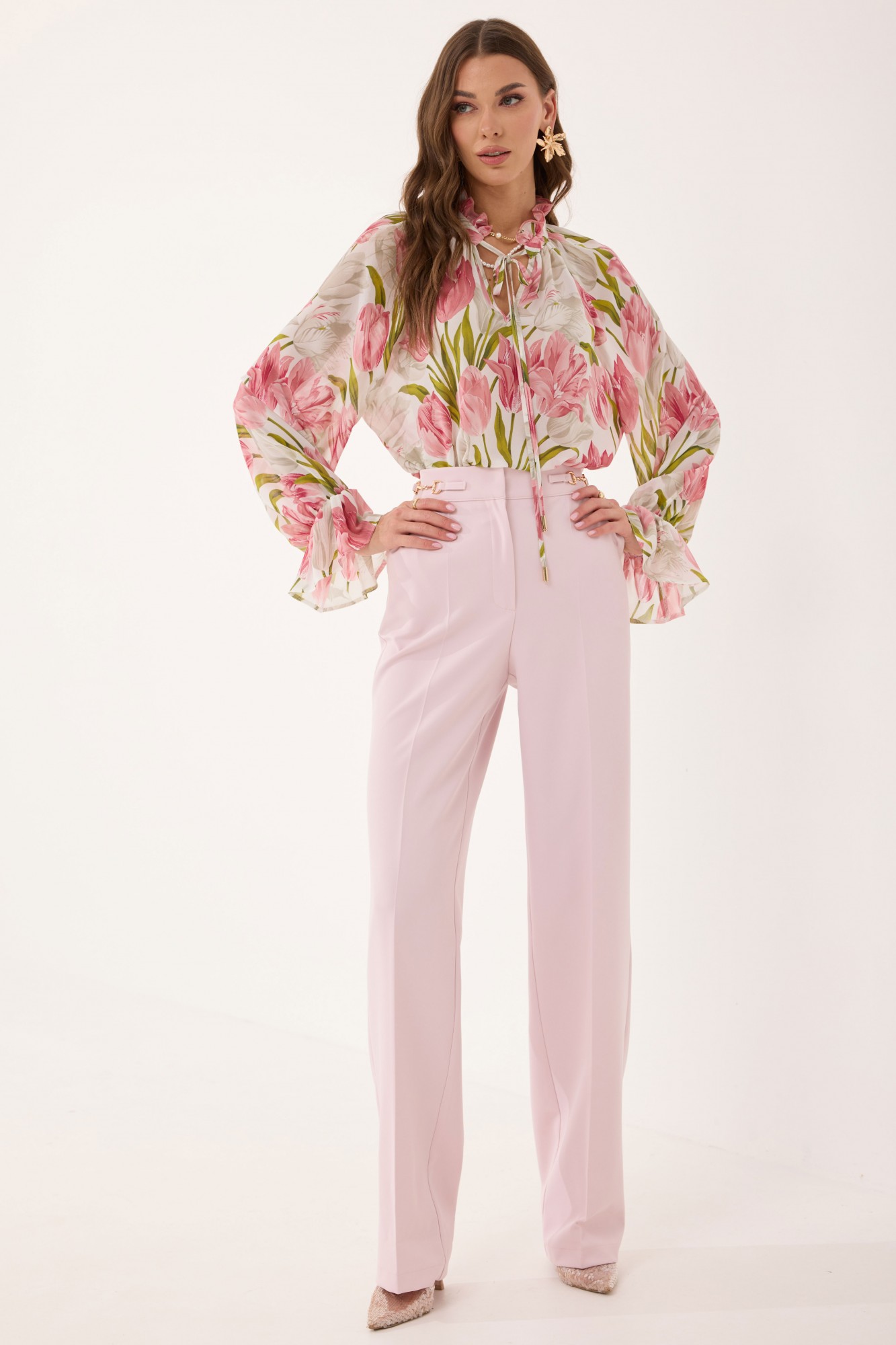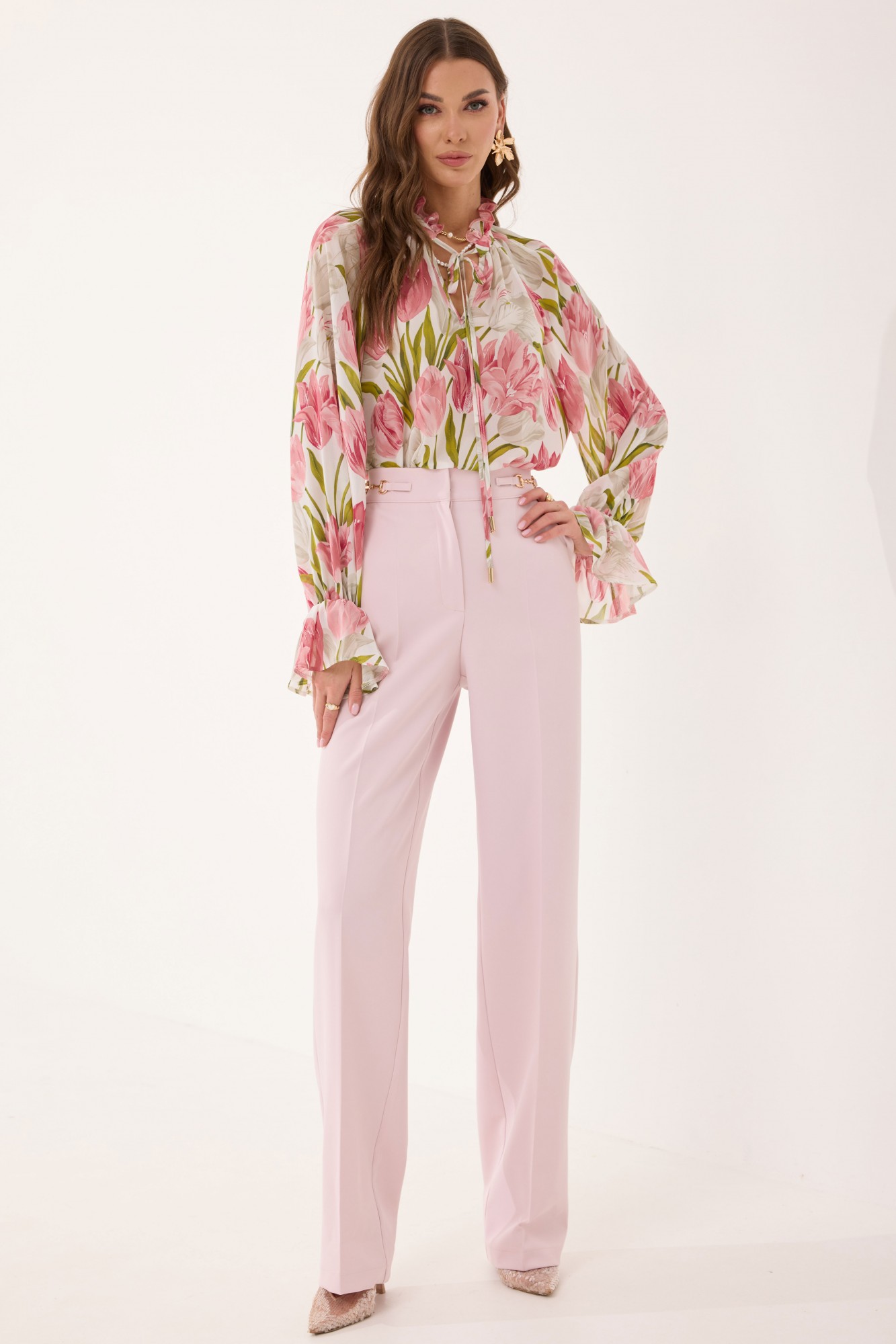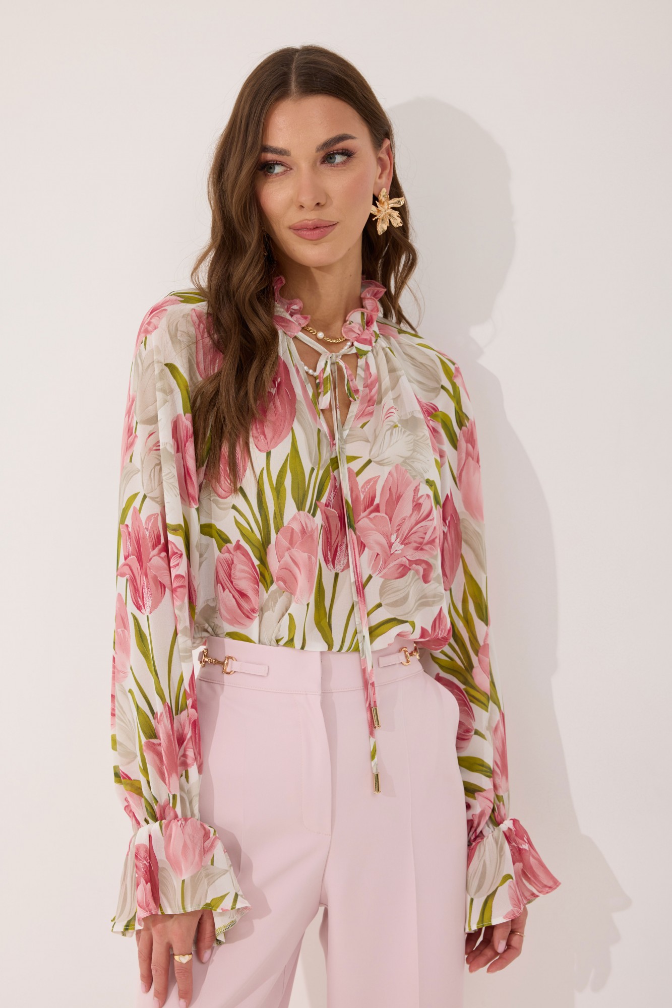 Блуза прямого силуэта из шифоновой ткани. Воротник-стойка с завязками. По переду V-образный вырез, по горловине сборка. Рукав-реглан удлиненный, по низу волан собранный на резинку. В боковых швах по низу разрезы.