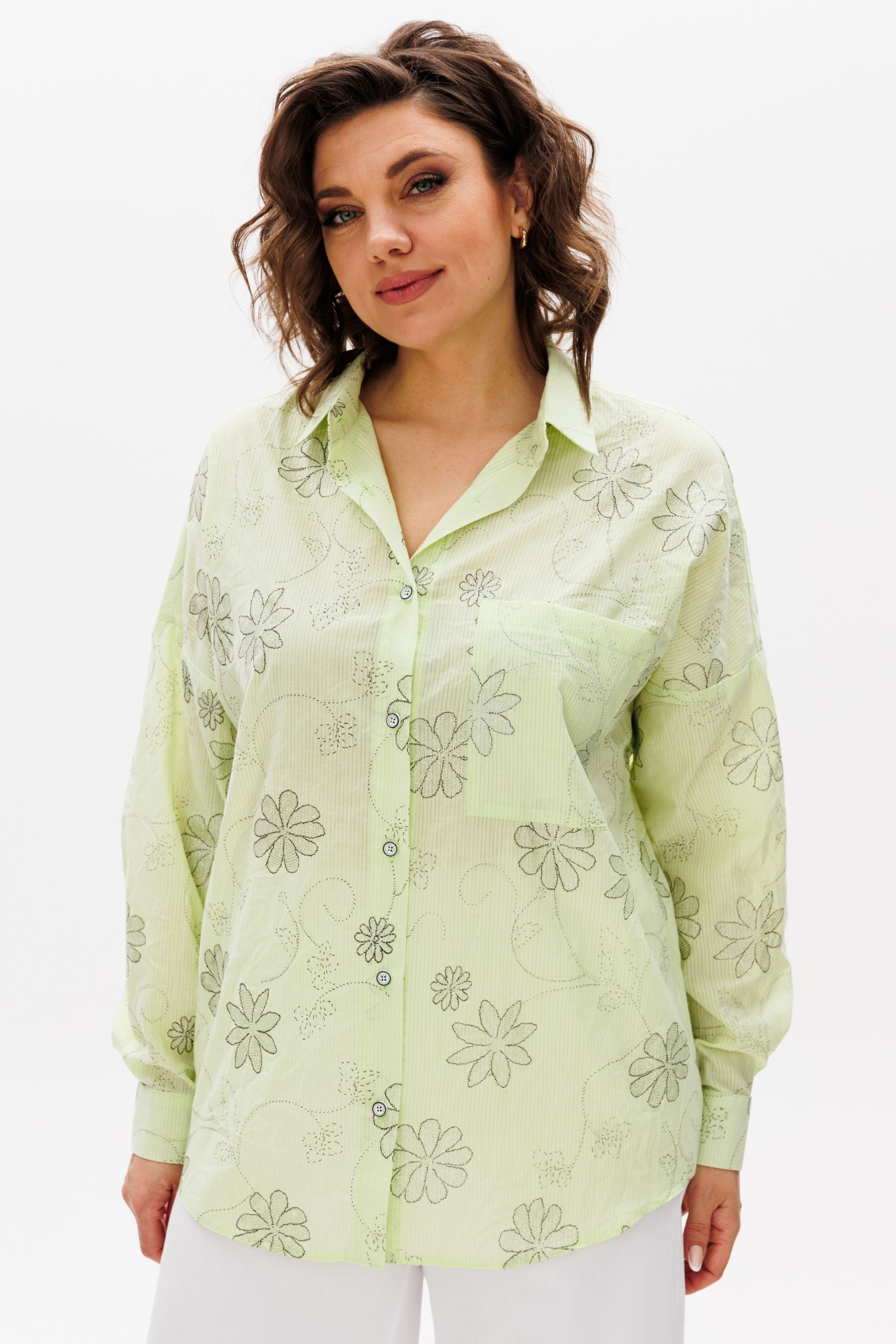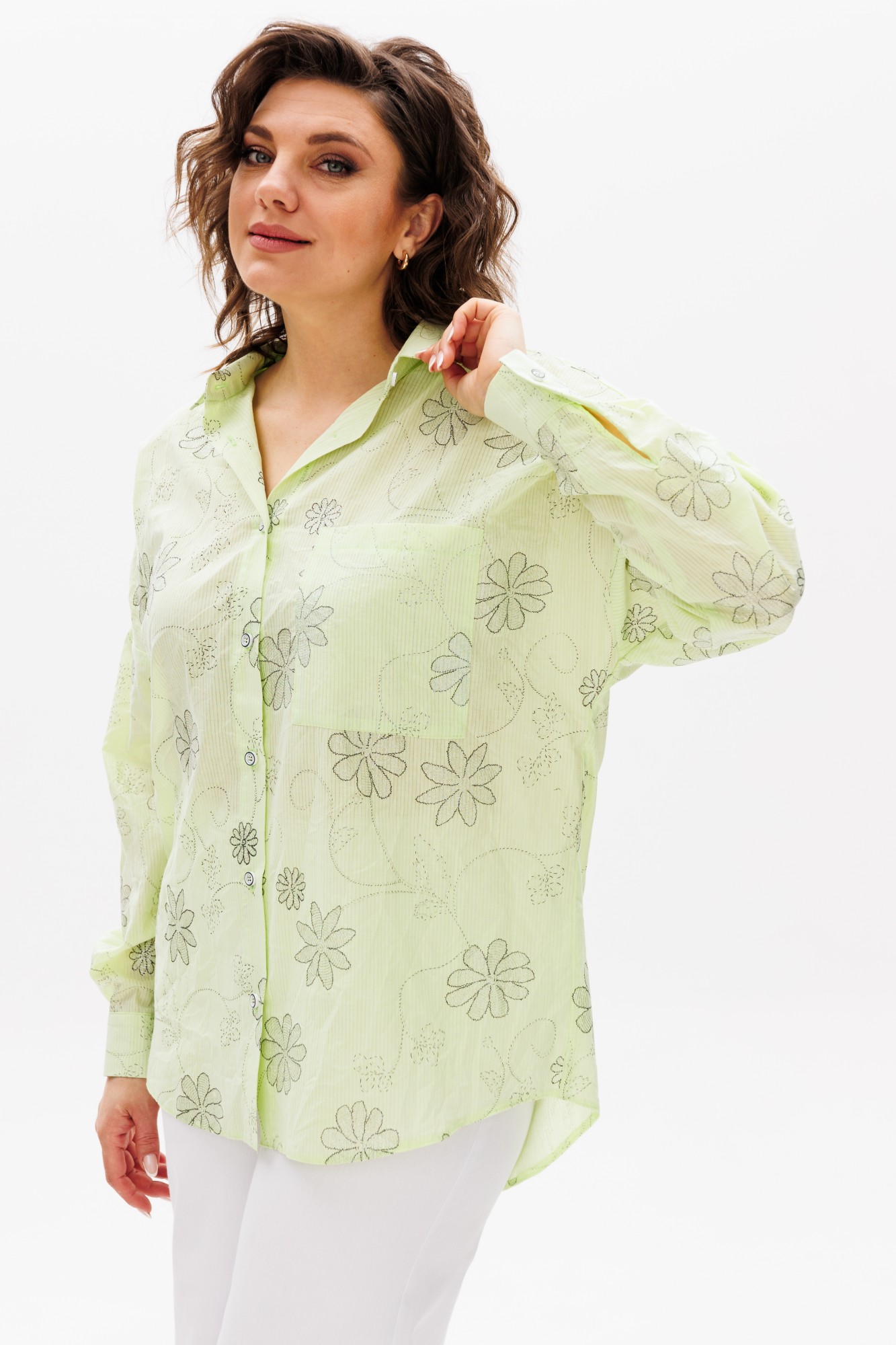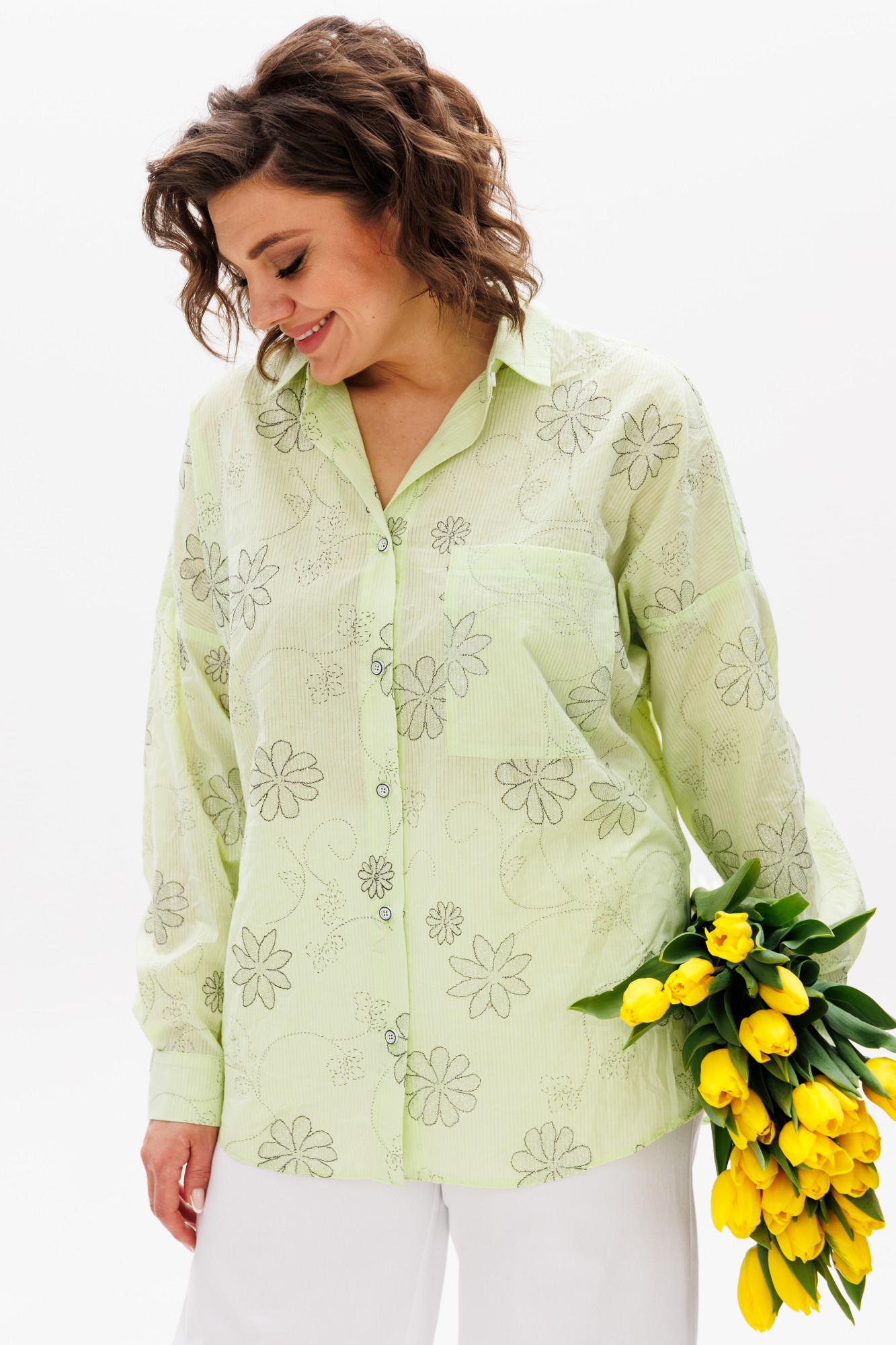 Нежная блузка свободного кроя, которая прекрасно вольется в повседневную жизнь и станет одной из любимых базовых вещей в Вашем гардеробе. Блузка выполнена из хлопковой ткани с имитацией «помятости» в цветок с ненавязчивым блеском. Спущенный длинный рукав, присобранный на манжету с пуговицами. По переду блузка застегивается на пуговицы, украшена накладным карманом. Спинка прямая, воротник классический. Изделие хорошо сочетается как с брюками, так и с юбками. Блузку можно носить как навыпуск, так и заправленной. Светлый цвет придаст Вашему образу женственности и нежности.