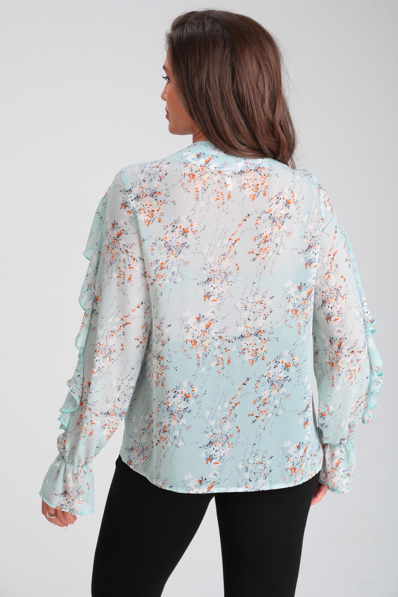 Стильная блузка прямого силуэта из плотного креп-шифона. Изделие с центральной планкой на застежку петли пуговицы по полочке и воланами вдоль планки. ГорловинаV-образной формы. Рукав втачной с центральным швом и со сборкой на эластичную ленту в 8см от края рукава. Спинка изделия цельная.