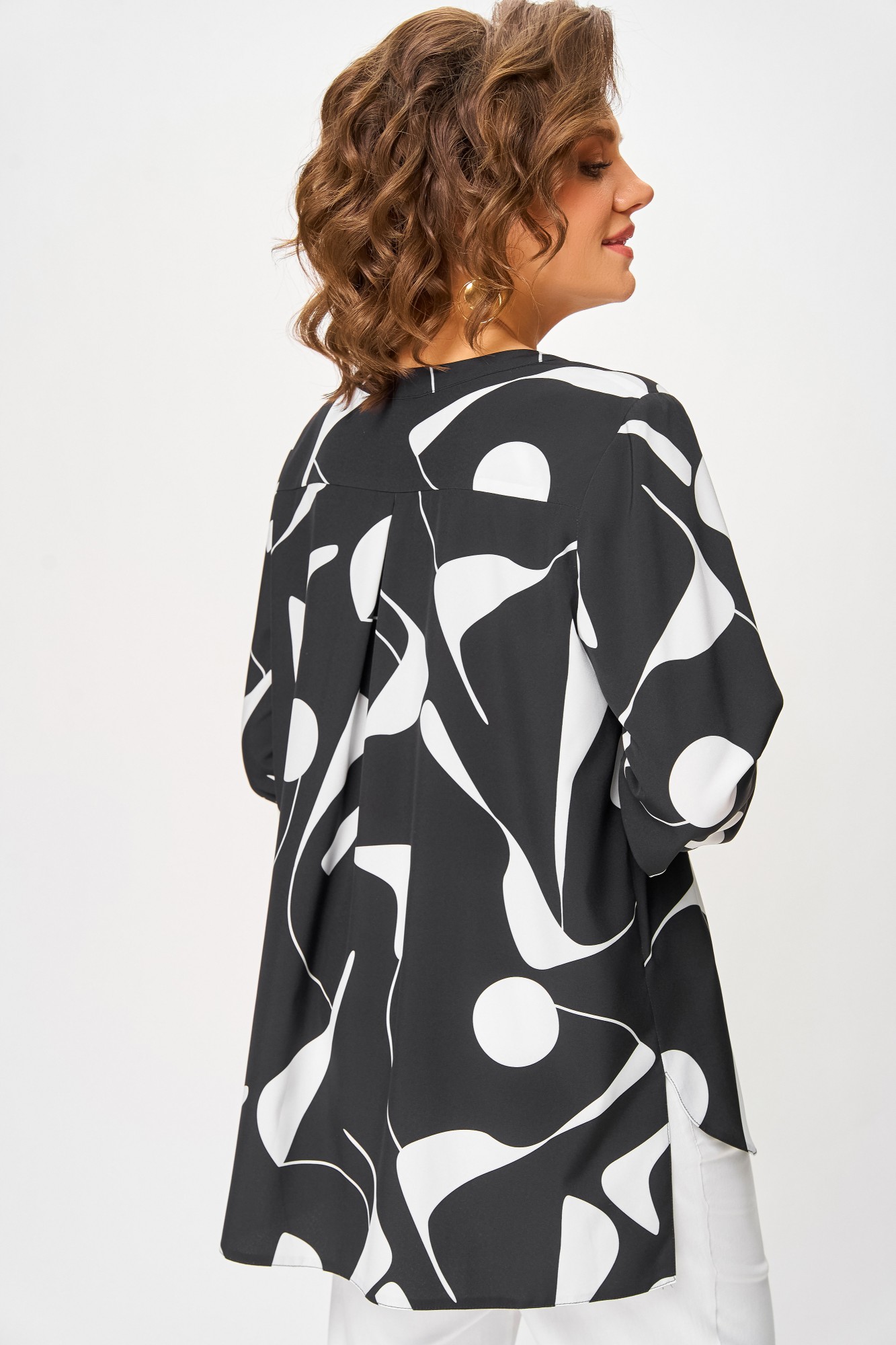 Блузка женская свободного силуэта, выполнена из вискозной ткани. По полочке нагрудные вытачки и фигурная планка до талии с застёжкой на 3 петли и 3 декоративные пуговицы, в низу под планкой, на полочке заложена односторонняя складка. Спинка с отрезной кокеткой и бантовой складкой. Горловина округлой формы с притачной стойкой и V-образным вырезом по планке. Рукав втачной, одношовный внизу со сборкой и манжетой, которая застёгивается на петлю и пуговицу. Низ полочки закруглённой формы, низ спинки прямой и длинее