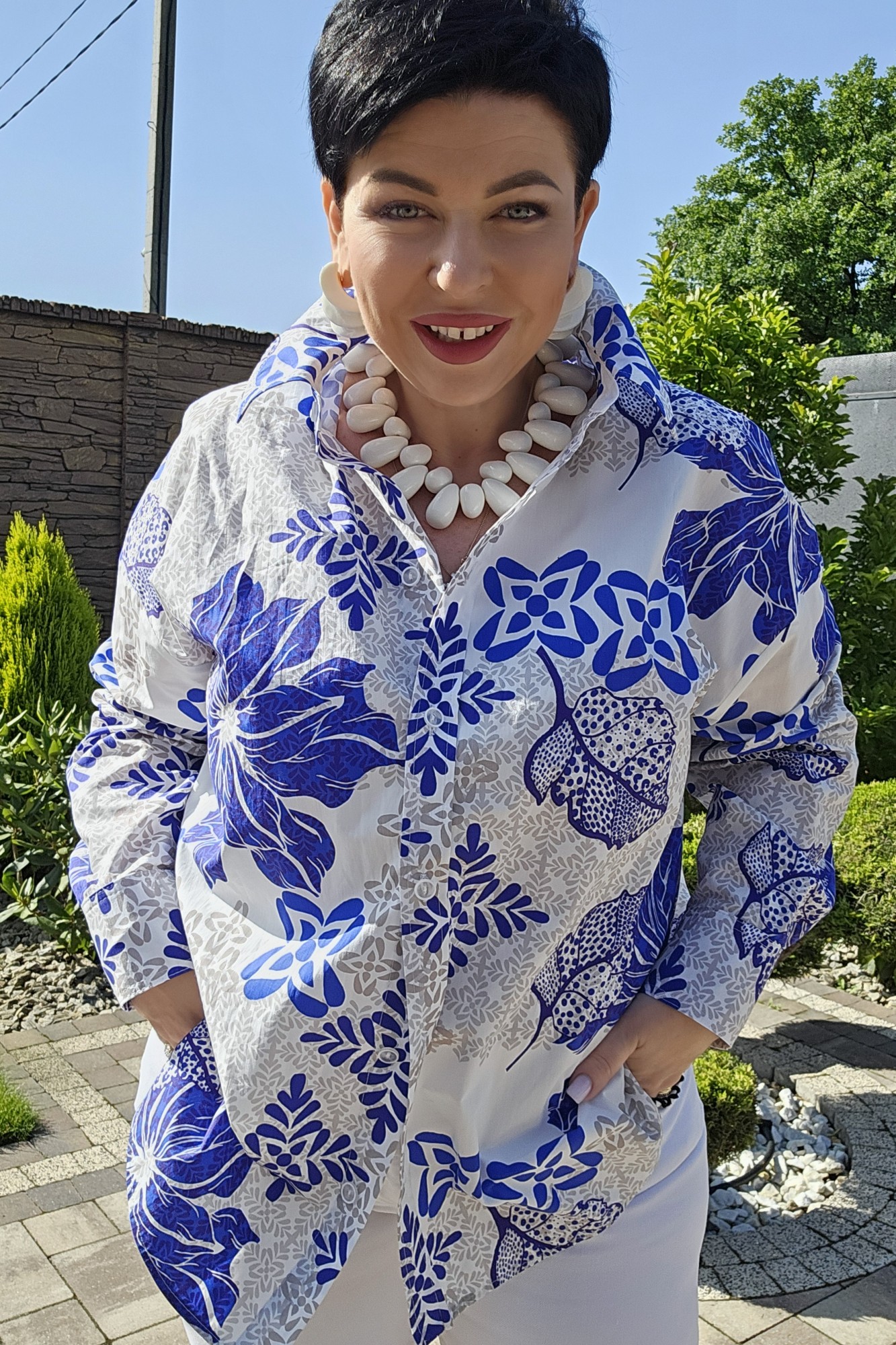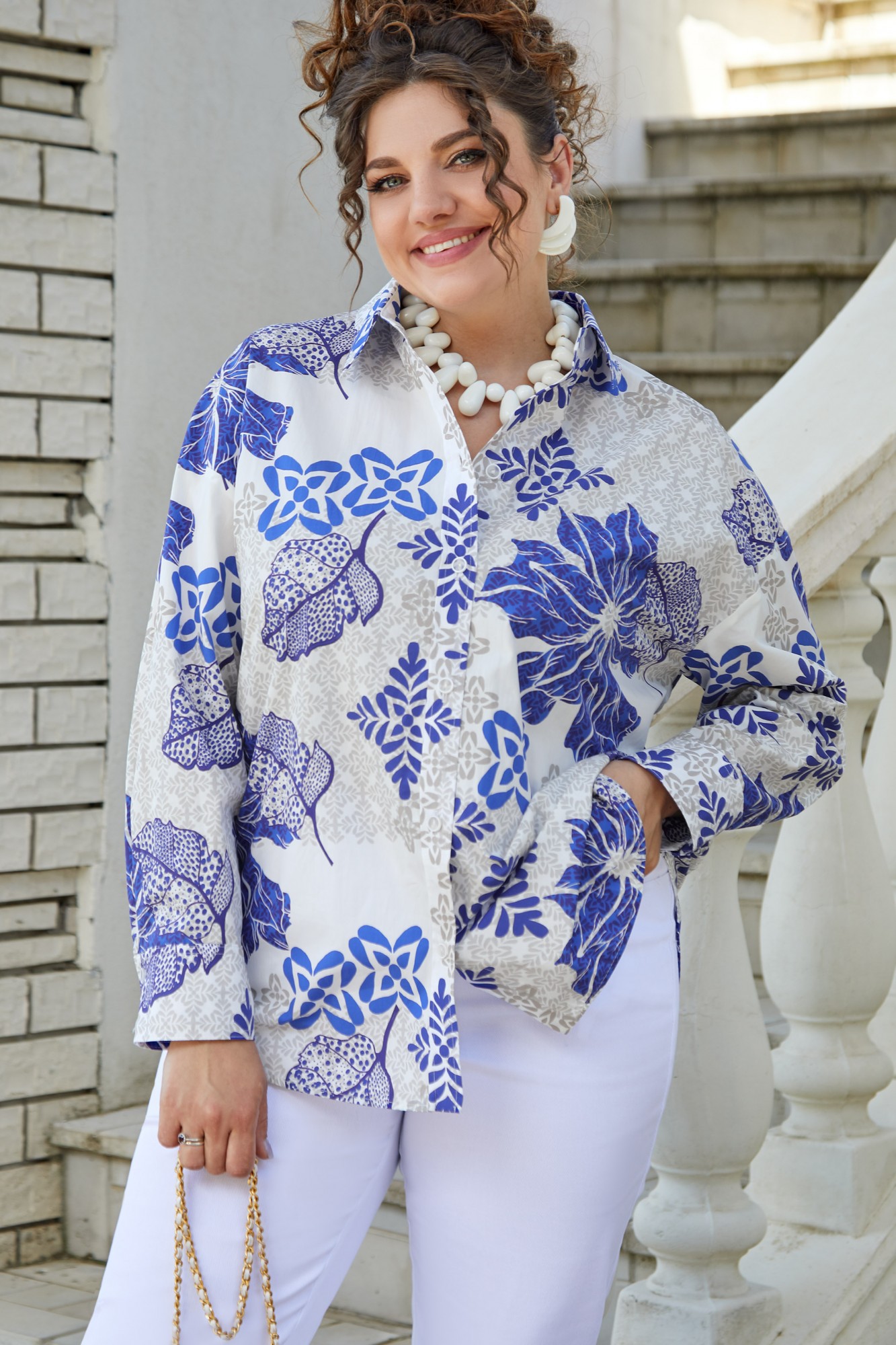 Безумно красивая и стильная блузка с акцентом в виде яркого принта - идеальный вариант для тех, кто любит привлекать внимание. Данная модель станет отличным вариантом как для работы в офисе, так и для торжественных мероприятий. Блузка «оверсайз» с центральной застёжкой на петли-пуговицы по планке, воротником рубашечного типа. Спинка с притачной кокеткой. Линия плеча в блузке спущенная, рукав втачной с притачной манжетой по низу. Низ в блузке фигурной формы. В качестве декоративного отделочного элемента в блузке – отделочные строчки контрастного цвета.