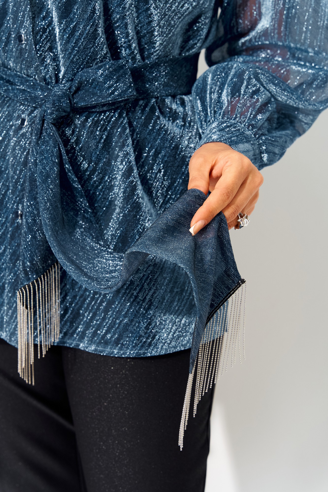 Трендовая блузка из легкой сетчатой ткани c эффектом мерцания станет стильным дополнением вашего гардероба. Ее можно комбинировать с различными элементами гардероба, накинуть поверх платья или топа. Модель выполнена с воротником-стойкой, который добавляет элегантности образу. Застежка центральная на петли и пуговицы. По бокам расположены разрезы. Свободный крой обеспечивает комфорт и подчеркивает женственность. Длинный рукав с манжетами делает ее универсальной для любого сезона, а удлиненный силуэт добавляет изысканности. В комплект входит съёмный пояс с декоративной бахромой, который может служить в виде шарфика и добавить элегантность образу. Изделие идеально подходит для повседневного ношения, офиса или вечернего выхода. Отлично сочетается с базовыми браками из коллекции от бренда «Лилиана».