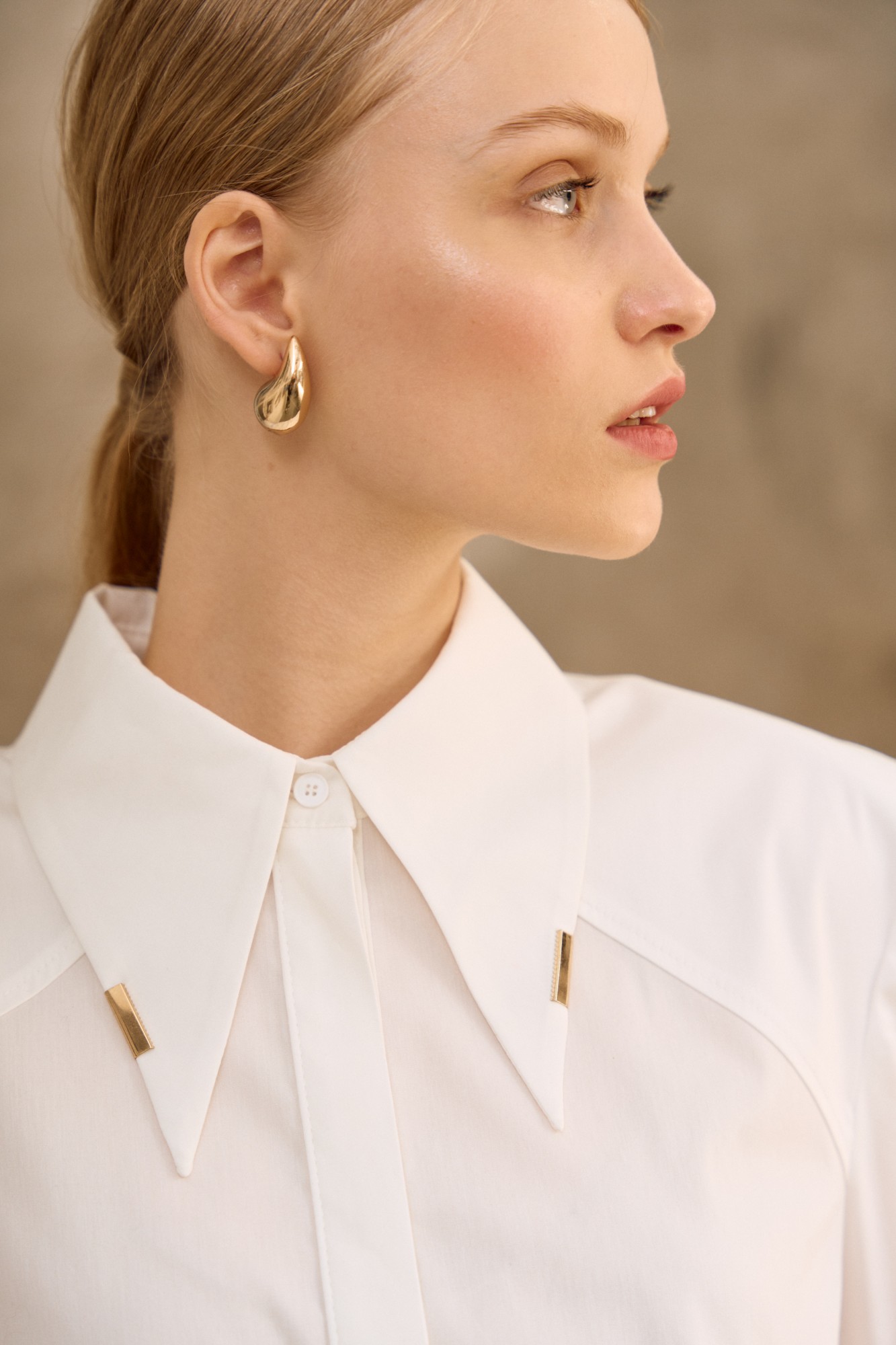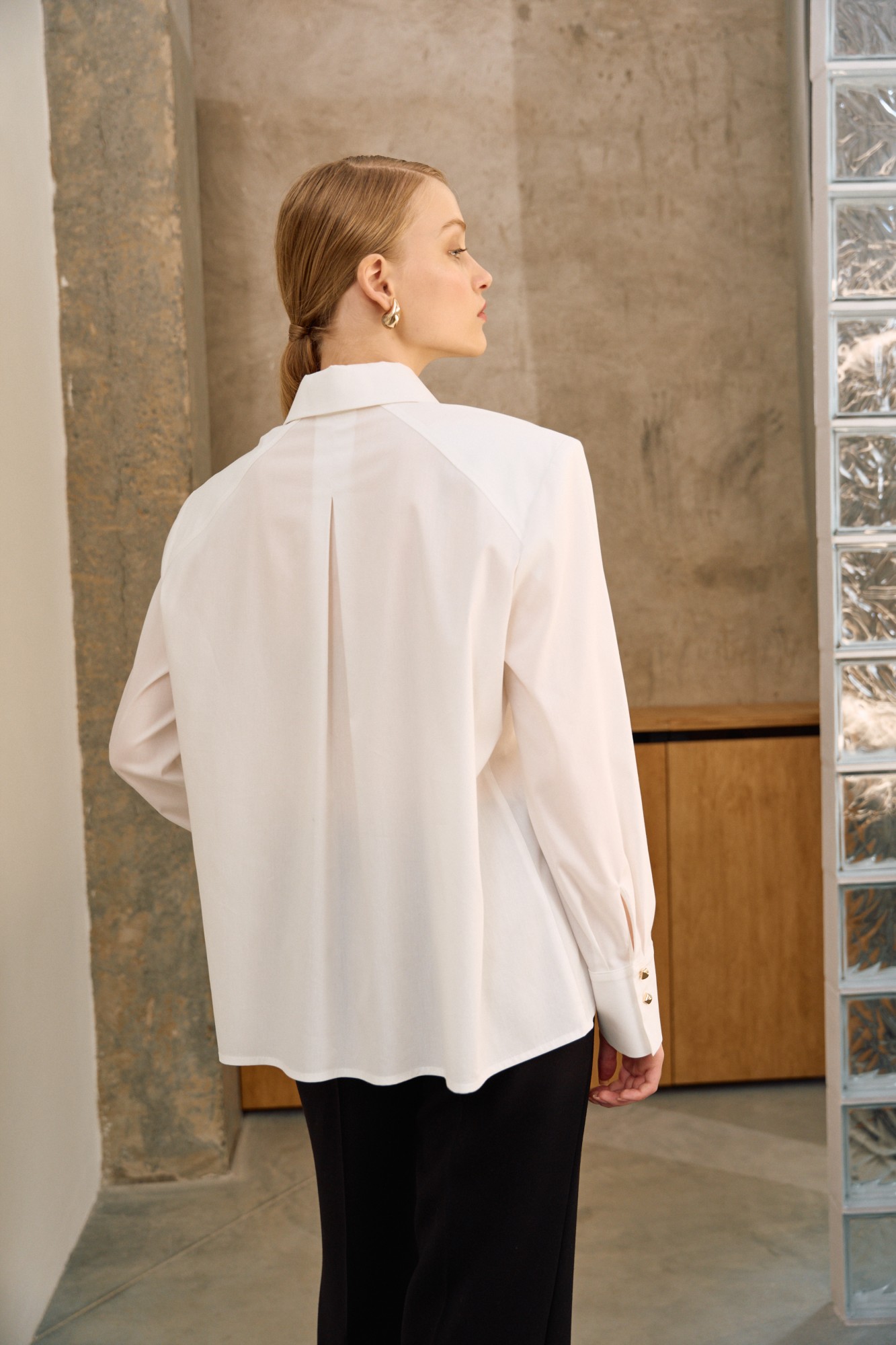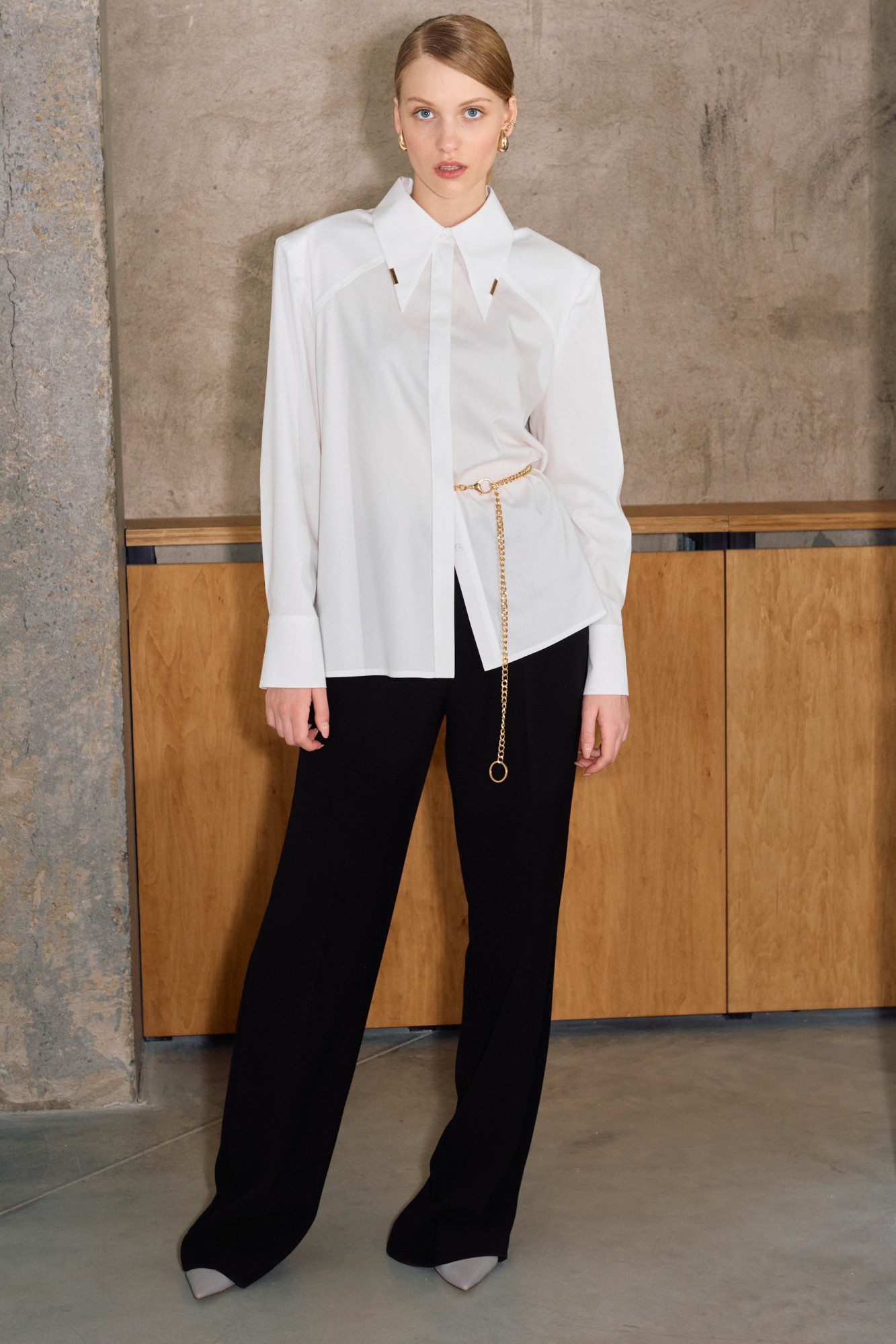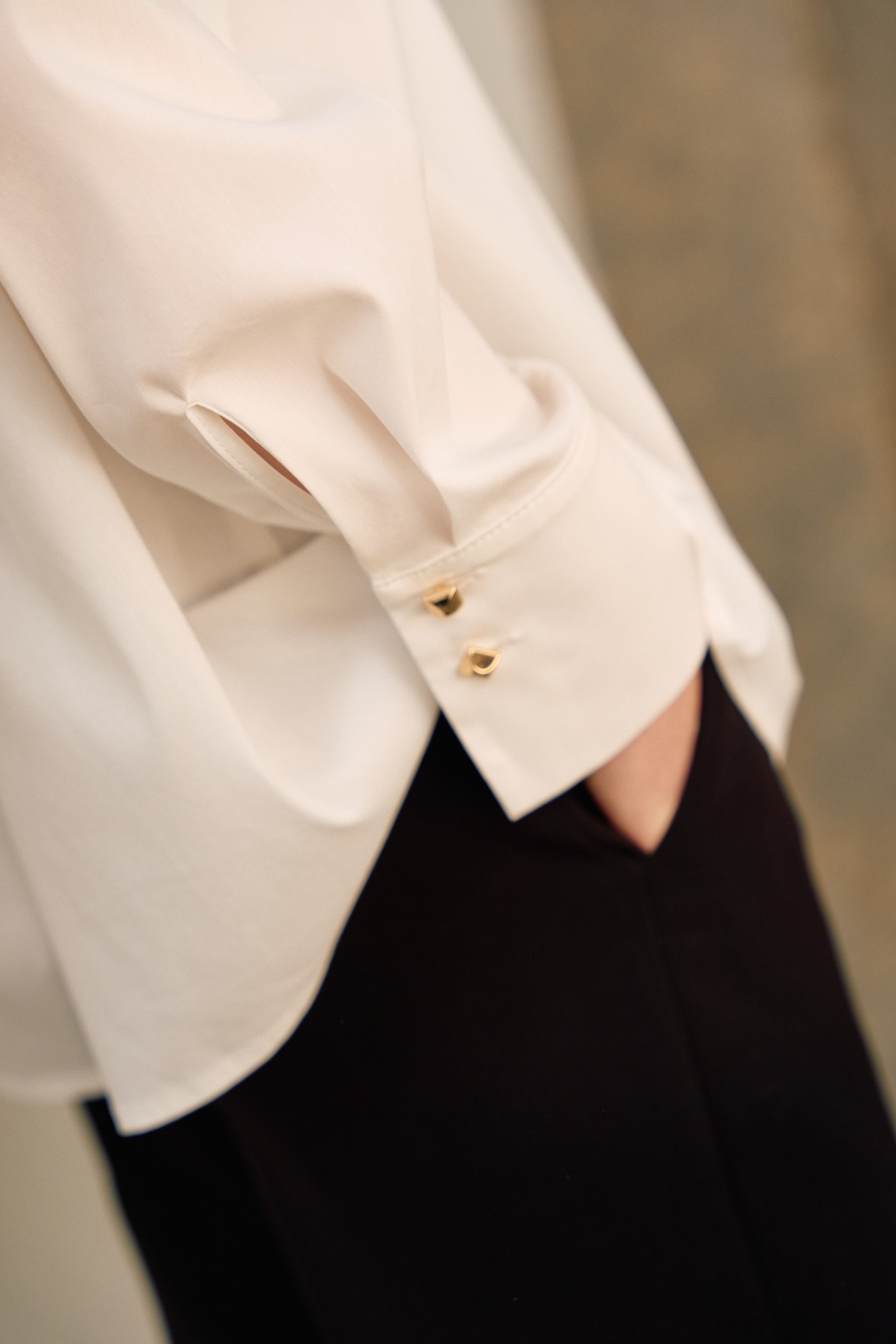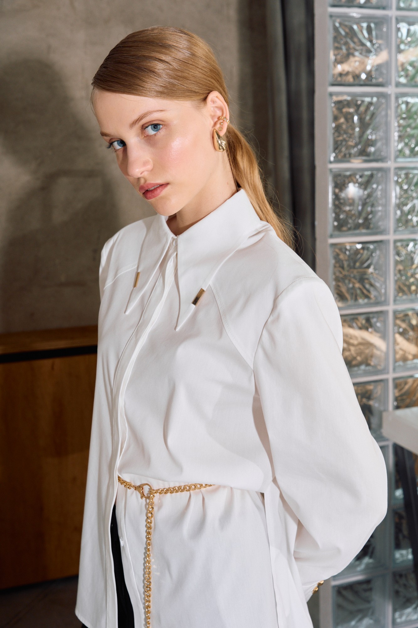 Блуза свободного кроя, прямого силуэта. Линия плеча расширена с плечевой накладкой. Рукав длинный, по низу рукава приточная манжета на застежку петли и пуговицы. Воротник рубашечного кроя с золотыми фиксаторами, застежка на петли и пуговицы. По переду кокетка по косой, в левом боковом шве разрез. По спинке фигурная кокетка, по центру встречная вкладка. В комплектацию входит металлический золотой пояс с застежкой на фиксатор. Ярким дополнительным акцентом является съемный бант, который также можно использовать как пояс.