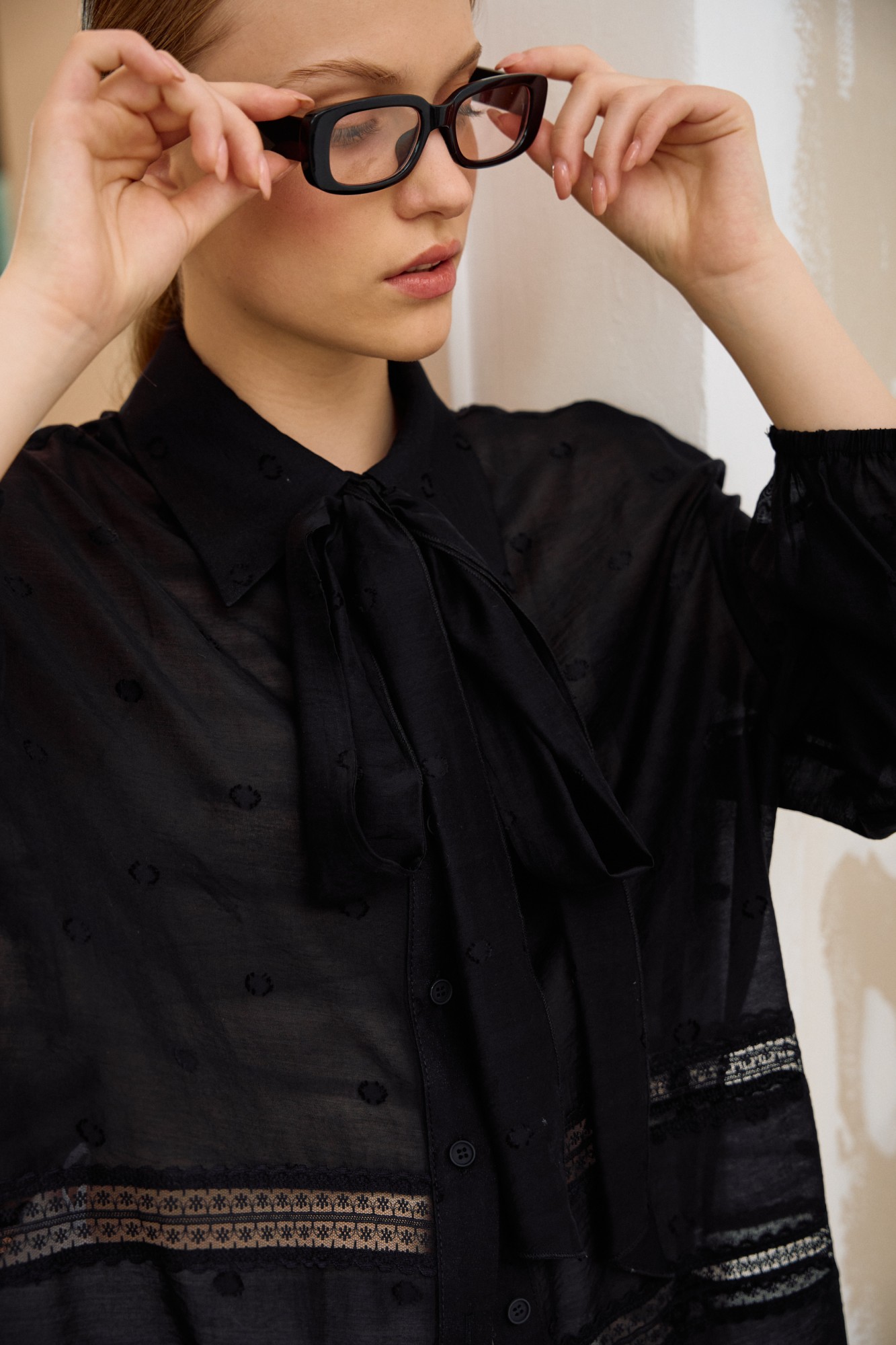 Блуза свободного кроя, прямого силуэта. Линия плеча спущена, по низу рукава приточная манжета на застежку петли и пуговицы. Воротник рубашечного кроя, застежка на петли и пуговицы. По переду и спинке вшито кружево. Ярким дополнительным акцентом является съемный бант, который также можно использовать как пояс.