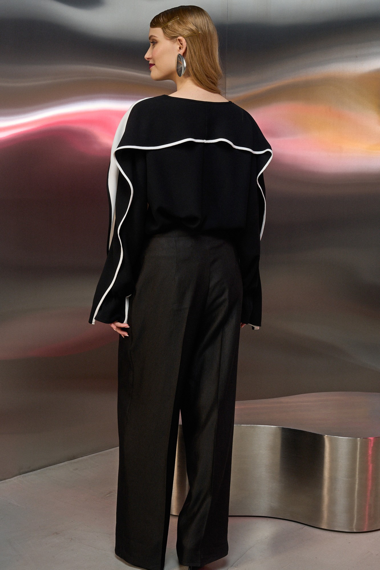Блуза свободного кроя, выполнена из блузочной ткани в двух цветах. Передняя часть блузки из белой ткани, спинка из черной, по воланам окантовка в контраст. Рукав длинный, крой летучая мышь, по низу рукава резинка. По центральной части рукава и плечевому шву вставлены воланы. По горловине и переду блузы волан переходит в завязку. В Y-образную горловину также вставлен волан.