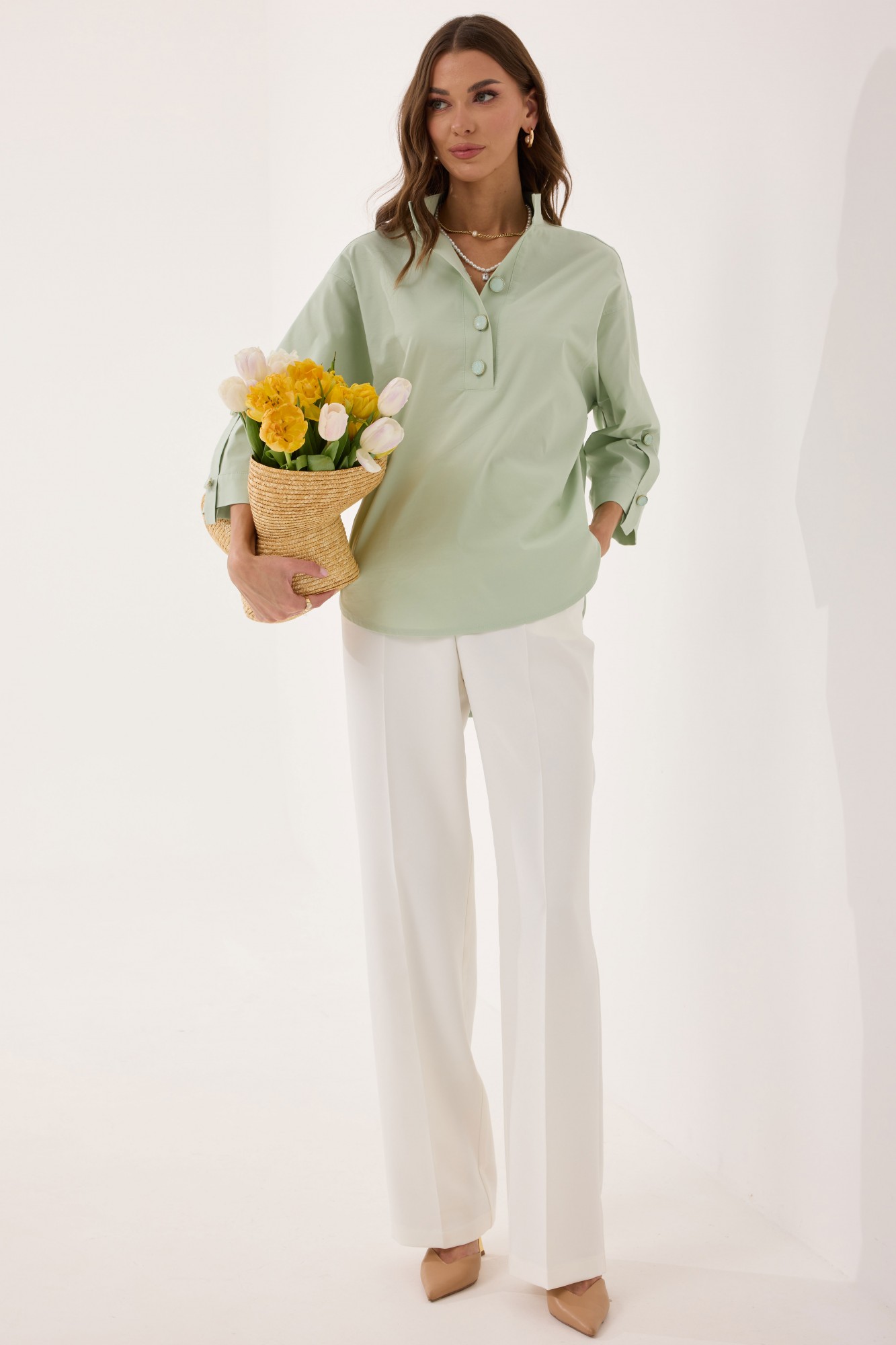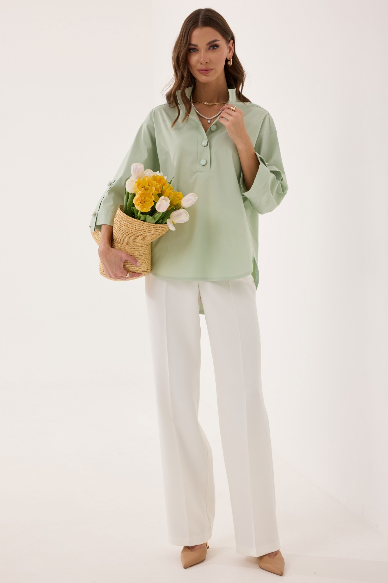 Стильная блузка из хлопковой ткани свободного силуэта с фигурным низом. Воротник - стойка. Перед блузки с притачной планкой с застежкой на петли и контрастные пуговицы. Спинка с кокеткой, нашивной декоративной пластинкой и диагональным срезом, переходящим в разрез понизу. Рукав реглан длиной 3/4, с притачной манжетой с декоративной патой и пуговицами понизу.