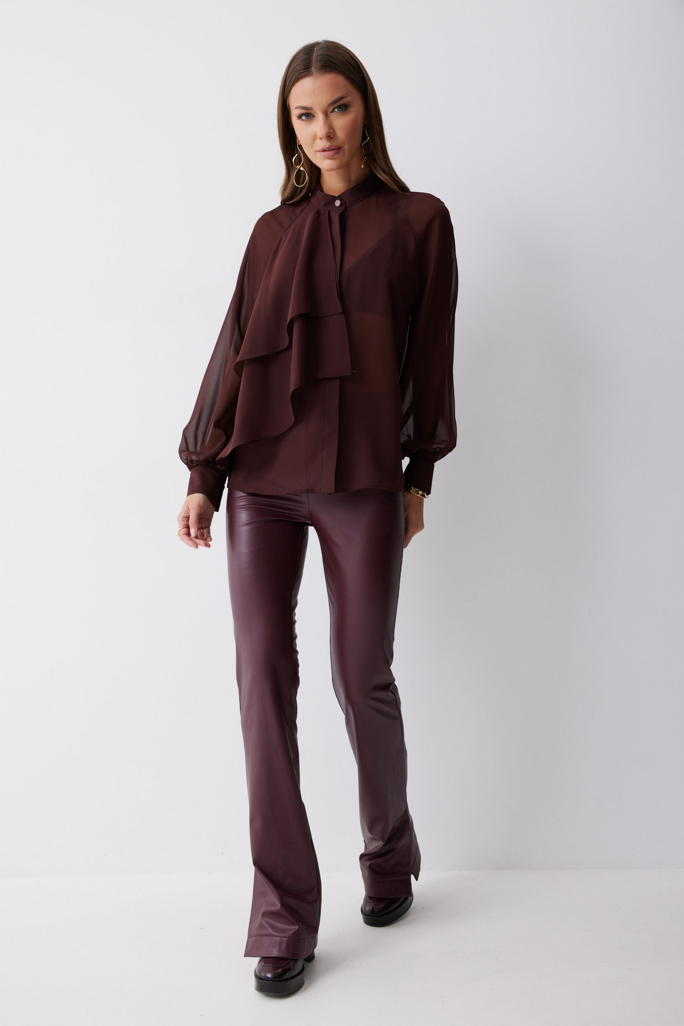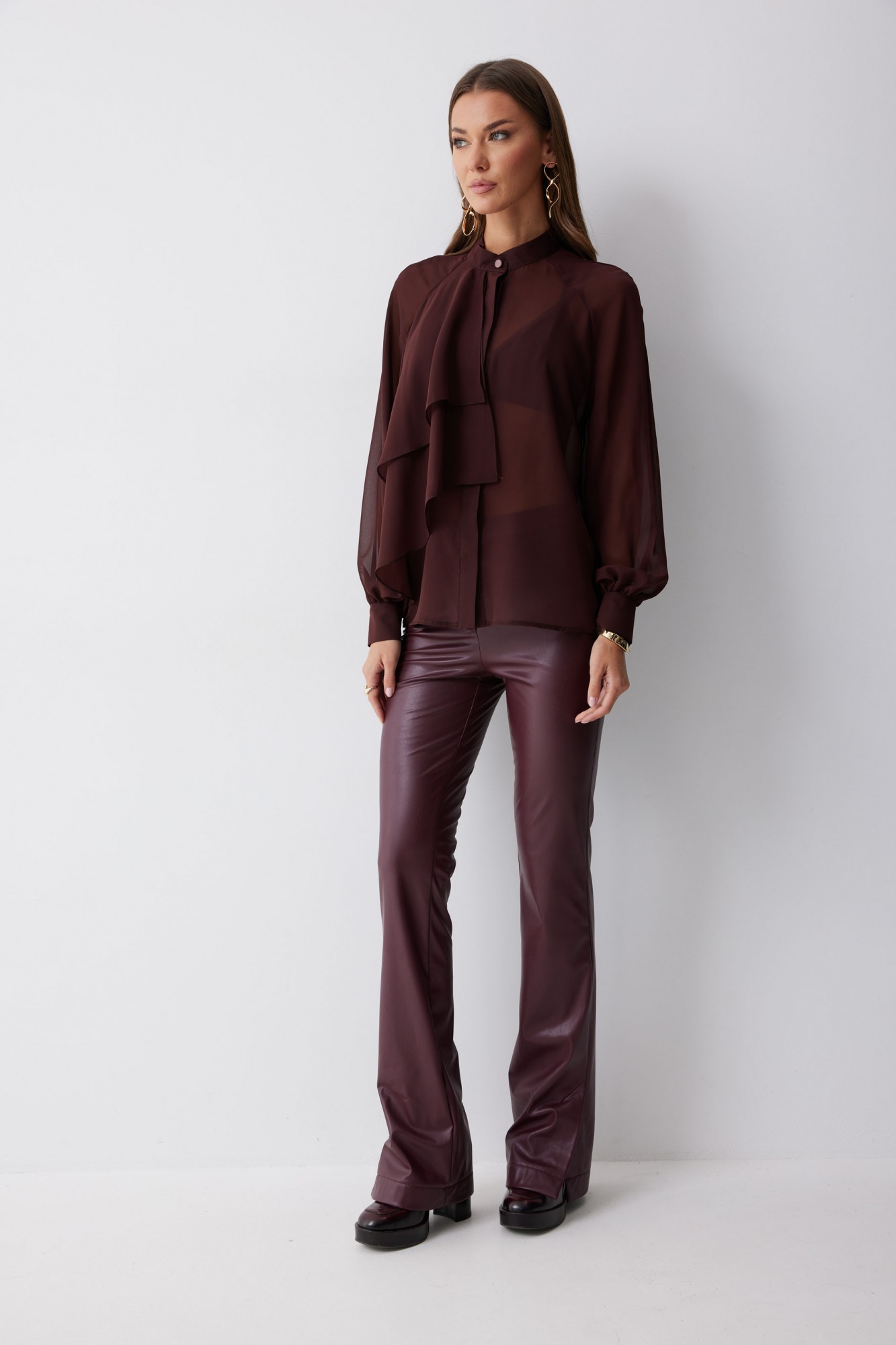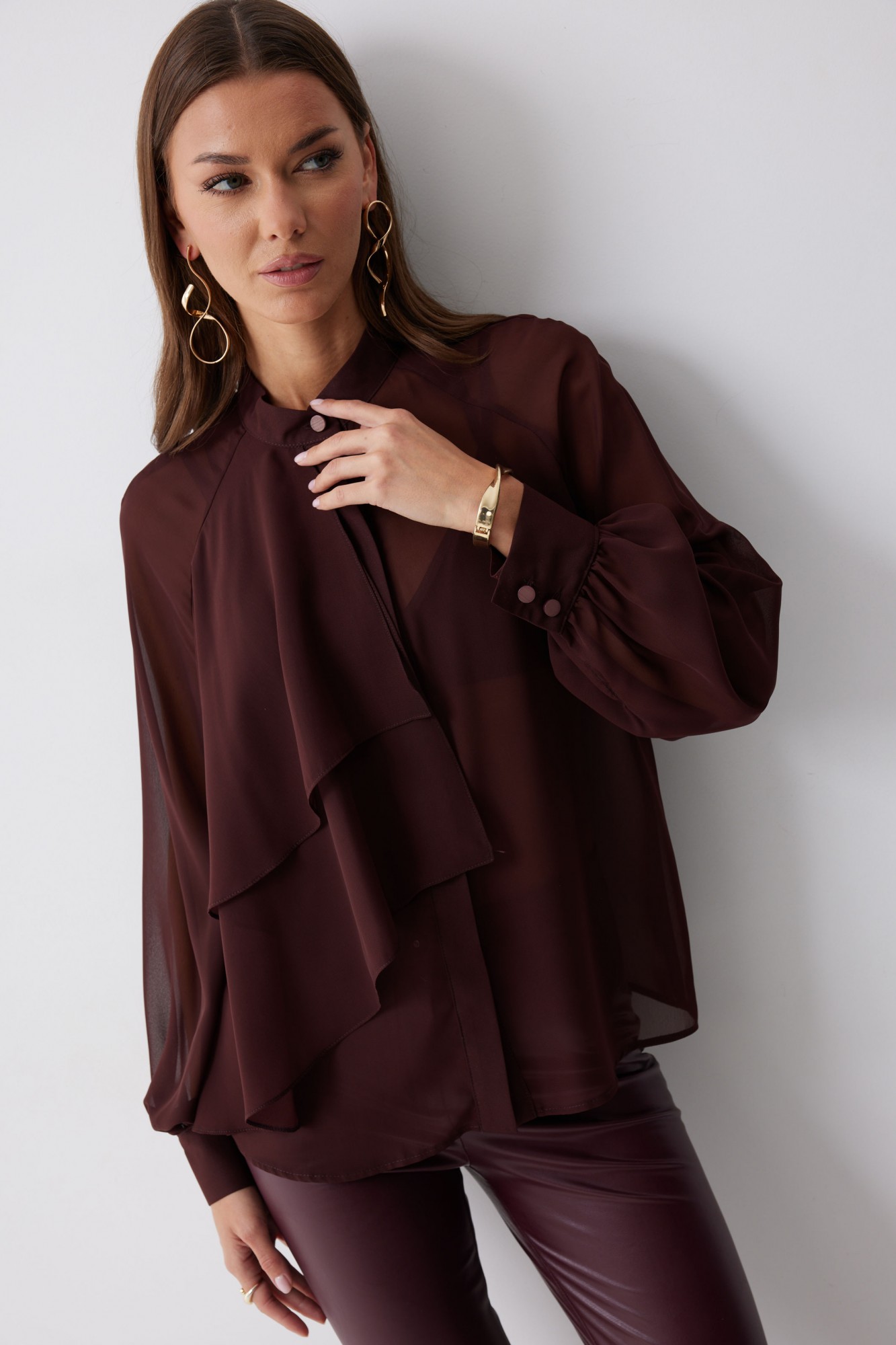Стильная блузка полуприлегающего силуэта. Рукав – реглан, по низу на манжете со сборкой, застежка на петли и пуговицы. В правую половинку переда, в шов, вставлены декоративные воланы. Воротник-стойка, по центру планка с застежкой на петли и пуговицы.