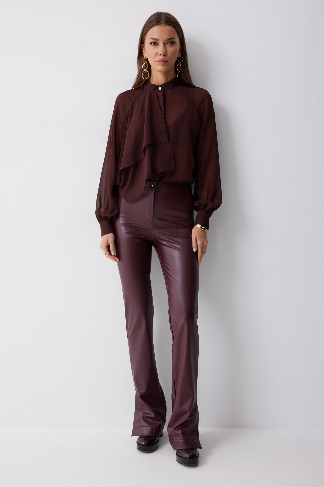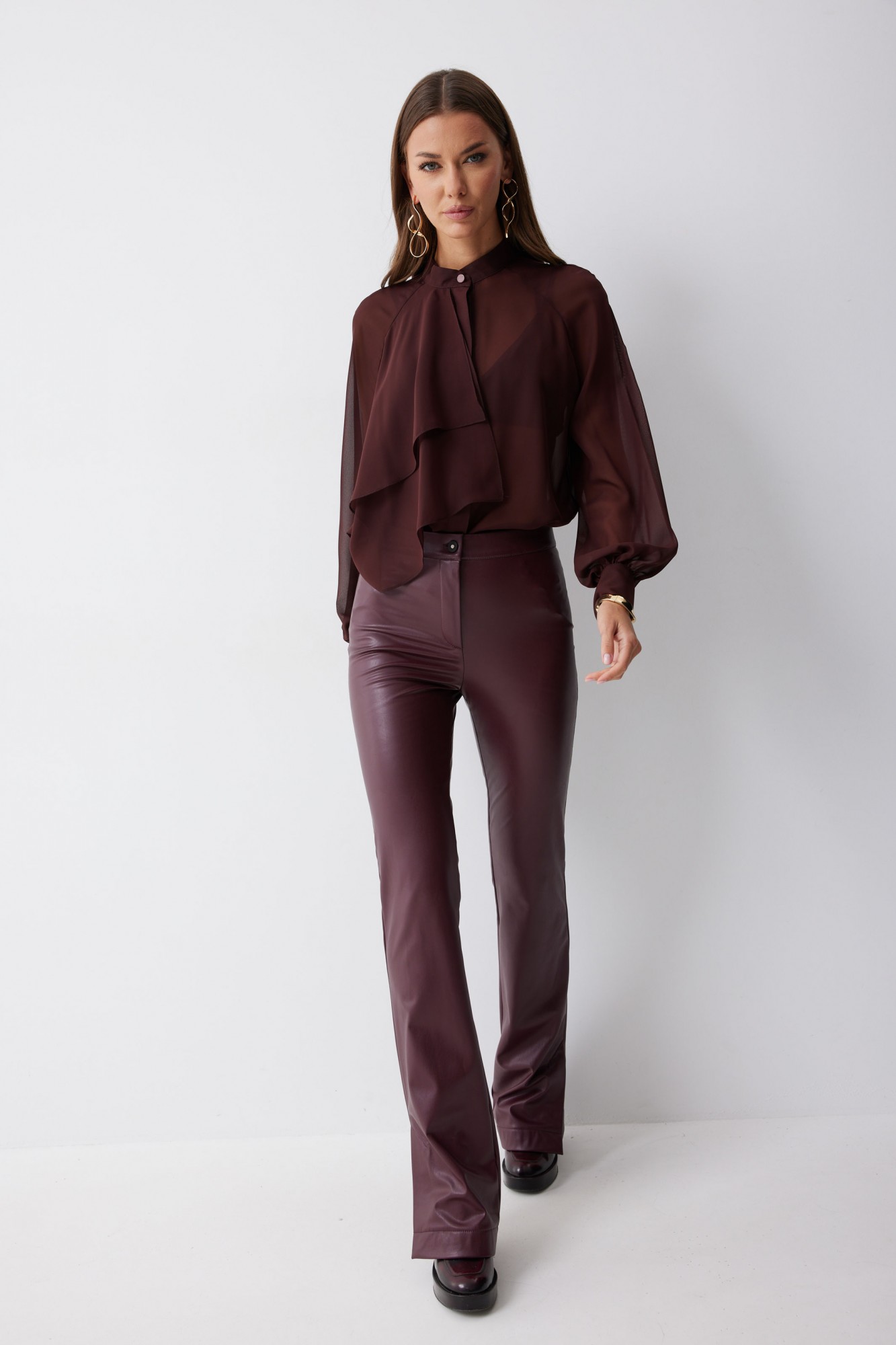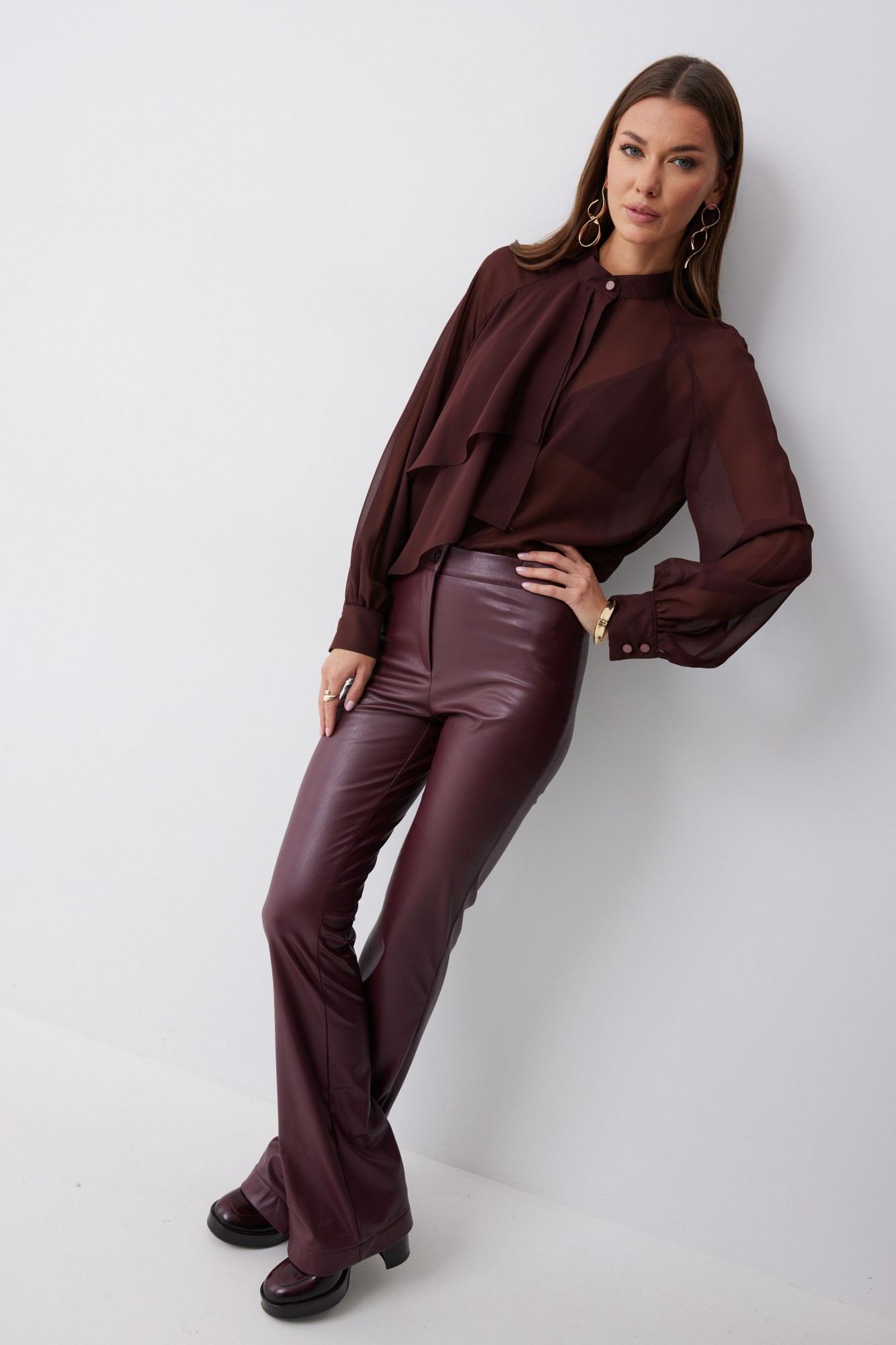 Стильная блузка полуприлегающего силуэта. Рукав – реглан, по низу на манжете со сборкой, застежка на петли и пуговицы. В правую половинку переда, в шов, вставлены декоративные воланы. Воротник-стойка, по центру планка с застежкой на петли и пуговицы.