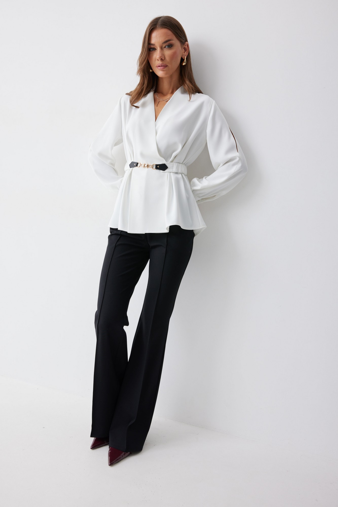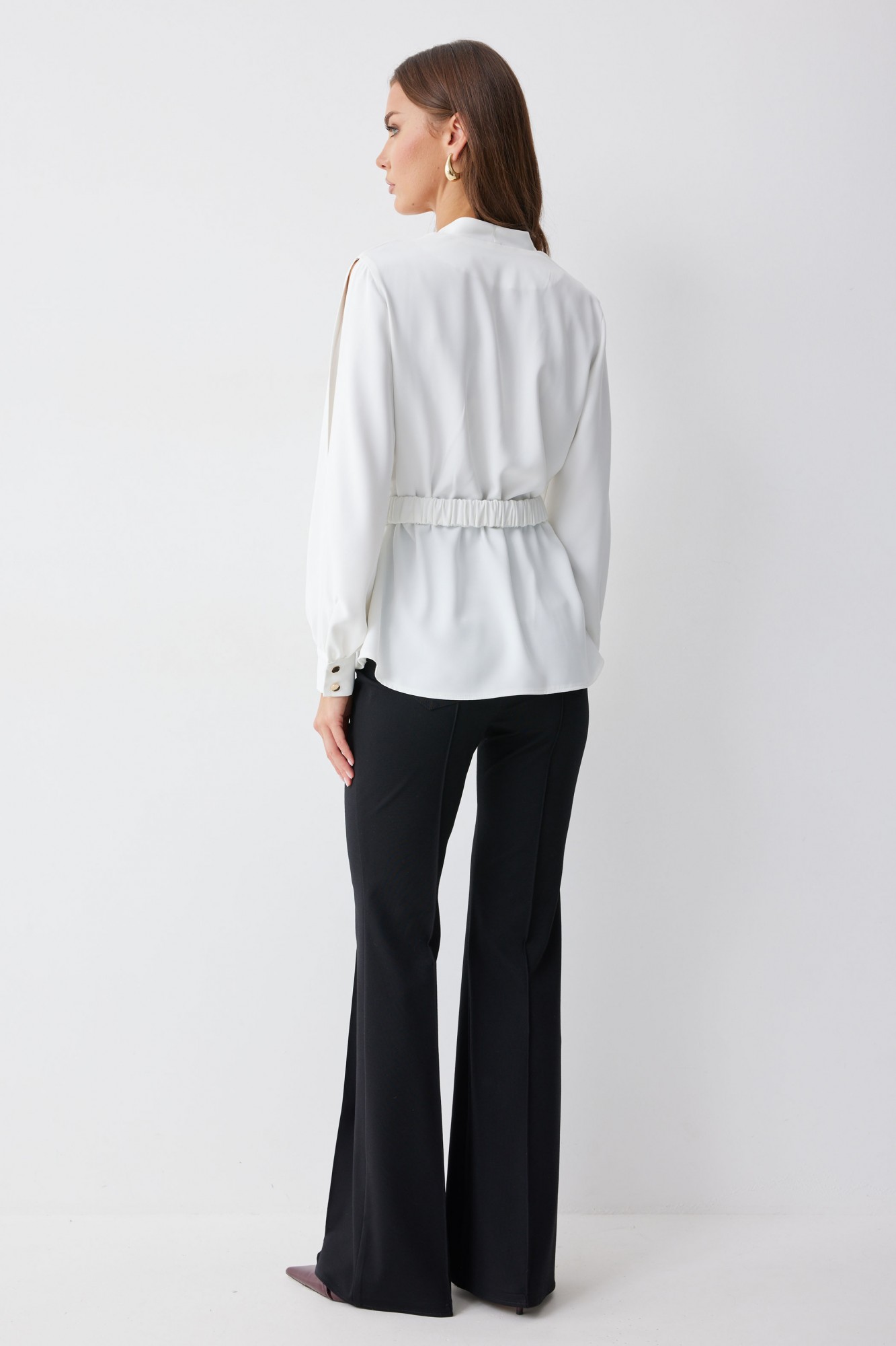 Блузка полуприлегающего силуэта расширенная книзу из струящейся ткани. Рукав втачной, с разрезом в области плеча, по низу манжета с застежкой на петли и пуговицы. Блузка отрезная по линии талии. По переду от подреза вверх и вниз декоративные складки. На спинке в подрез вставлена резинка. В комплект входит съемный ремень. Обращаем ваше внимание, что фурнитура может отличаться от фото.