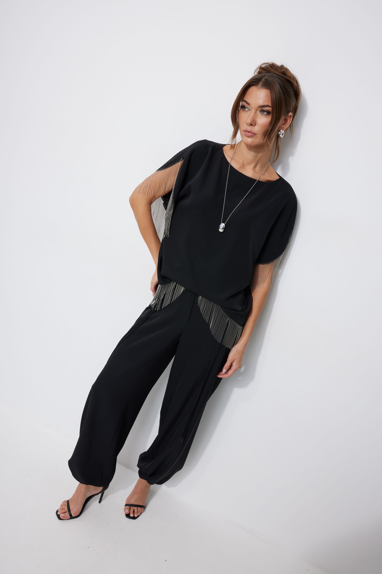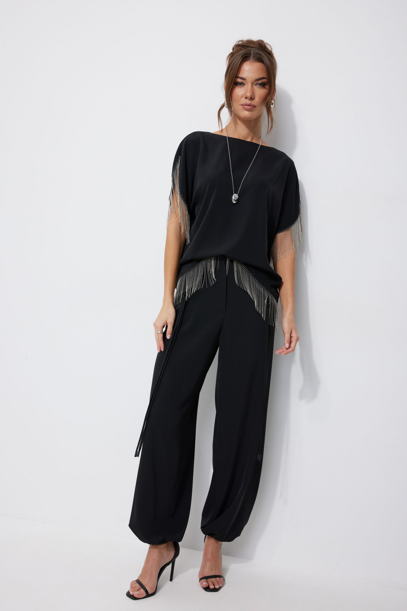Блузка прямого силуэта из струящейся ткани. Горловина-лодочка, на спинке застежка на петлю и пуговицу. Рукав цельнокроеный с фигурным вырезом. По низу рукава и низу изделия декоративная тесьма. Обращаем ваше внимание, что фурнитура может отличаться от фото.