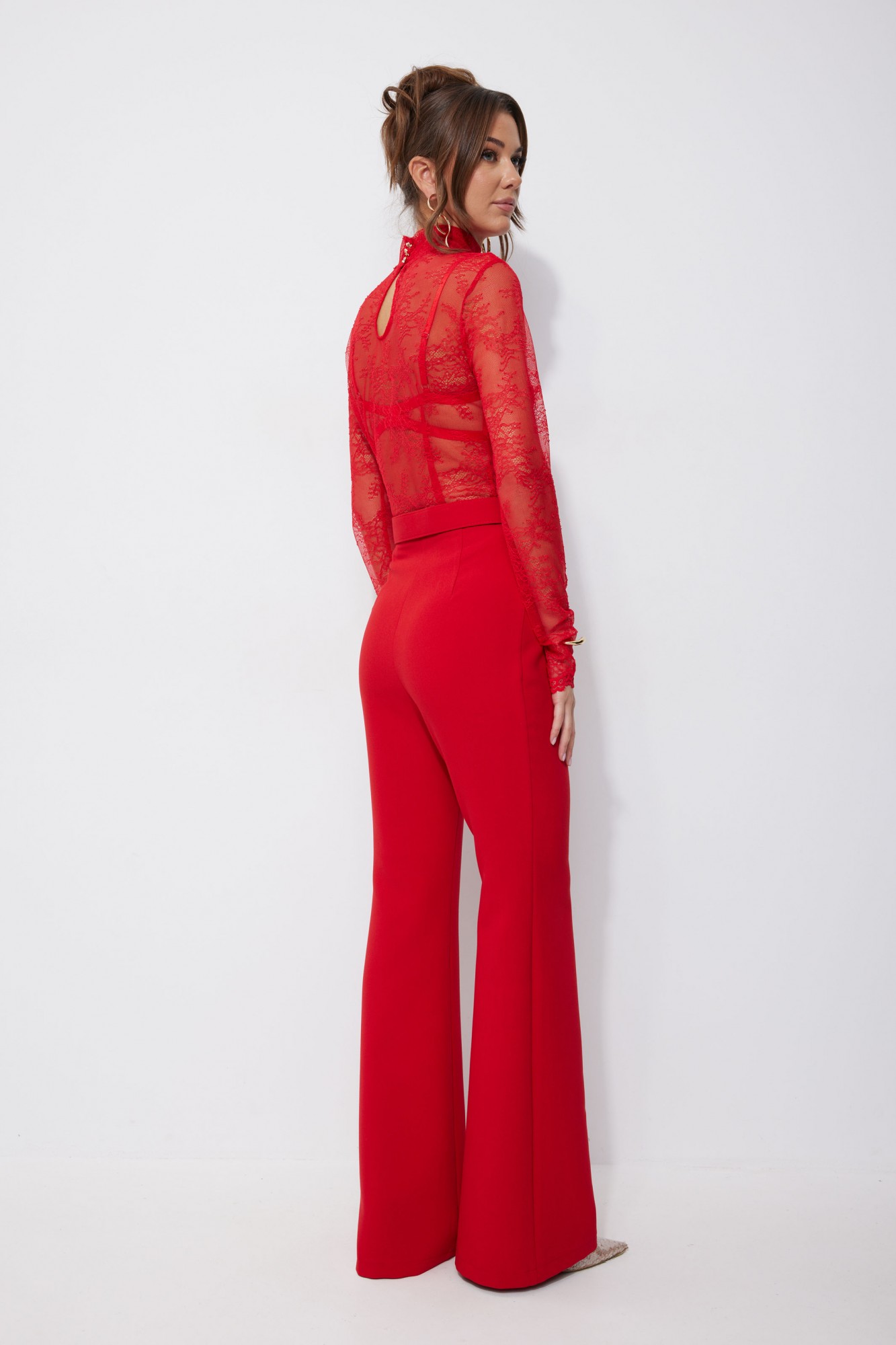 Блузка полуприлегающего силуэта из кружева. Горловина –стойка, на спинке застежка на петли и пуговицы и фигурный вырез. Рукав втачной. На спинке таллиевые вытачки. Обращаем ваше внимание, что фурнитура может отличаться от фото.