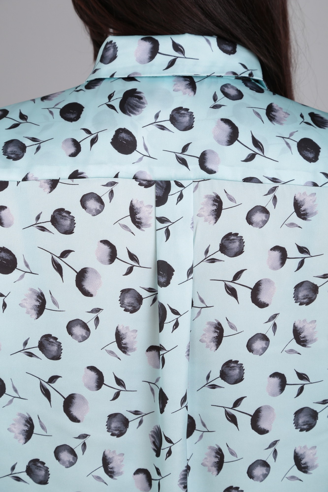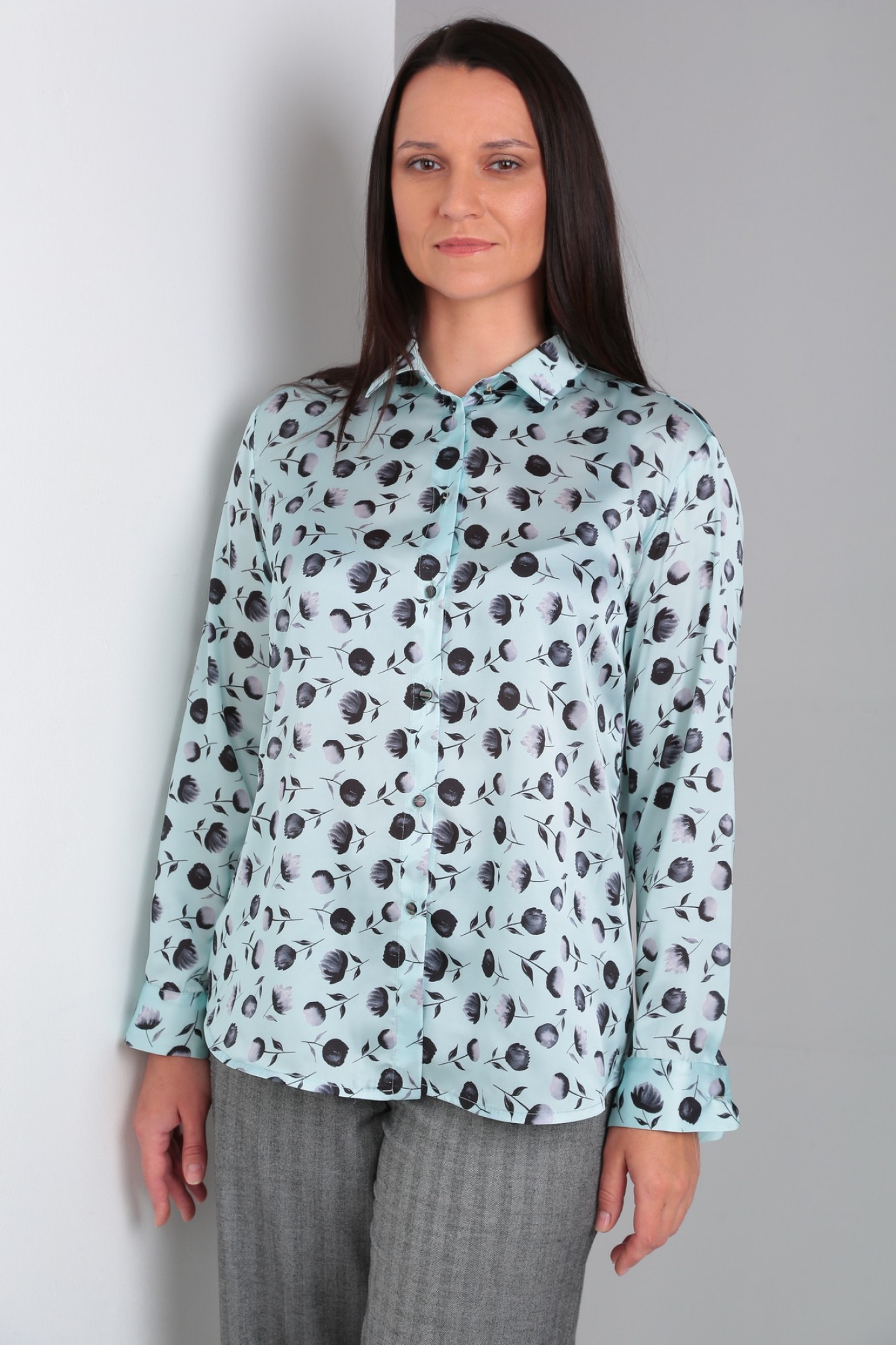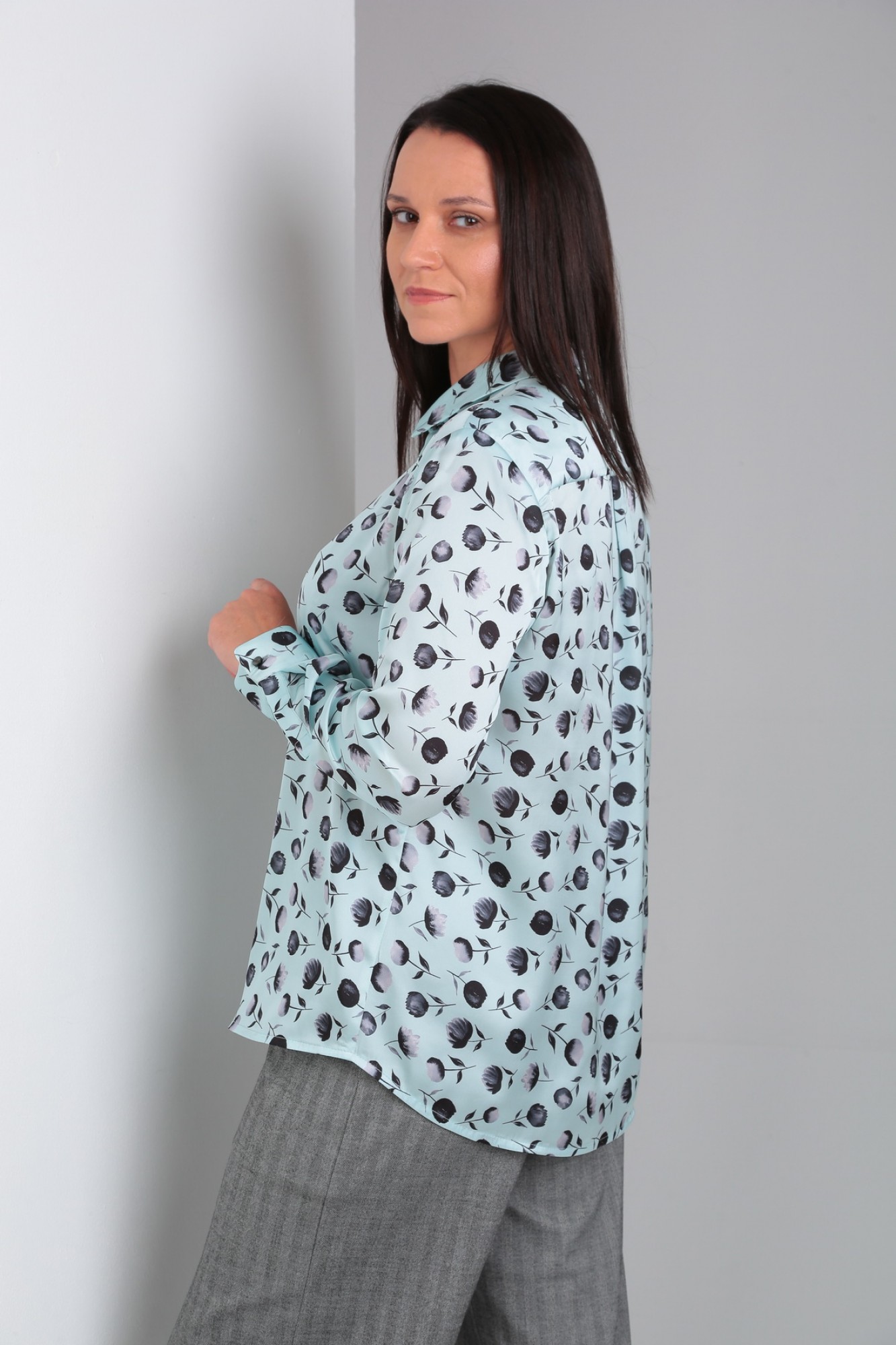 Рубашка свободного силуэта с длинным рукавом. По переду застежка на петли-пуговицы. В верхней части спинки кокетка. Воротник со стойкой, по низу рукава отрезная манжета.