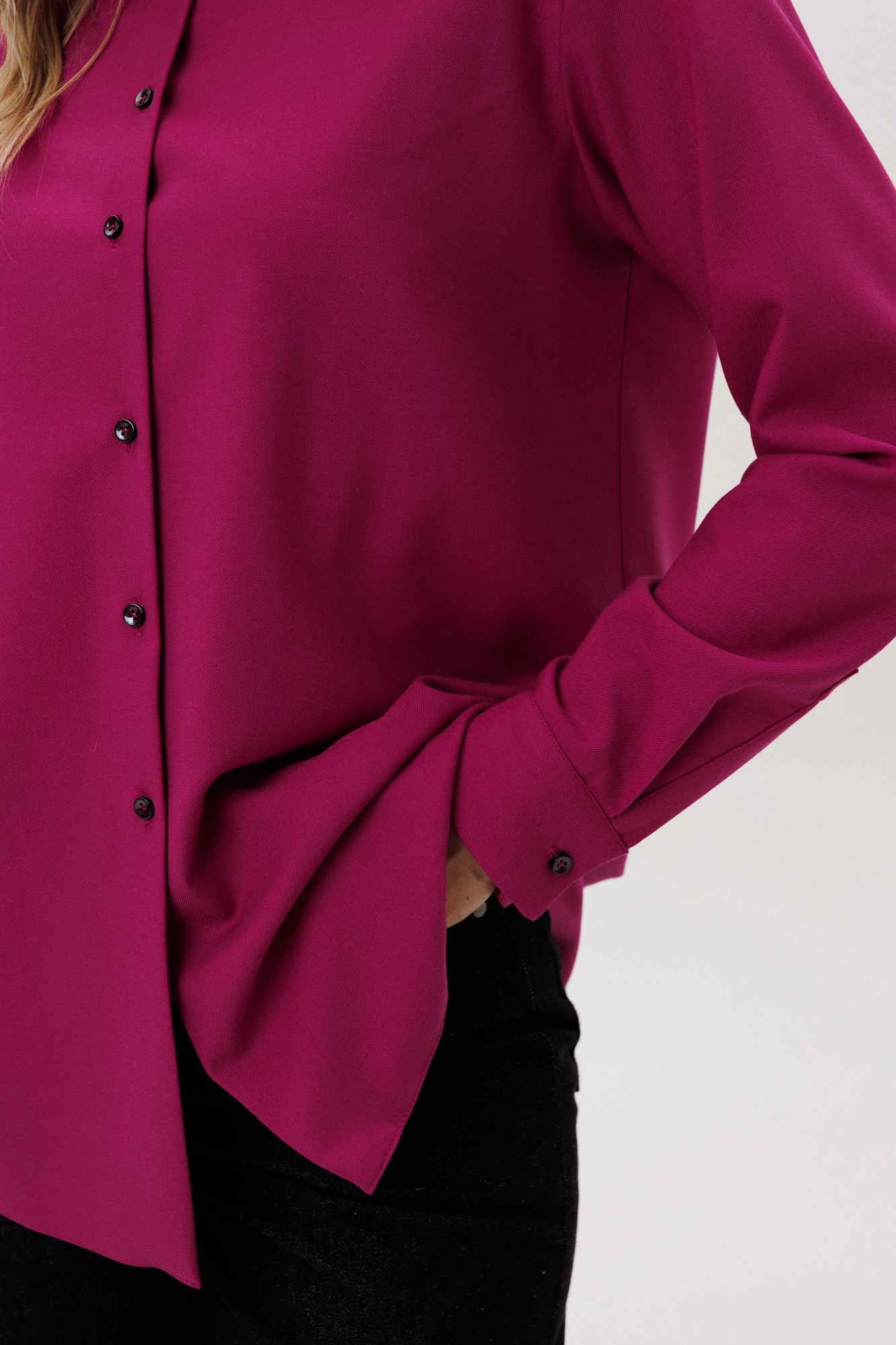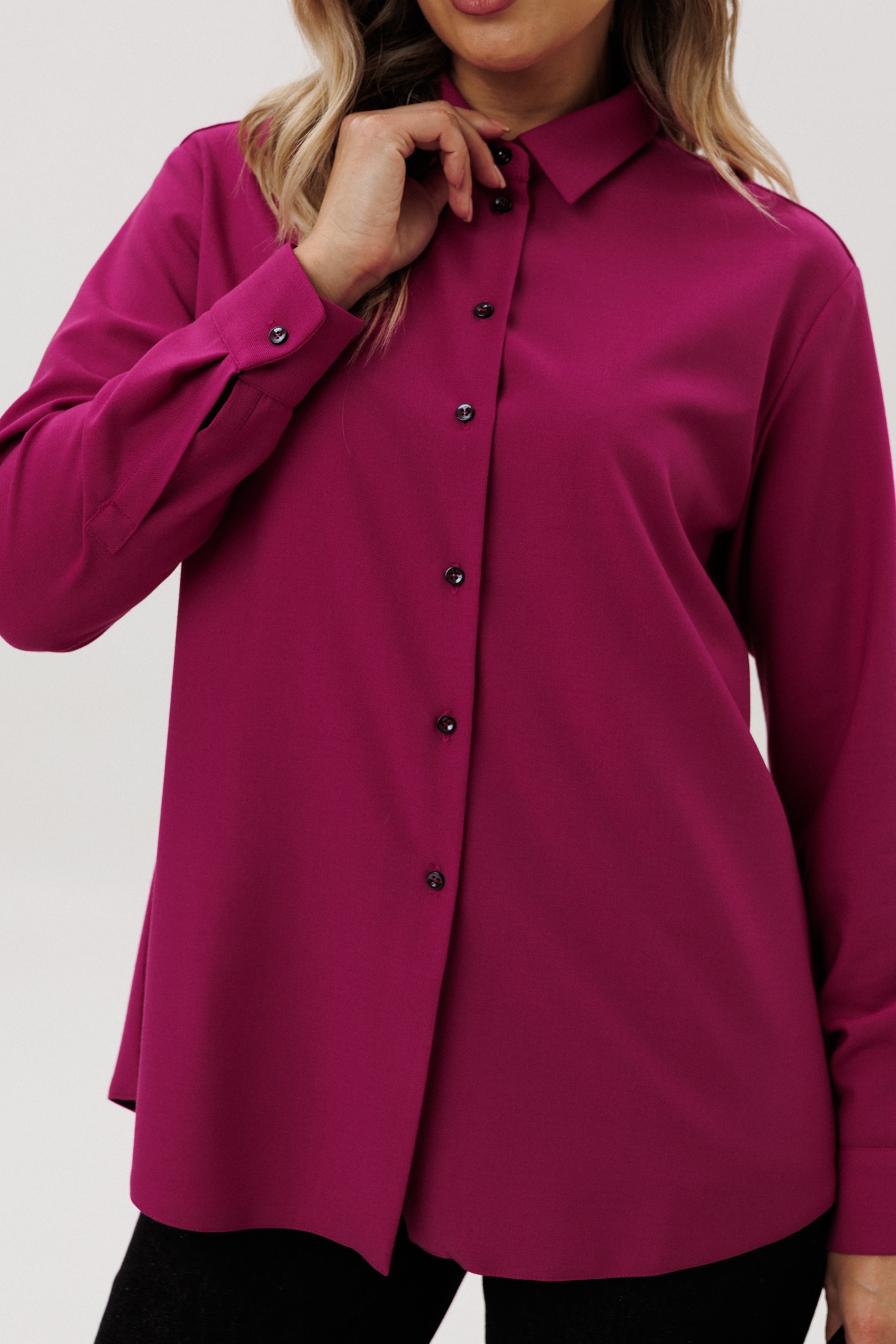 Рубашка прямого силуэта из полушерстяной, тонкой ткани. Воротник втачной со стойко, рукав втачной с манжетой. Застежка на петли-пуговицы.