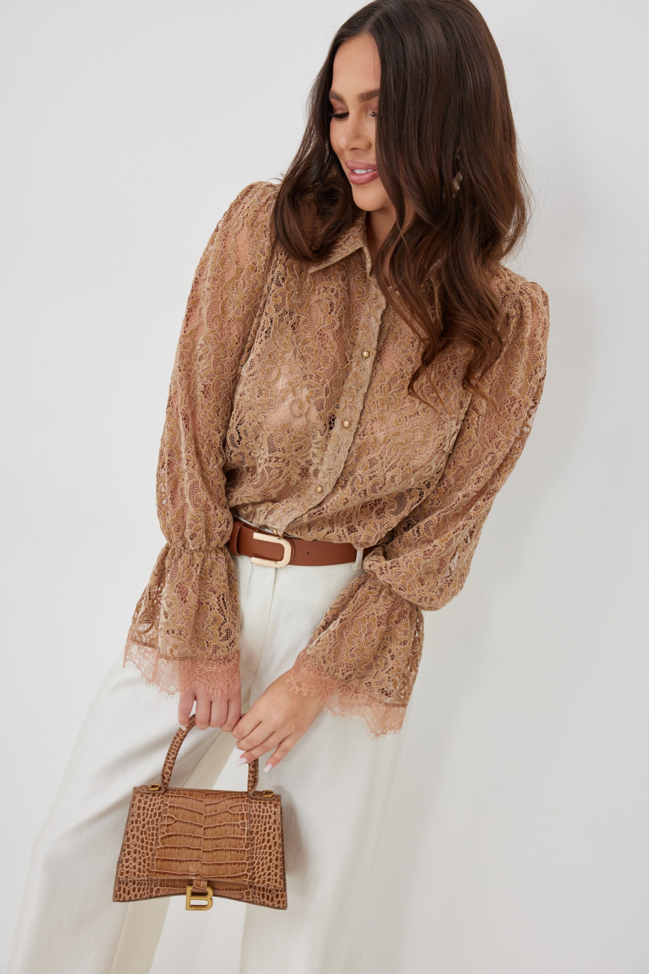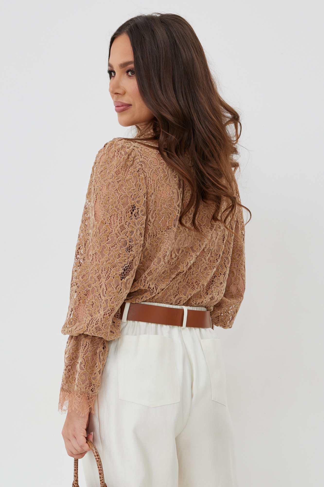 Невероятно нежная и стильная блуза прямого кроя с нагрудными вытачками. Рукав втачной, по низу присборен на эластичную тесьму и дополнен притачной кружевной манжетой. Застежка центральная на пришивные пуговицы. Воротник отложной на стойке. Блуза выполнена из красивого нежного бархатного кружева премиум качества.