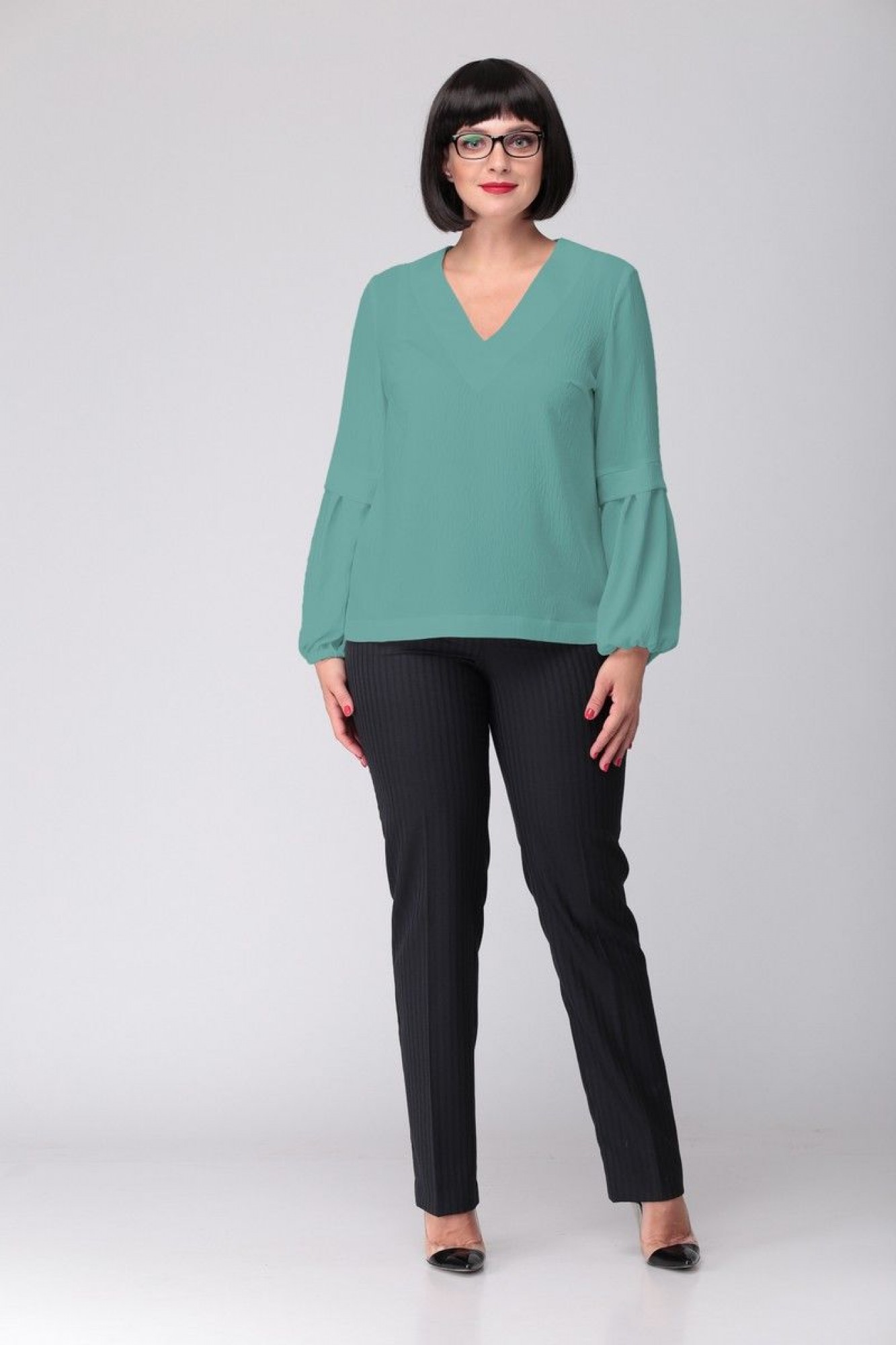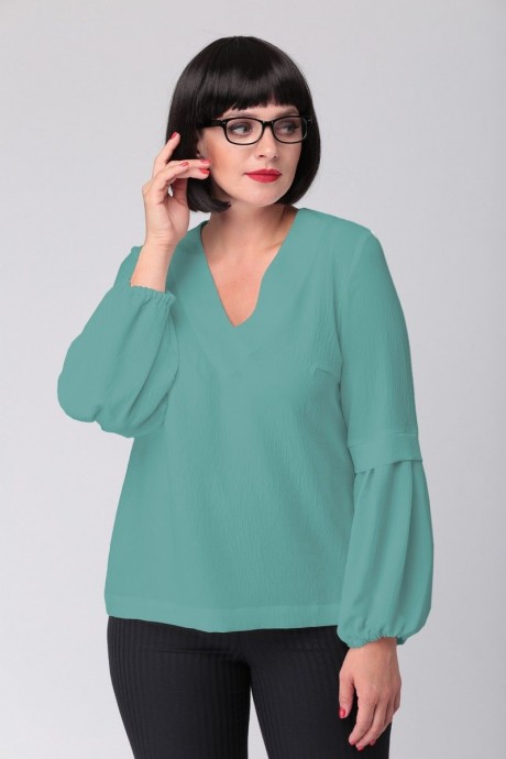 Блуза свободного силуэта с горловиной V-образной формы с широкой настроченной обтачкой. Перед с нагрудными вытачками из бокового шва. Спинка со средним швом. Рукав длинный втачной. По низу рукава сборка на эластичную тесьму. На уровне локтя имеется горизонтальный подрез с декоративной планкой, и выходящей из-под нее нижней частью рукава с 2мя мягкими встречными складками.