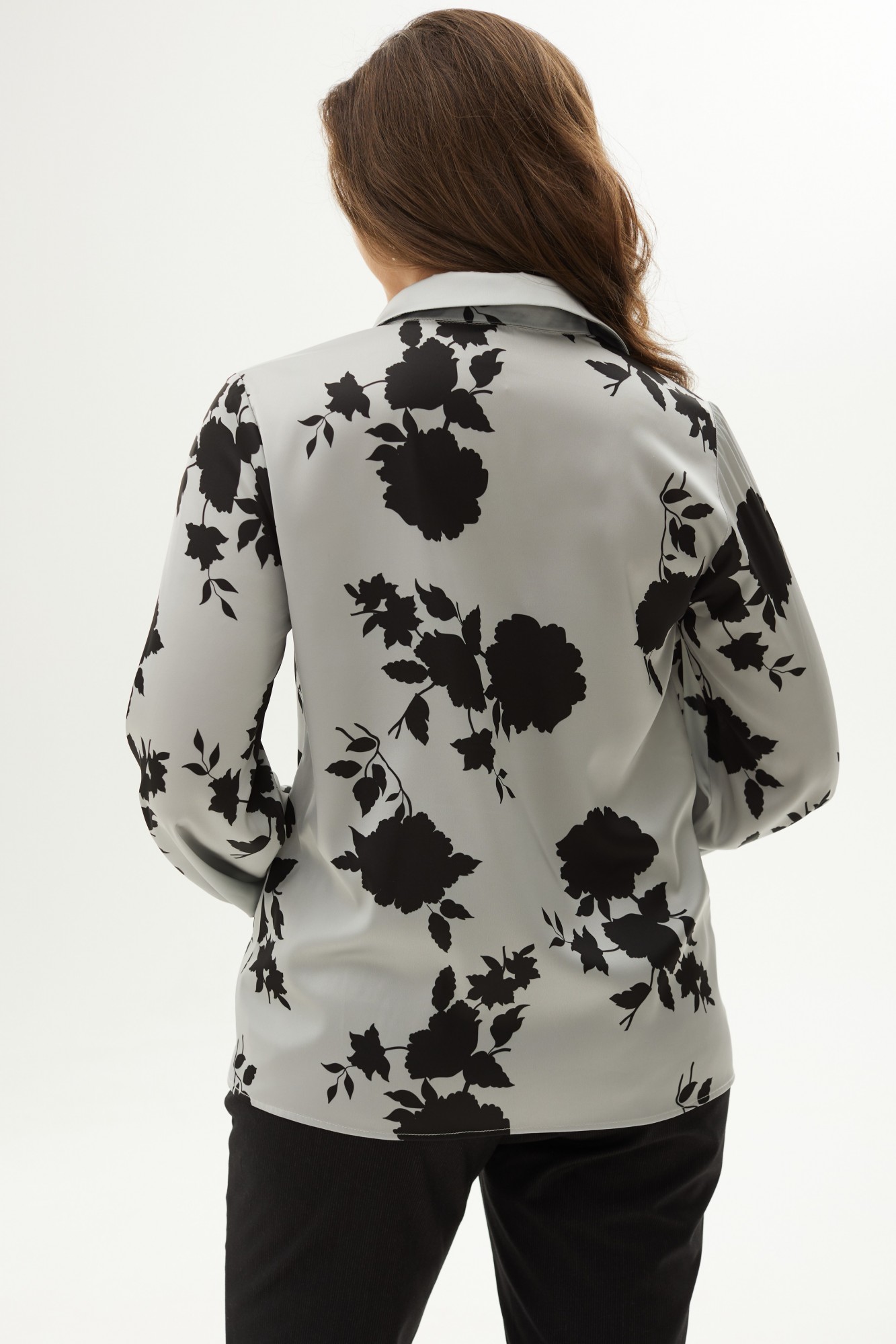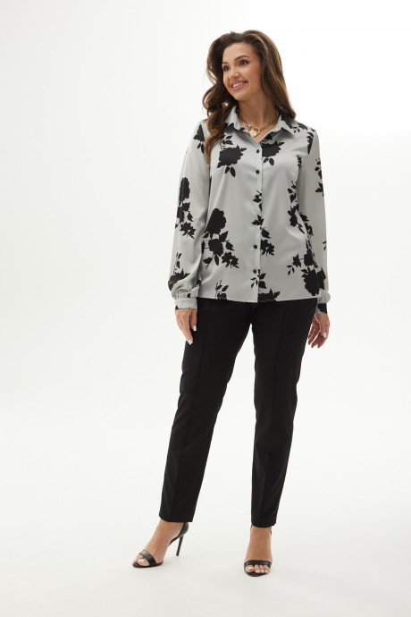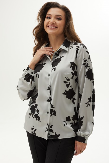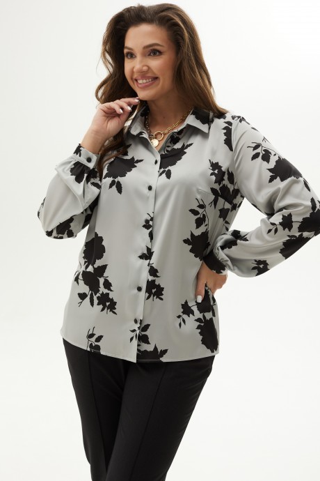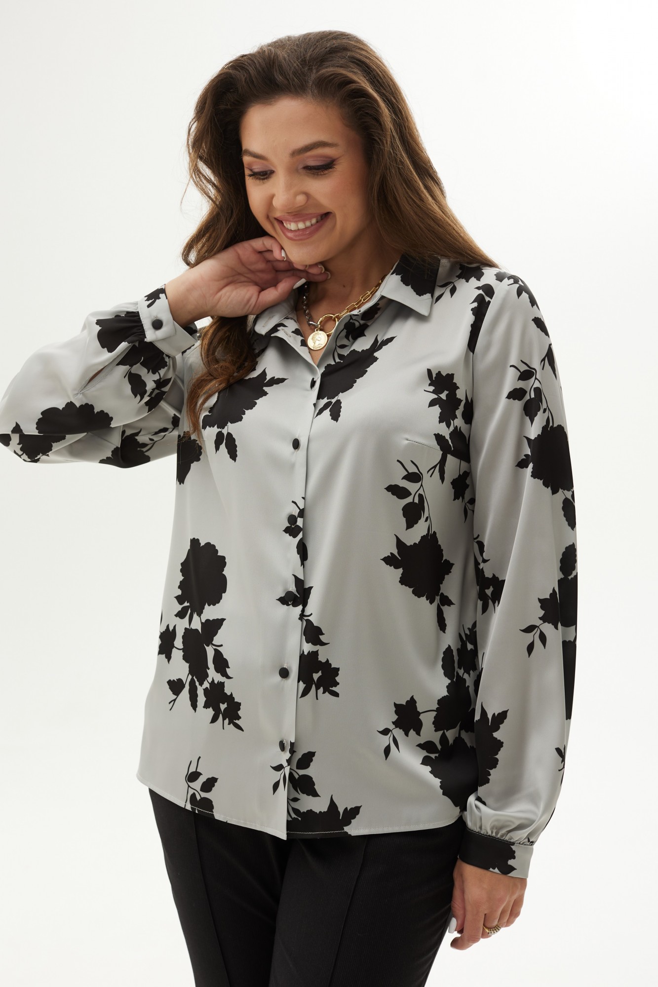 Блузка женская прямого силуэта на центральной застежке на петли и пуговицы. Перед с нагрудными вытачками от боковых швов. Спинка цельнокроеная. Рукав втачной одношовный длинный по низу со сборкой и на манжете, застегивающемся на петлю и пуговицу. Горловина на стойке с воротником.