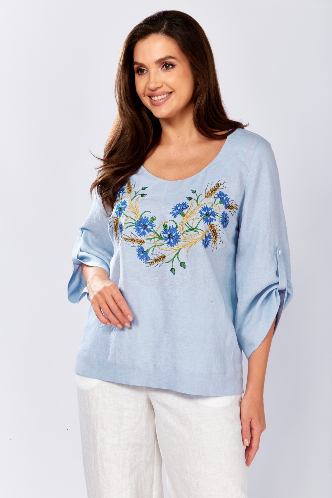 Блузка прямого силуэта. По переду нагрудные вытачки и декоративная вышивка. Горловина округлой формы. В боковых швах разрезы. Рукав втачной, расширен к низу, с застёжкой на пату и пуговицу.