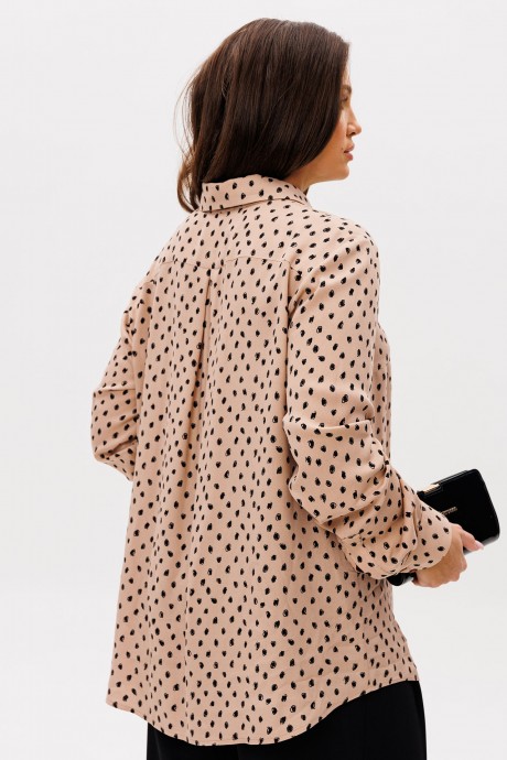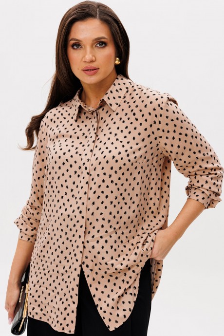 Блуза прямого силуэта с центральной потайной застежкой. Воротник стоячий отложной с отрезной стойкой. Перед с нагрудными вытачками. Спинка с отрезной кокеткой и встречной складкой по центру от кокетки. Рукав втачной, одношовный, рубашечного типа. По низу рукава обработанный разрез, две складки и притачная манжета с застежкой на две пуговицы. У блузы фигурный низ.