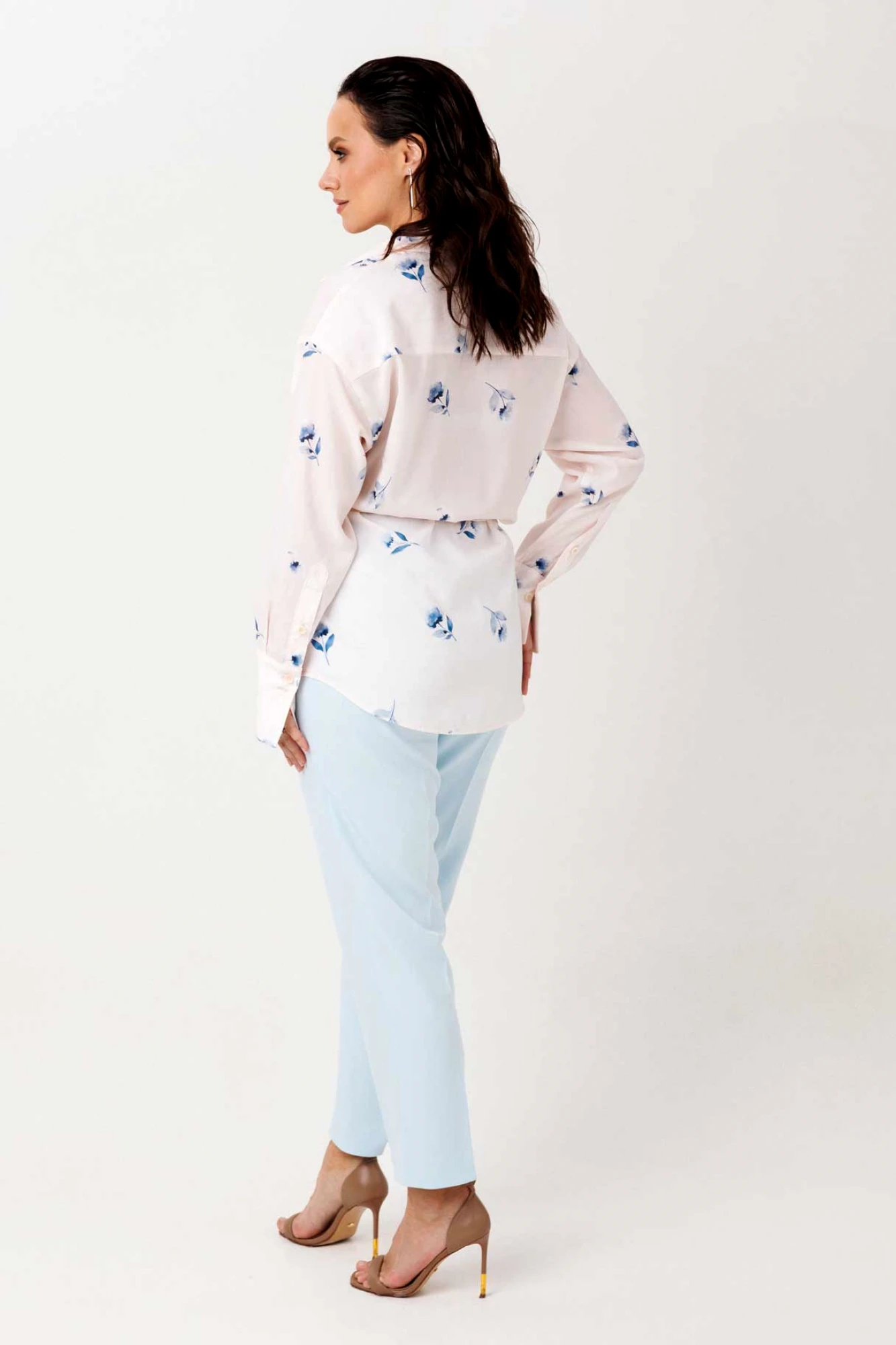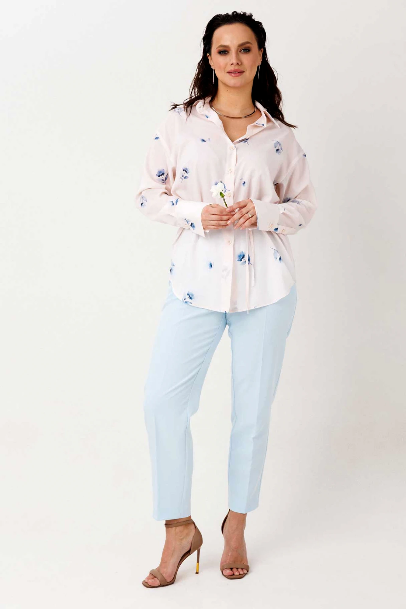 Лёгкая и элегантная блуза прямого силуэта, которая мягко подчёркивает фигуру за счёт завязок по линии талии. Вы сами регулируете посадку — от свободной до более приталенной, в зависимости от настроения и образа. Нежный принт добавляет образу свежести и лёгкости, а фигурный низ делает силуэт более динамичным и современным. Классические элементы — рубашечный воротник и манжеты с отрезной стойкой — выполнены из отделочной ткани, что добавляет изделию аккуратности и визуального интереса. Центральная застёжка на пуговицы делает блузу удобной и универсальной для повседневной носки.