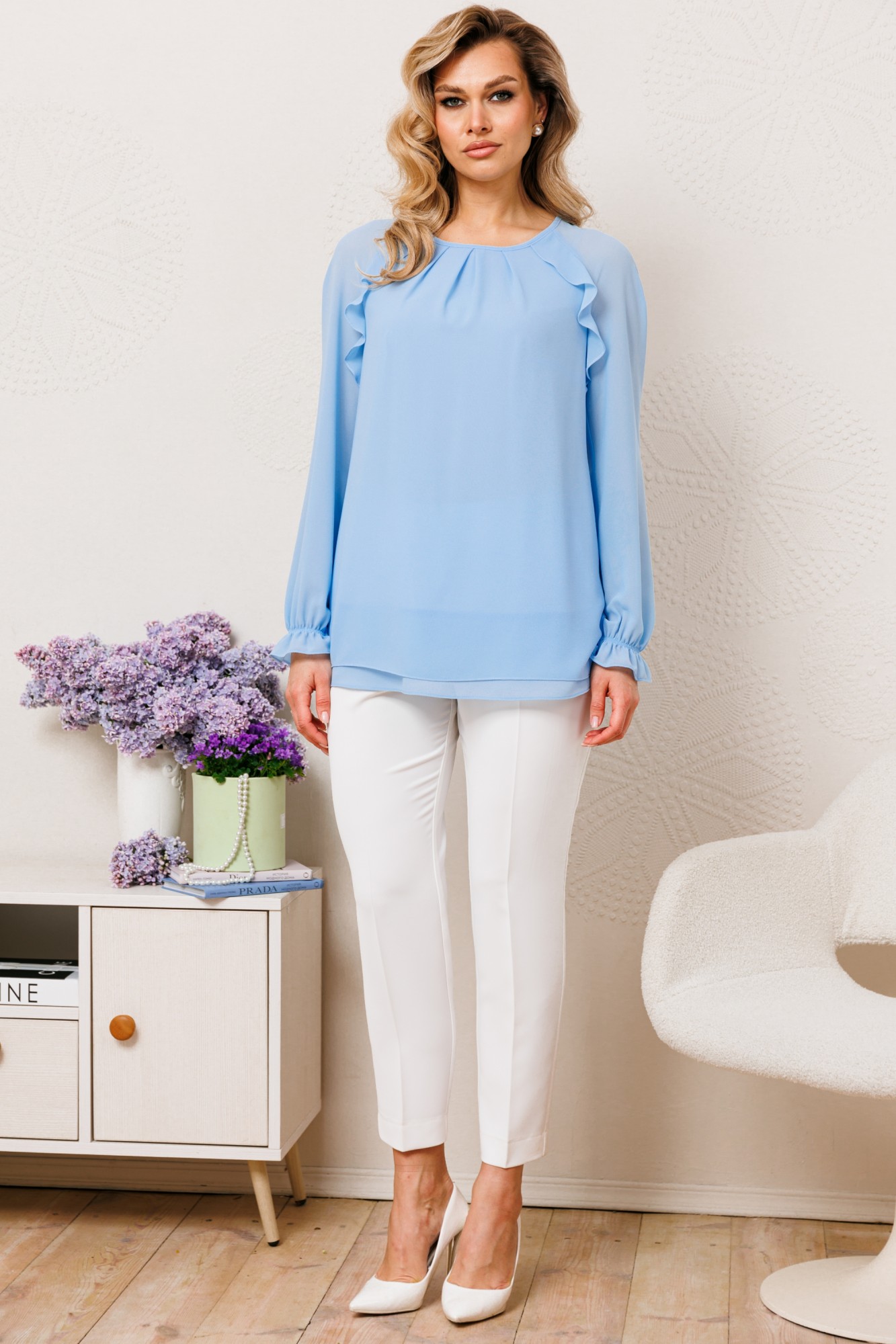 Легкая и воздушная! Именно так Вы будете чувствовать себя в блузе из шифона от бренда "Мода-Юрс". Блуза с легкостью дополнит любой комплект из вашего гардероба: будто жилет с брюками, жакет с юбкой или джинсы. Блуза прямого силуэта с рукавом реглан. Вырез горловины округлой формы. По линии горловины заложены складки. Декором и главным акцентом являются воланы по линии притачивания рукава. Низ рукава на резинке. Блуза на подкладке.