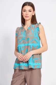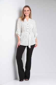 Блуза женская свободного силуэта с втачным рукавом без воротника. Полочка с втачной планкой и кокетками. В шов притачивания кокетки вставлен клапан. На планке застежка на пуговицах. Спинка с мягкой складкой по центру и притачной кокеткой. Рукав чуть ниже локтя с патой застегивающейся на пуговицу. Низ рукава и горловина изделия обработаны обтачкой. По бокам изделия разрезы.