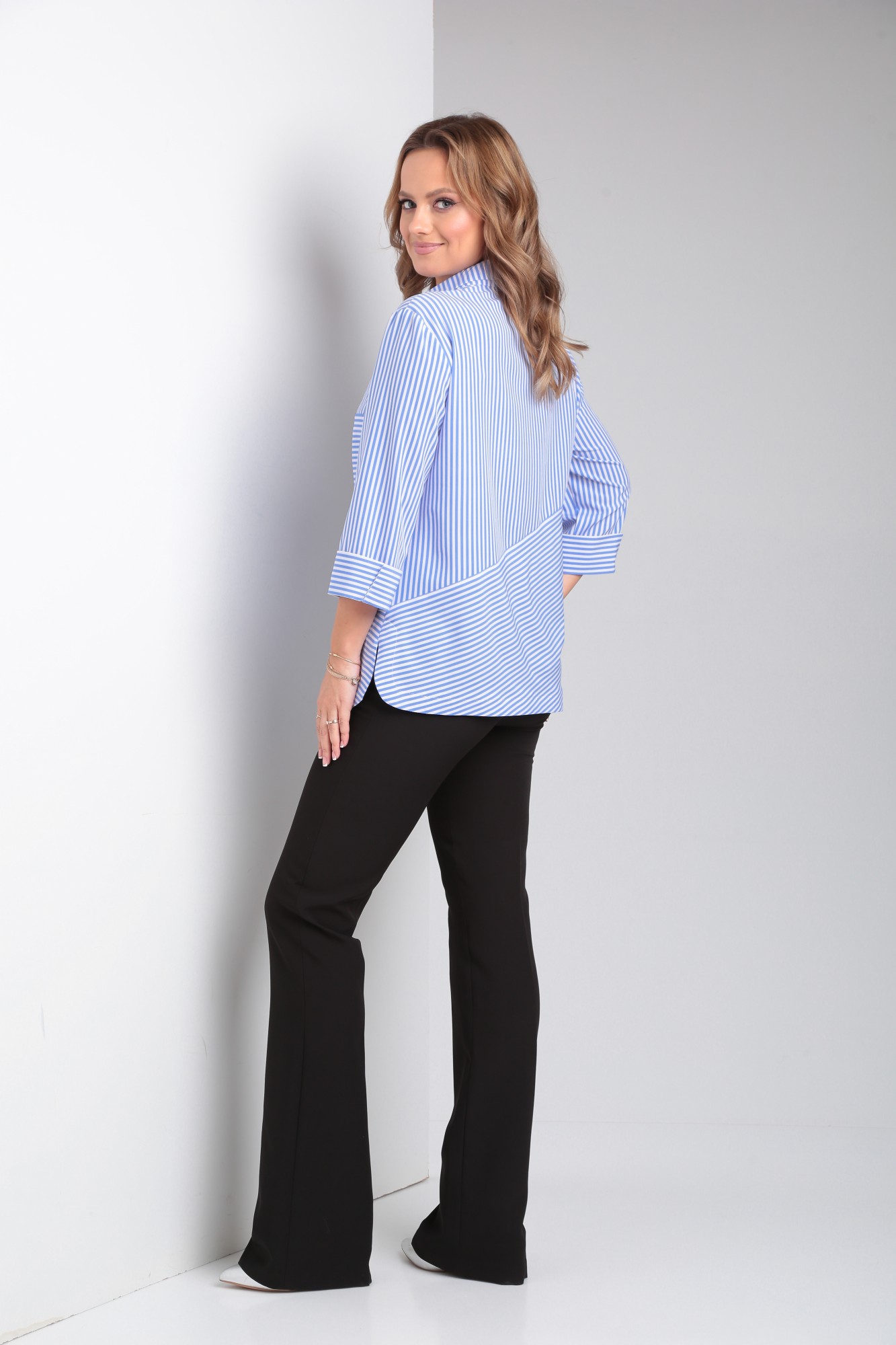 Блузка женская c рубашечным воротником, свободного силуэта. Полочка и спинка изделия, горизонтально разрезные на косую. Верхняя часть полочки с нагрудными вытачками, накладным карманом на левой части и цельнокроеной планкой на застежку. Рукав прямой, втачной с широкой манжетой на отворот. Низ изделия фигурный с разрезами по боковым швам, обработан широкой обтачкой.