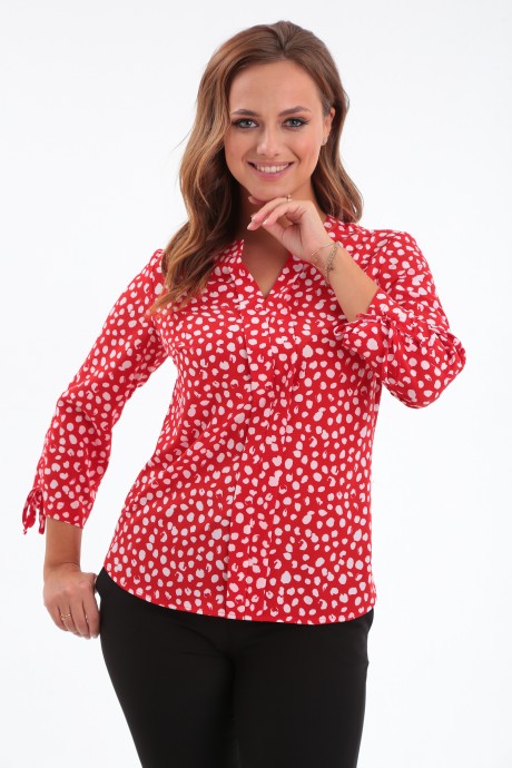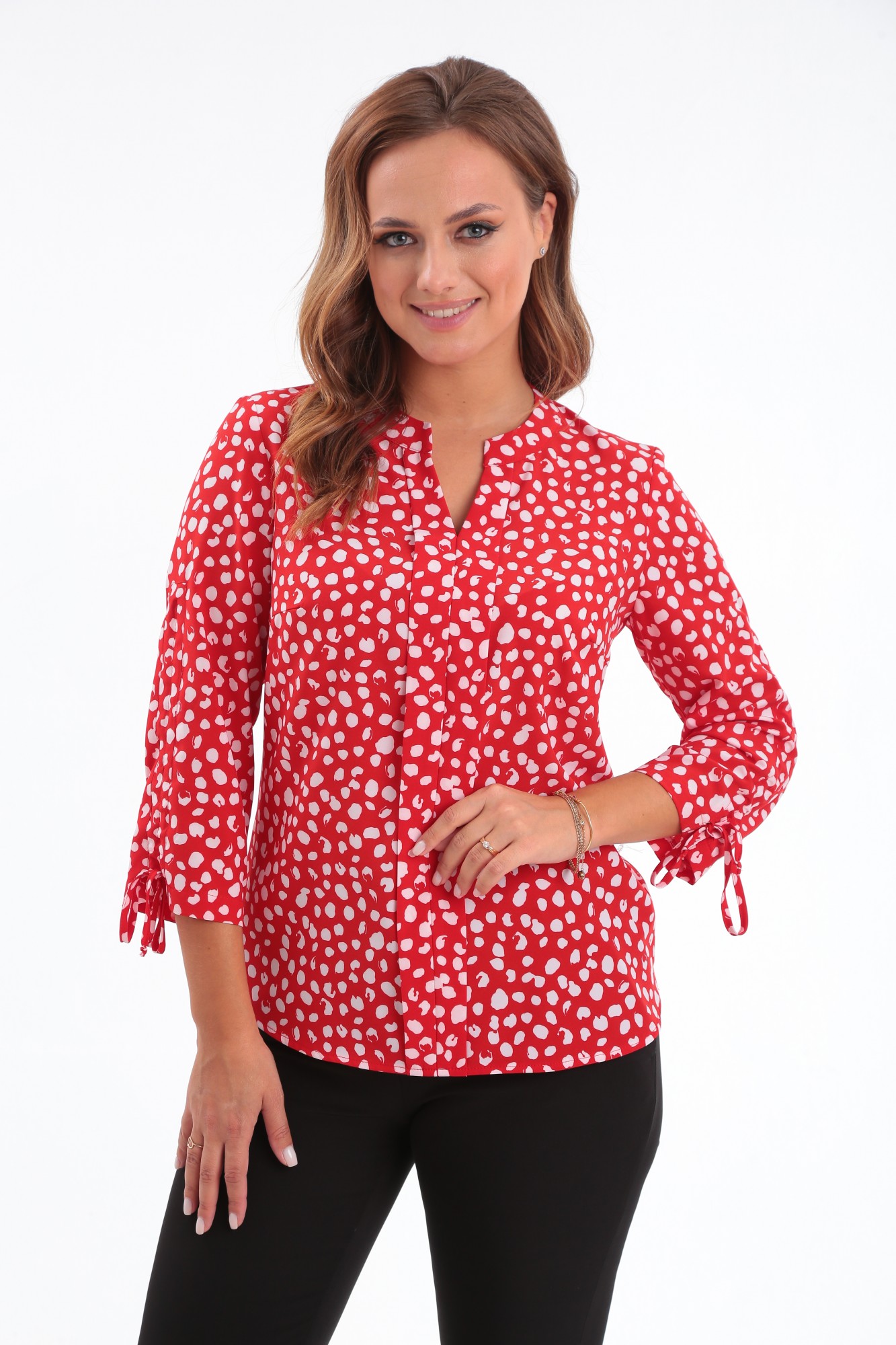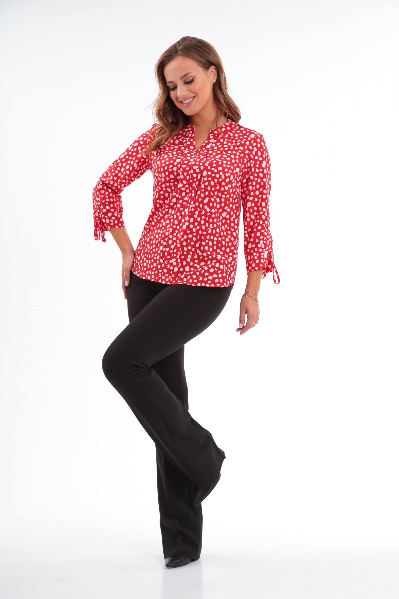 Женская блузка с V-образным вырезом. Модель c воротником стойкой. Рукав втачной длинной за локоть и шнуровкой-стяжкой. Передние полочки блузы с нагрудными вытачками. По спинке планка с застежкой на пуговицы.