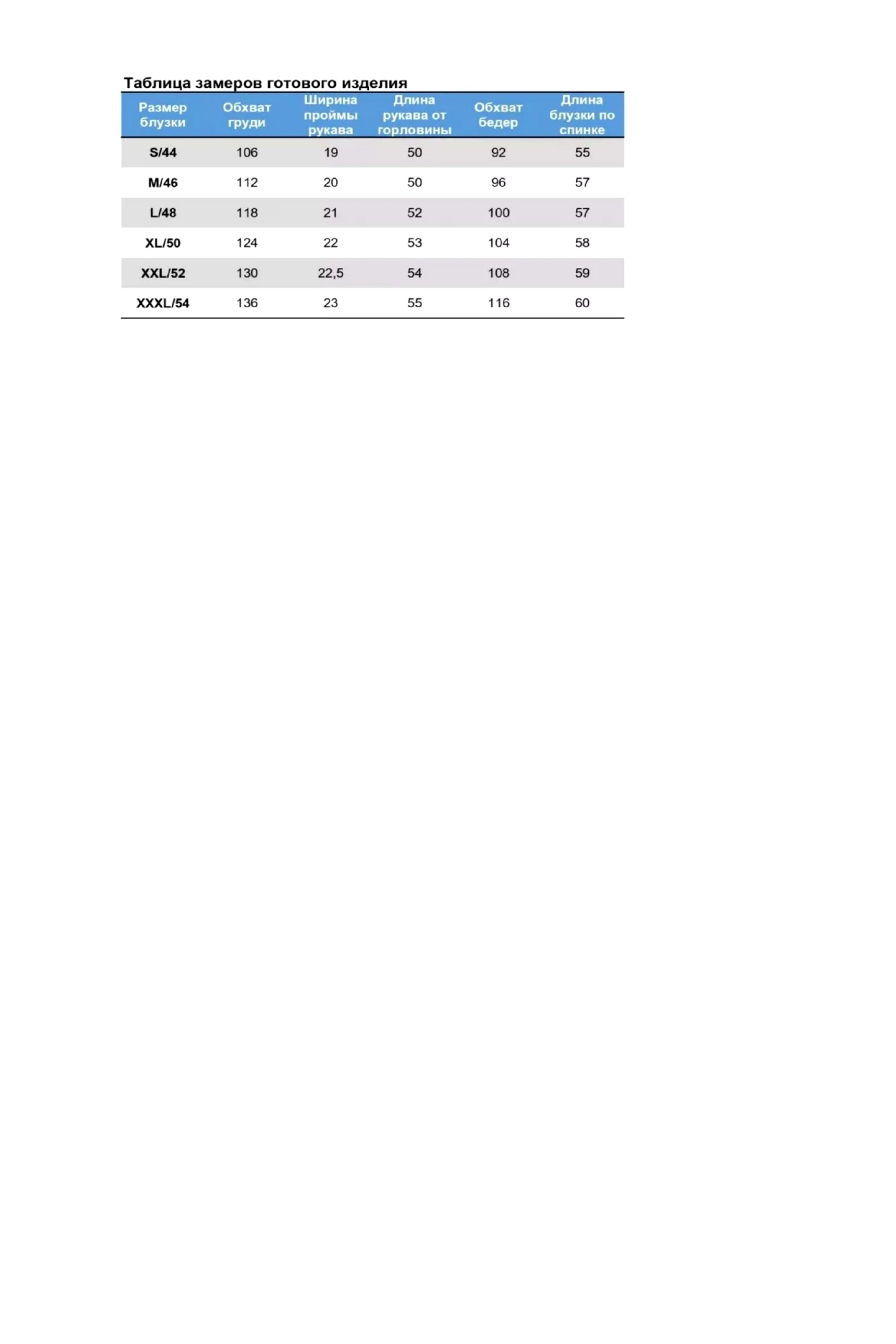 Таблица размеров