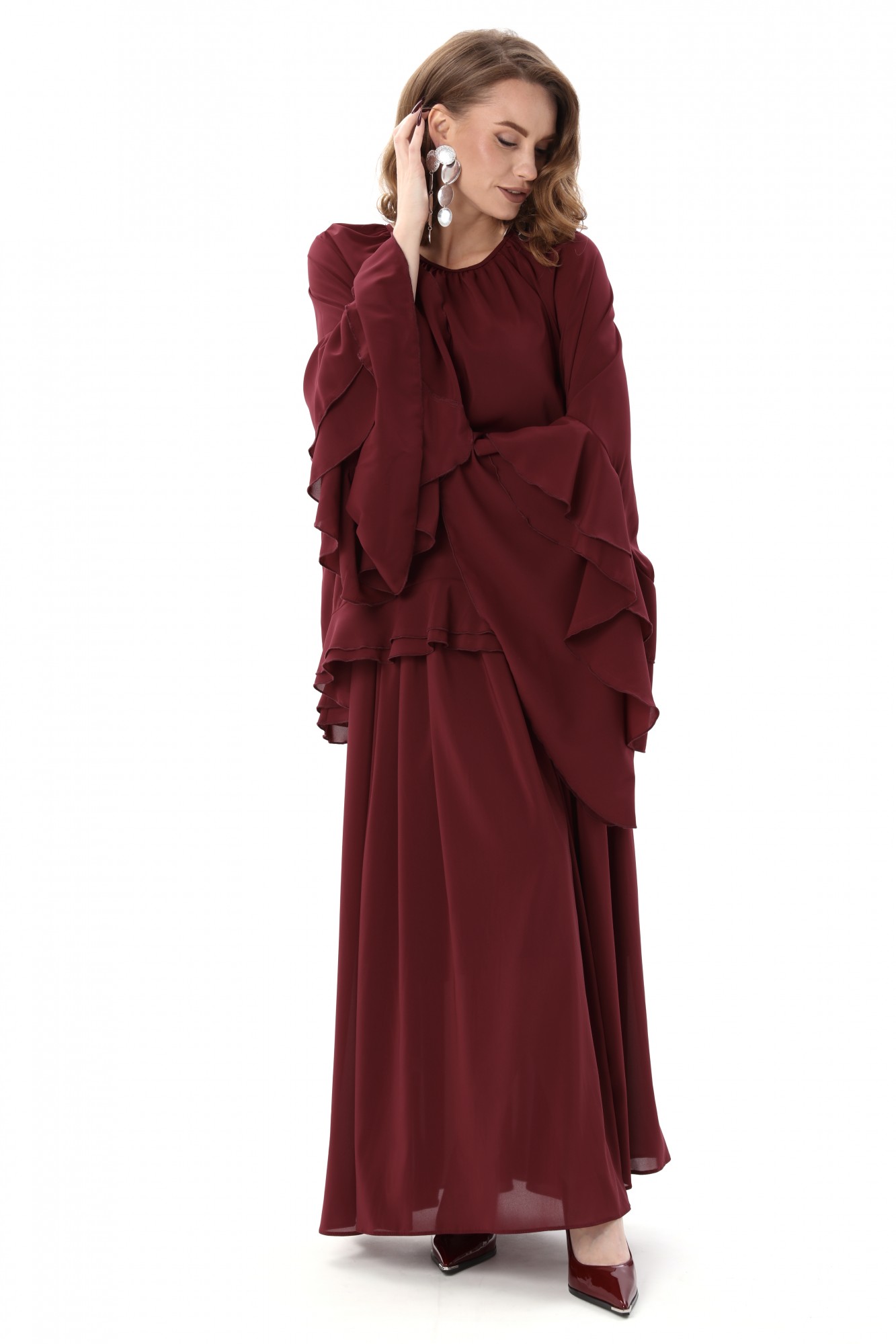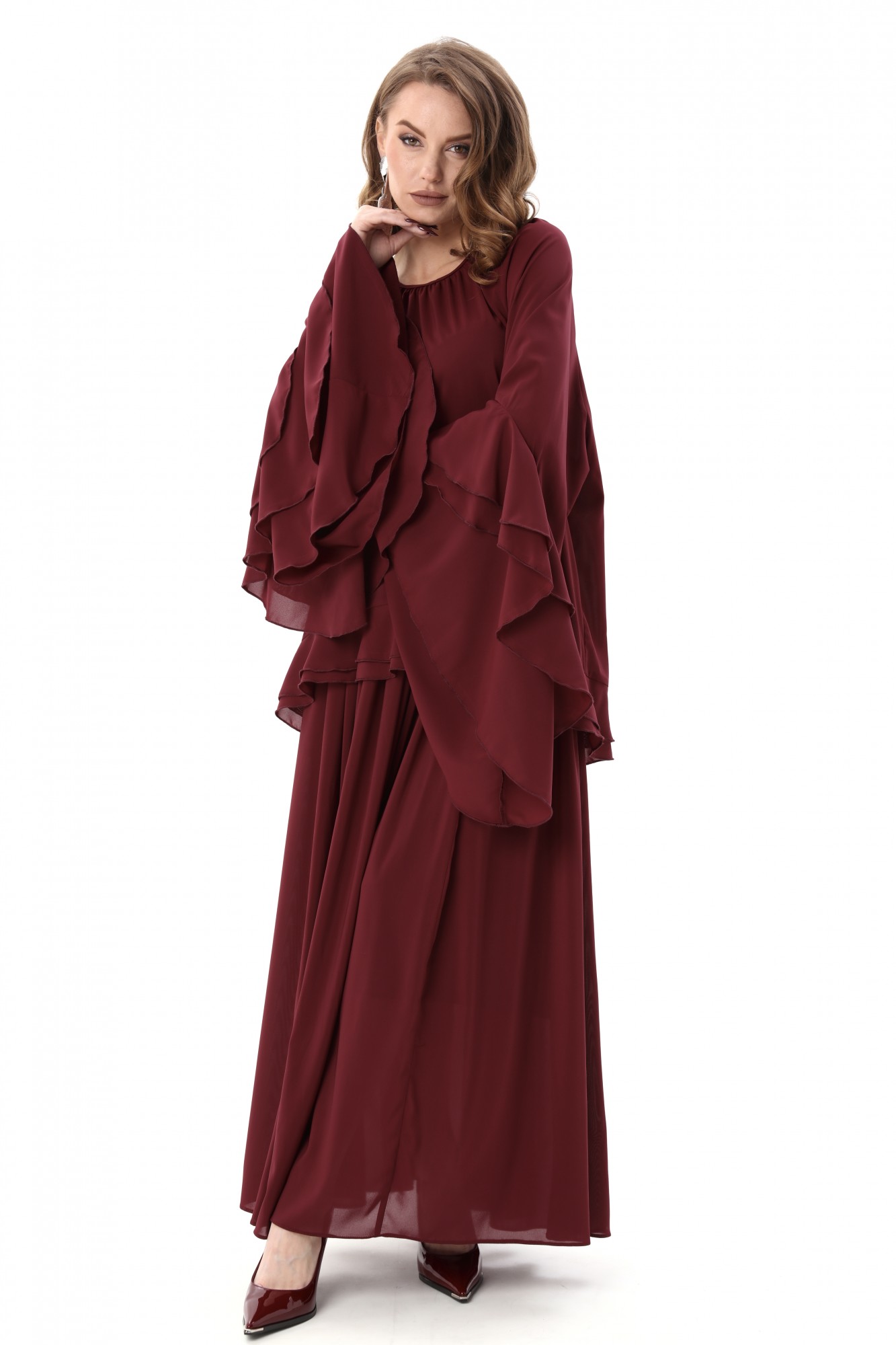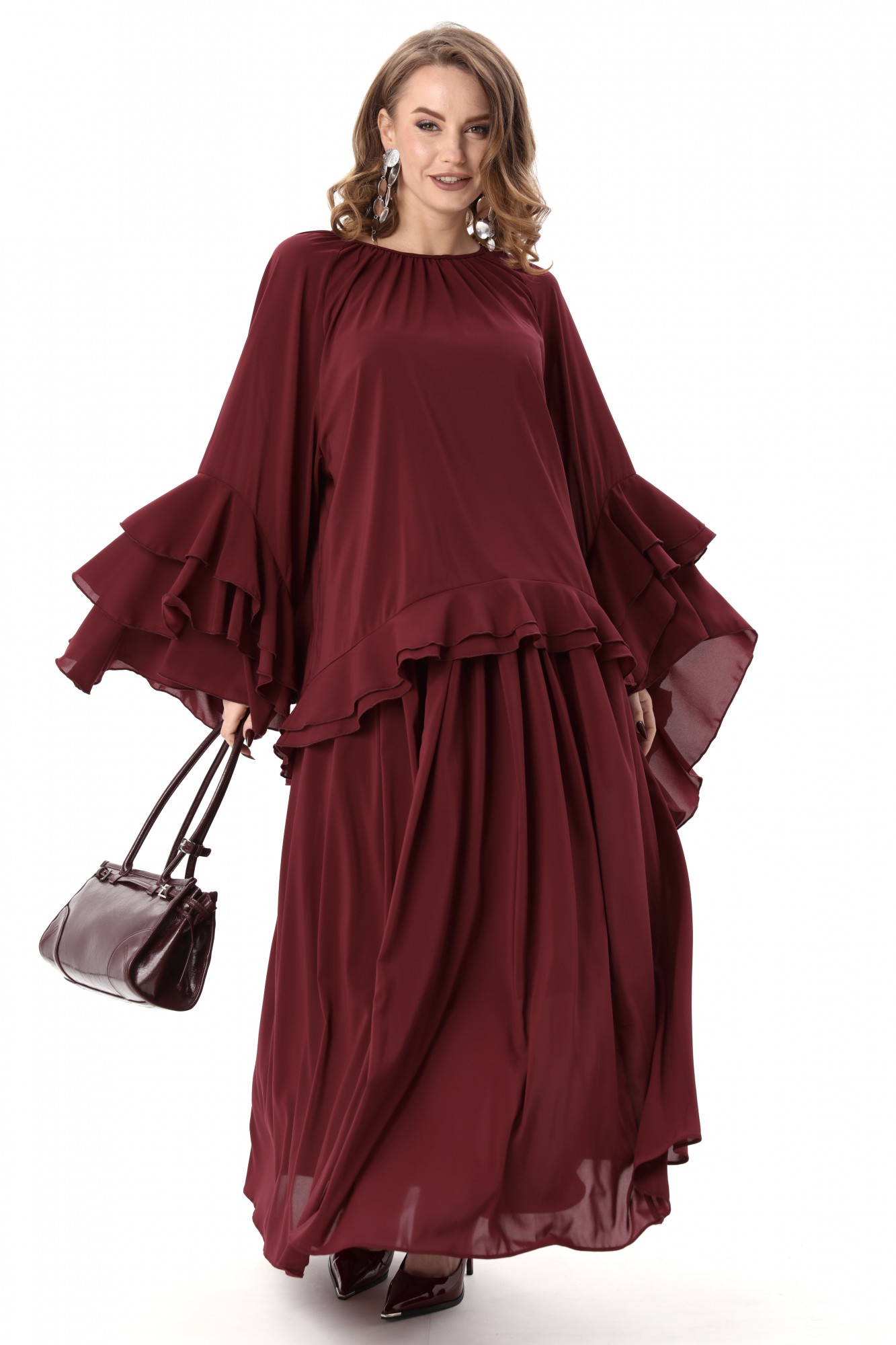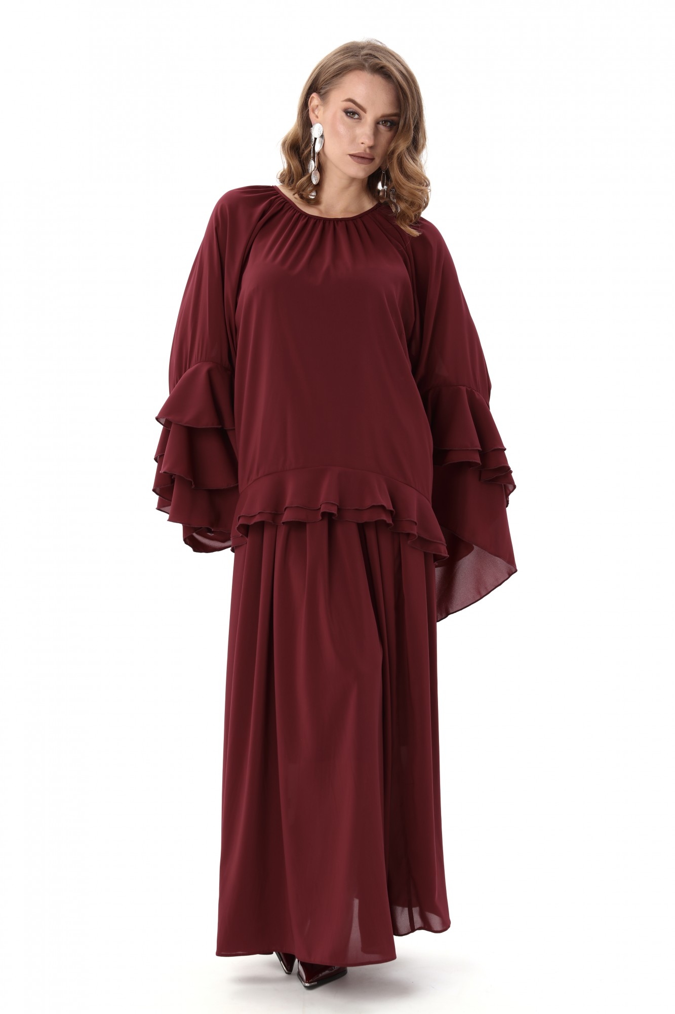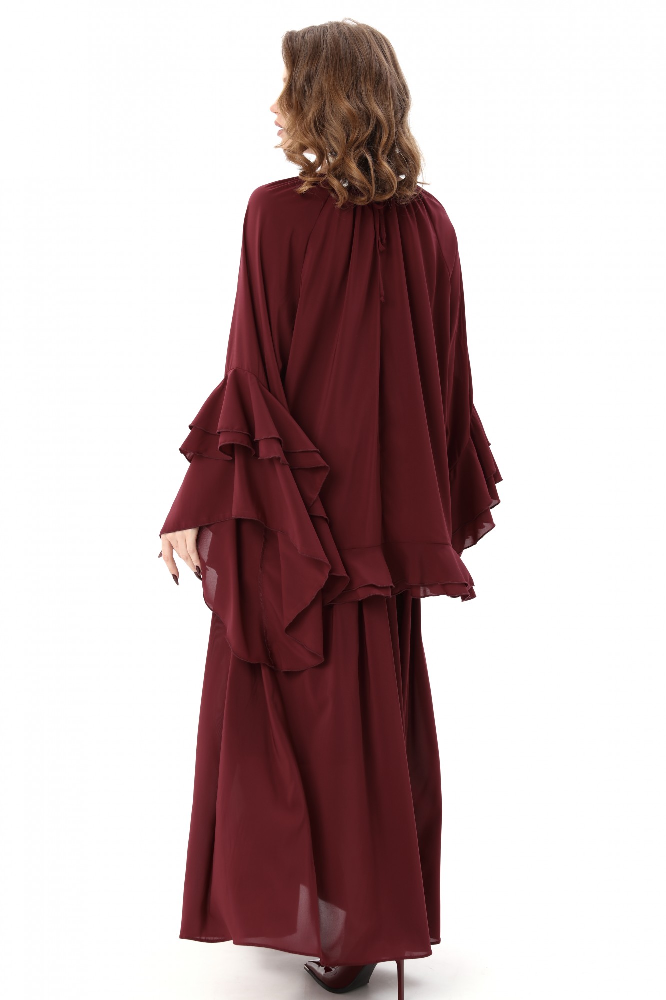 Блуза свободного силуэта с присборенной горловиной, обработанной бейкой. Спинка со средним швом, переходящим в разрез. Рукава реглан с асимметричными воланами. Нижний край блузы с двойным воланом.