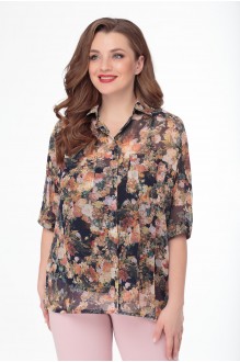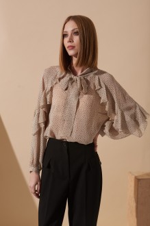 Нарядная блузка, прямого силуэта из струящейся ткани. Вырез горловины V-образной формы. Волан по спинке, заканчивающийся по переду, завязка. Рукав длинный с воланом. Рукав и низ собраны на резинку.