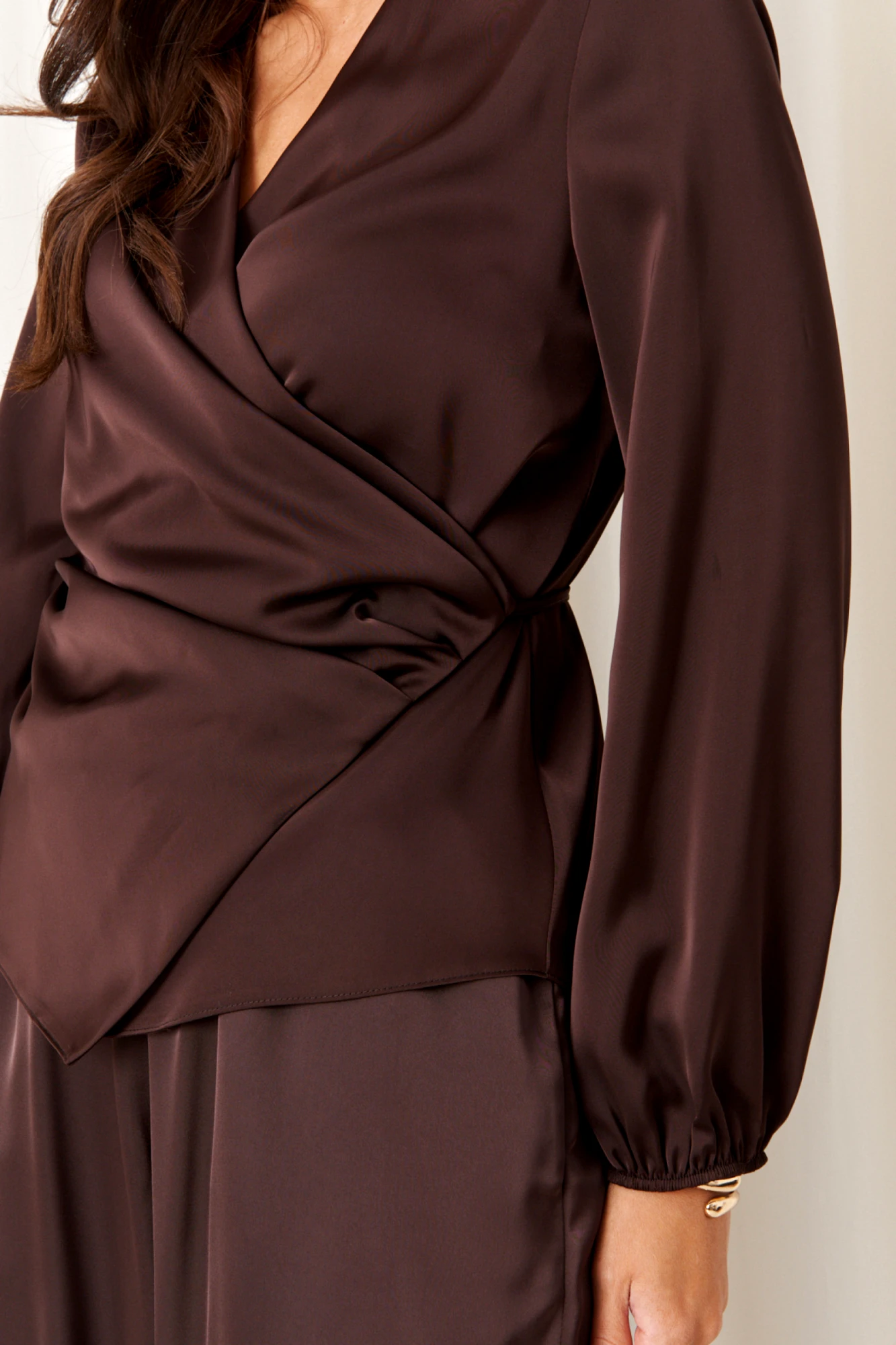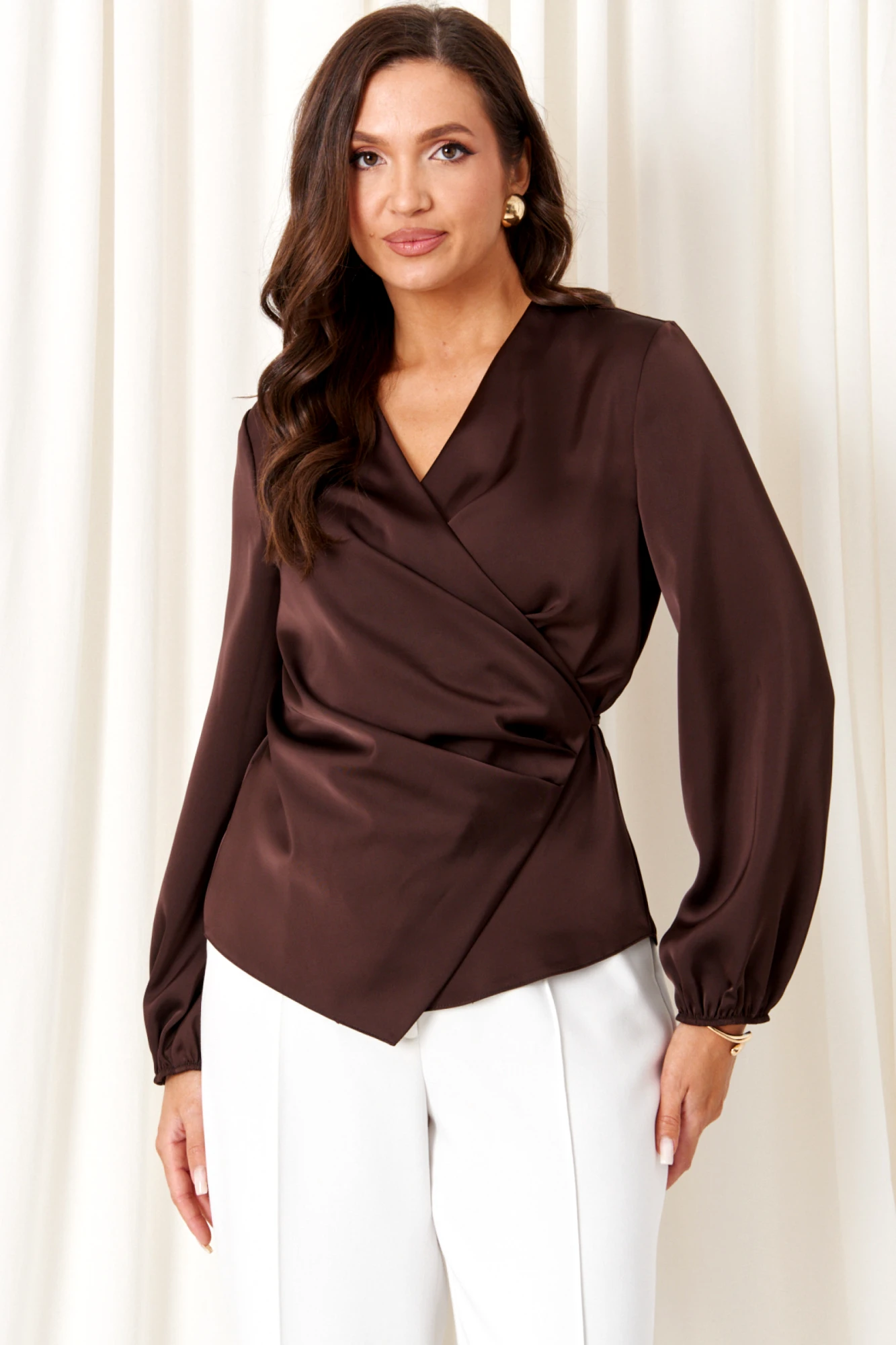 Эта изысканная женская блузка, созданная из высококачественной атласной ткани, станет идеальным выбором для торжественных случаев и особых мероприятий. Полуприлегающий силуэт подчеркивает фигуру, придавая образу элегантность и женственность. Блузка выполнена на запах с фигурным бортом и складками, что добавляет оригинальности и утонченности. Уникальный шнурок, продеваемый в боковом шве через специальное отверстие, позволяет завязывать блузку по спинке, обеспечивая комфортную посадку и возможность регулировки. V-образная горловина визуально удлиняет шею и придаёт блузке стильный вид. Длинные втачные рукава с притачной резинкой по низу создают аккуратные сборки, добавляя динамичности и романтичности. Коричневый оттенок делает блузку универсальной для сочетания с различными стилями и цветами в одежде. Атласная ткань обладает приятной текстурой и лёгким блеском, что придаёт изделию особую изысканность. Эта блузка станет отличным дополнением к вашему гардеробу и подчеркнёт ваш стиль в любой торжественной обстановке.