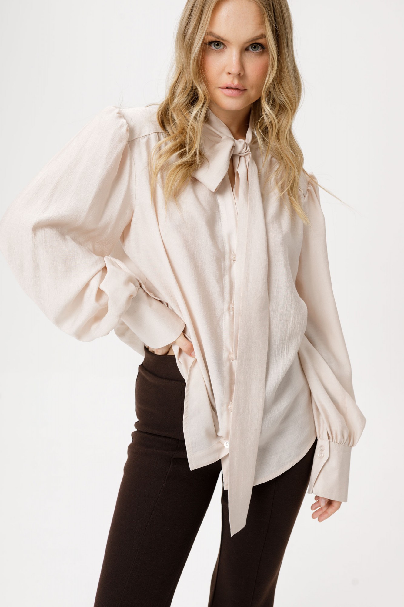 Блуза из полупрозрачной вискозы свободного силуэта с воротником-бантом. Детали: прямой силуэт, воротник-стойка переходящий в бант, кокетка переда и спинки, V-образный вырез с застежкой на петли и пуговицы, рукава втачные со сборкой и широкими манжетами.