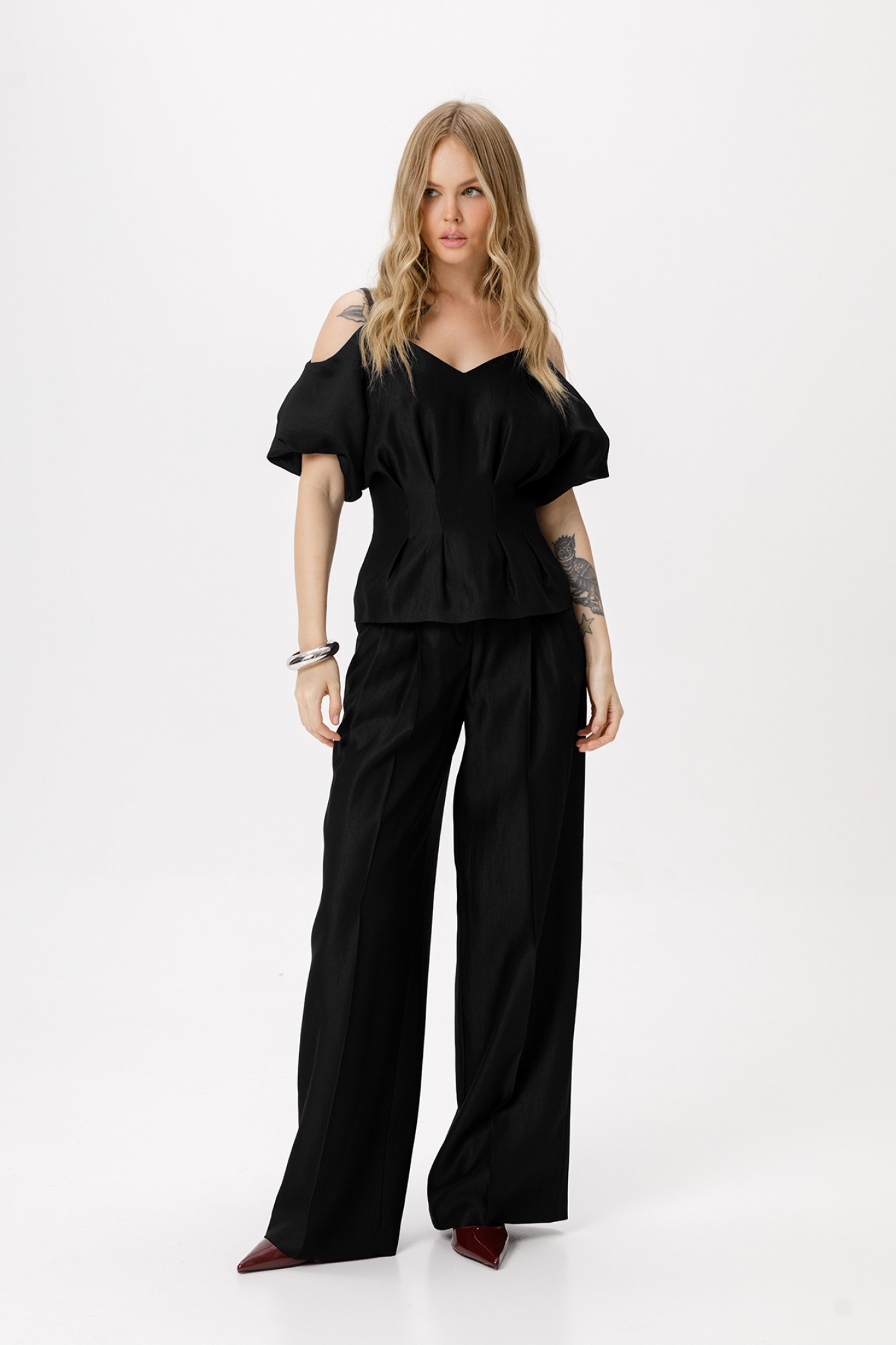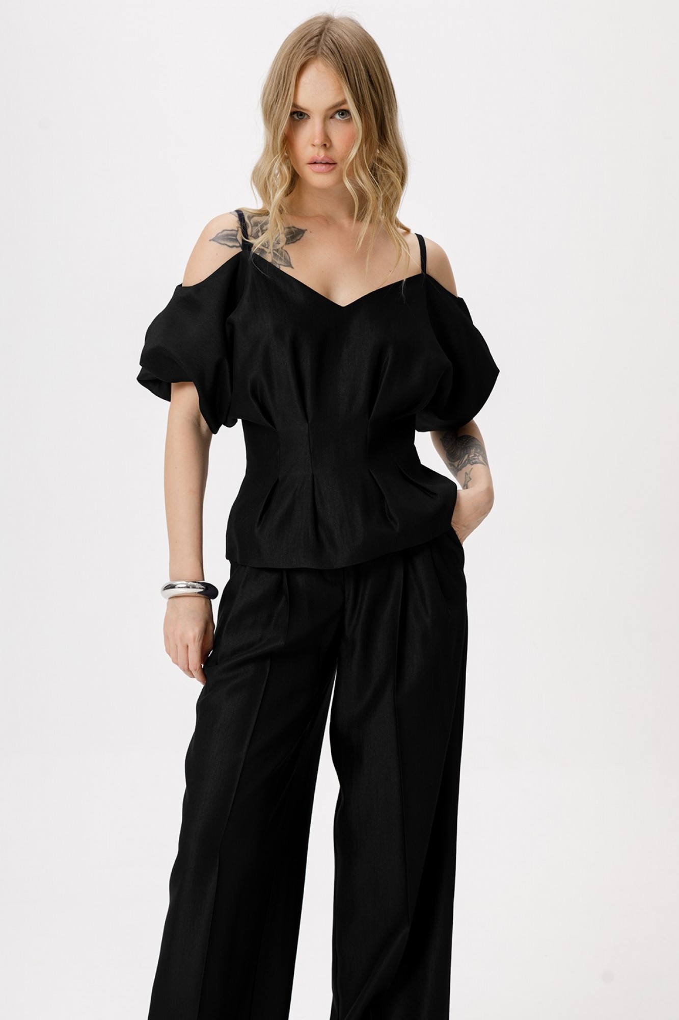 Приталенная блуза со складками. Детали: приталенный силуэт, застроченные складки по линии талии, V-образный вырез переда и спинки, рукава короткие цельнокроеные с вырезом по плечу, застежка на потайную молнию по спинке, на подкладке.