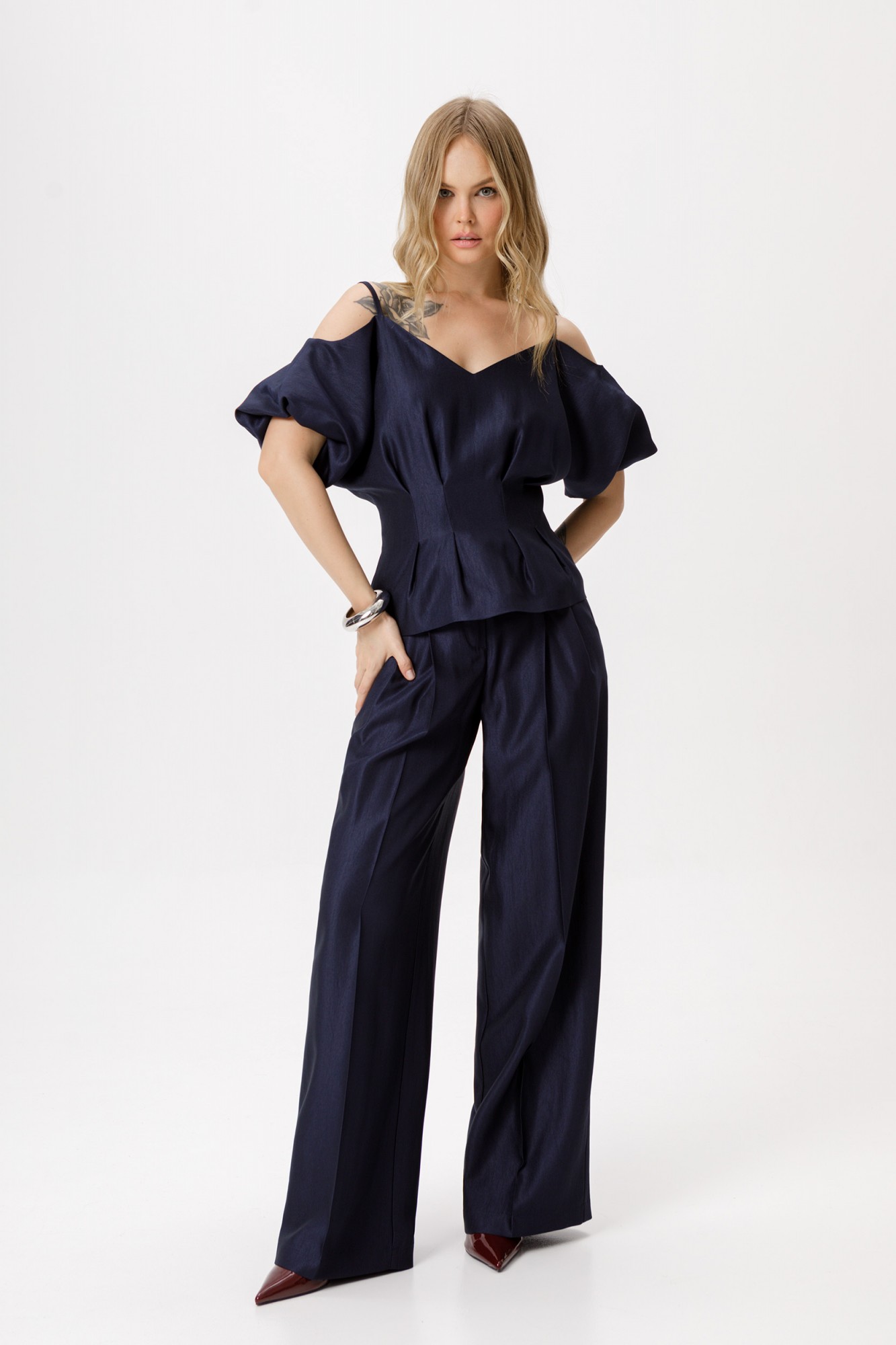 Приталенная блуза со складками. Детали: приталенный силуэт, застроченные складки по линии талии, V-образный вырез переда и спинки, рукава короткие цельнокроеные с вырезом по плечу, застежка на потайную молнию по спинке, на подкладке.