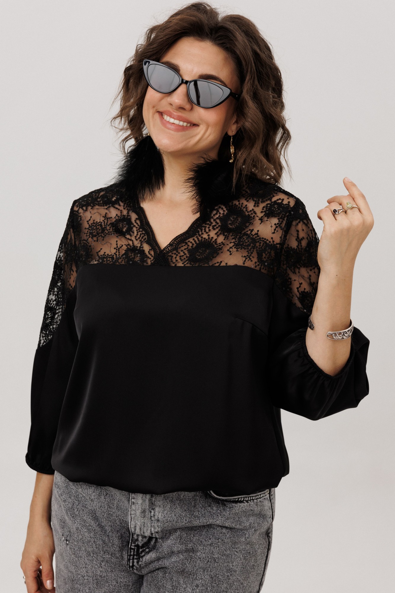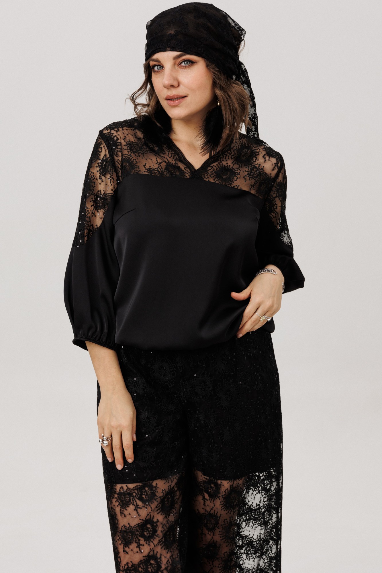 Верхняя часть, словно лёгкое кружевное облако с изысканными кокетками на полочке, спинке и изящными вставками на рукавах, переходит в благородный гладкий атлас, мерцающий приглушённым блеском. Рукава три четверти, собранные у низа на тонкую резинку, и такой же аккуратный низ самой блузы создают мягкие, едва уловимые волны, добавляя образу воздушности и динамики.