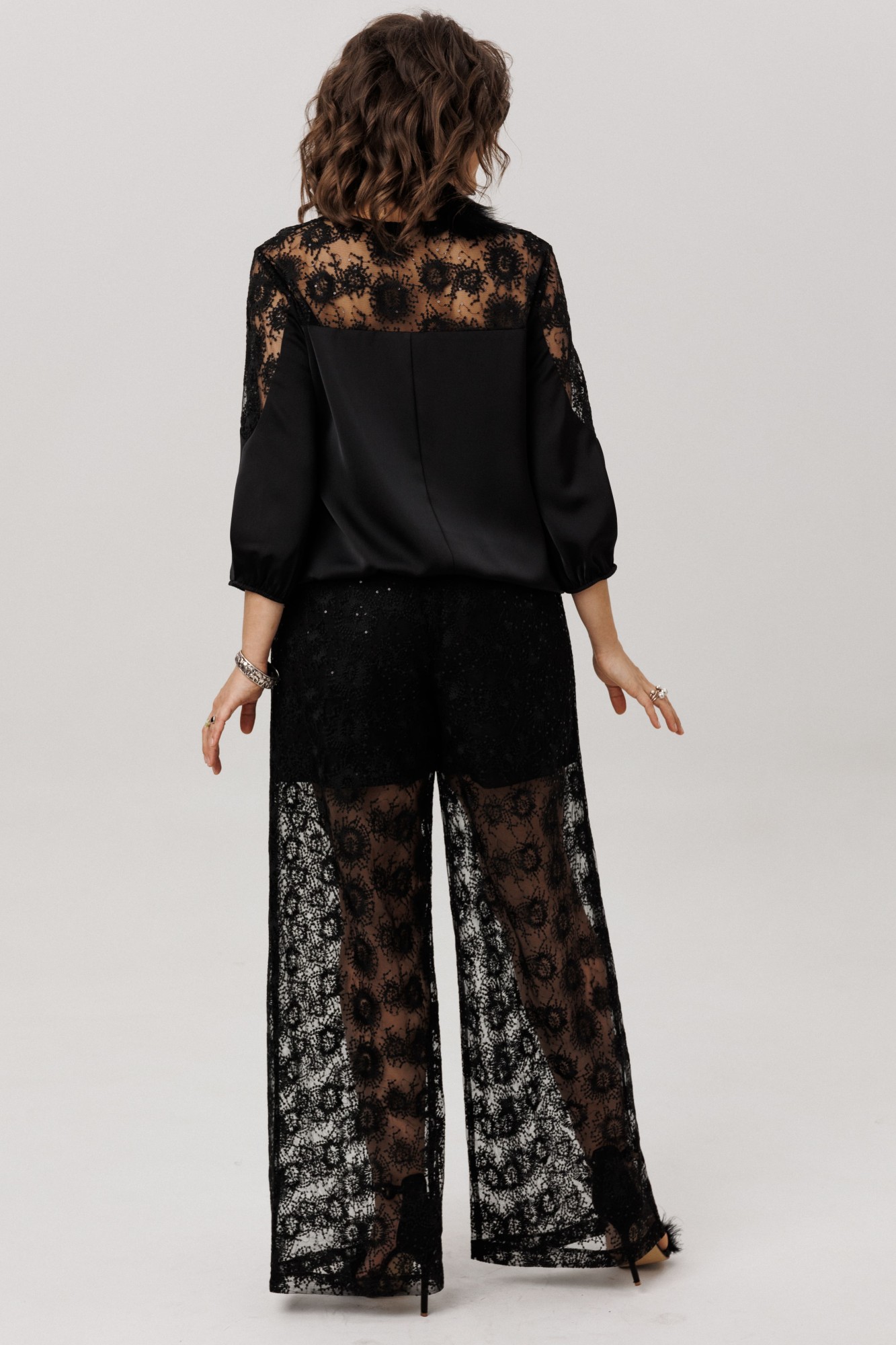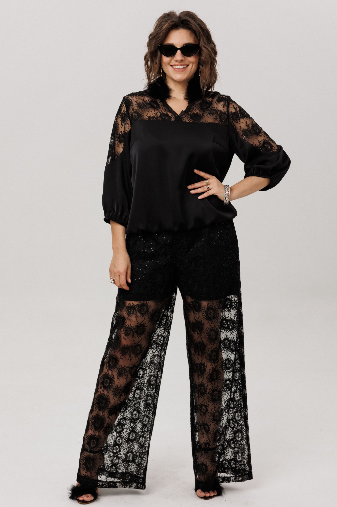 Верхняя часть, словно лёгкое кружевное облако с изысканными кокетками на полочке, спинке и изящными вставками на рукавах, переходит в благородный гладкий атлас, мерцающий приглушённым блеском. Рукава три четверти, собранные у низа на тонкую резинку, и такой же аккуратный низ самой блузы создают мягкие, едва уловимые волны, добавляя образу воздушности и динамики.