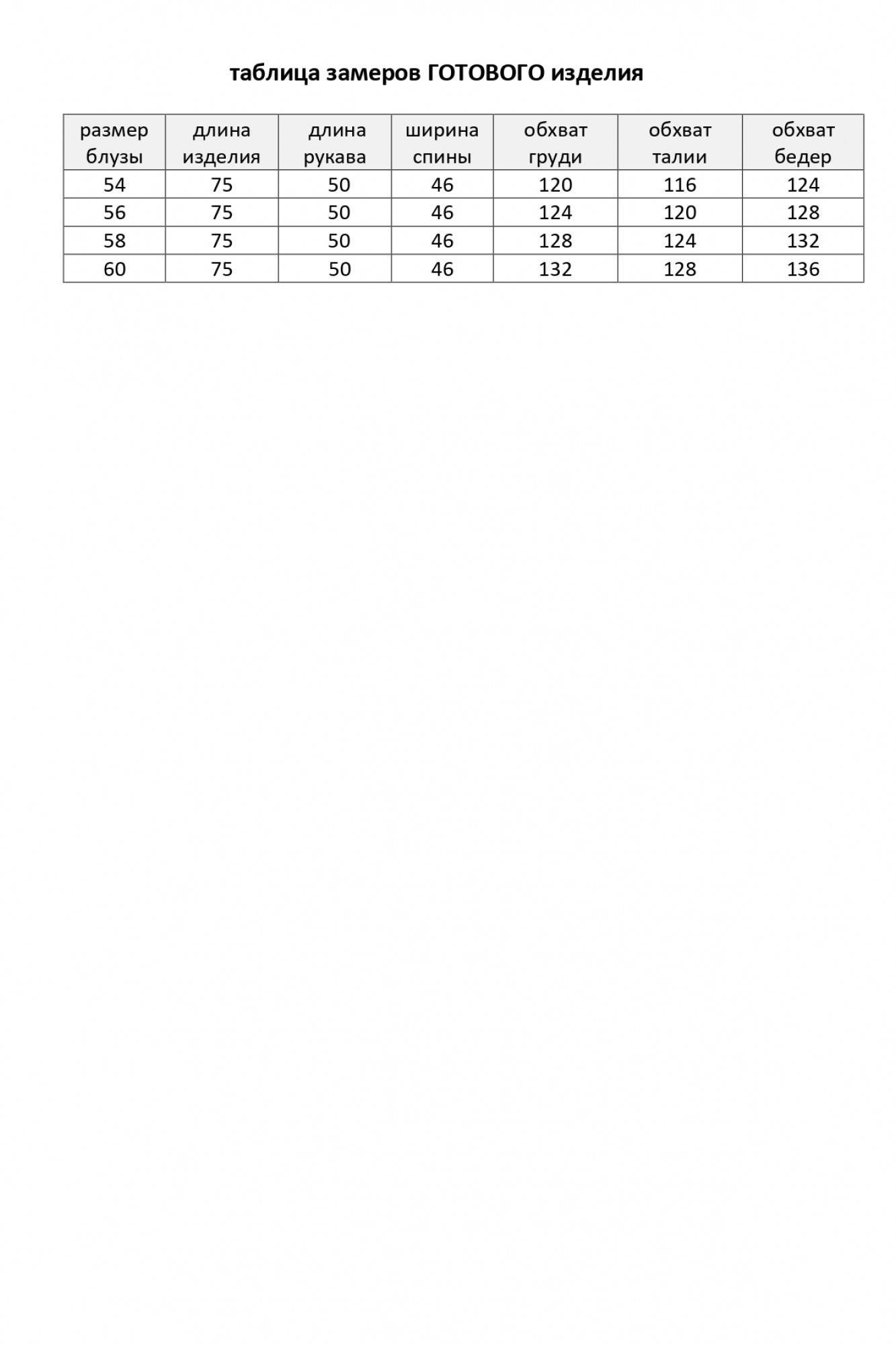 Таблица размеров