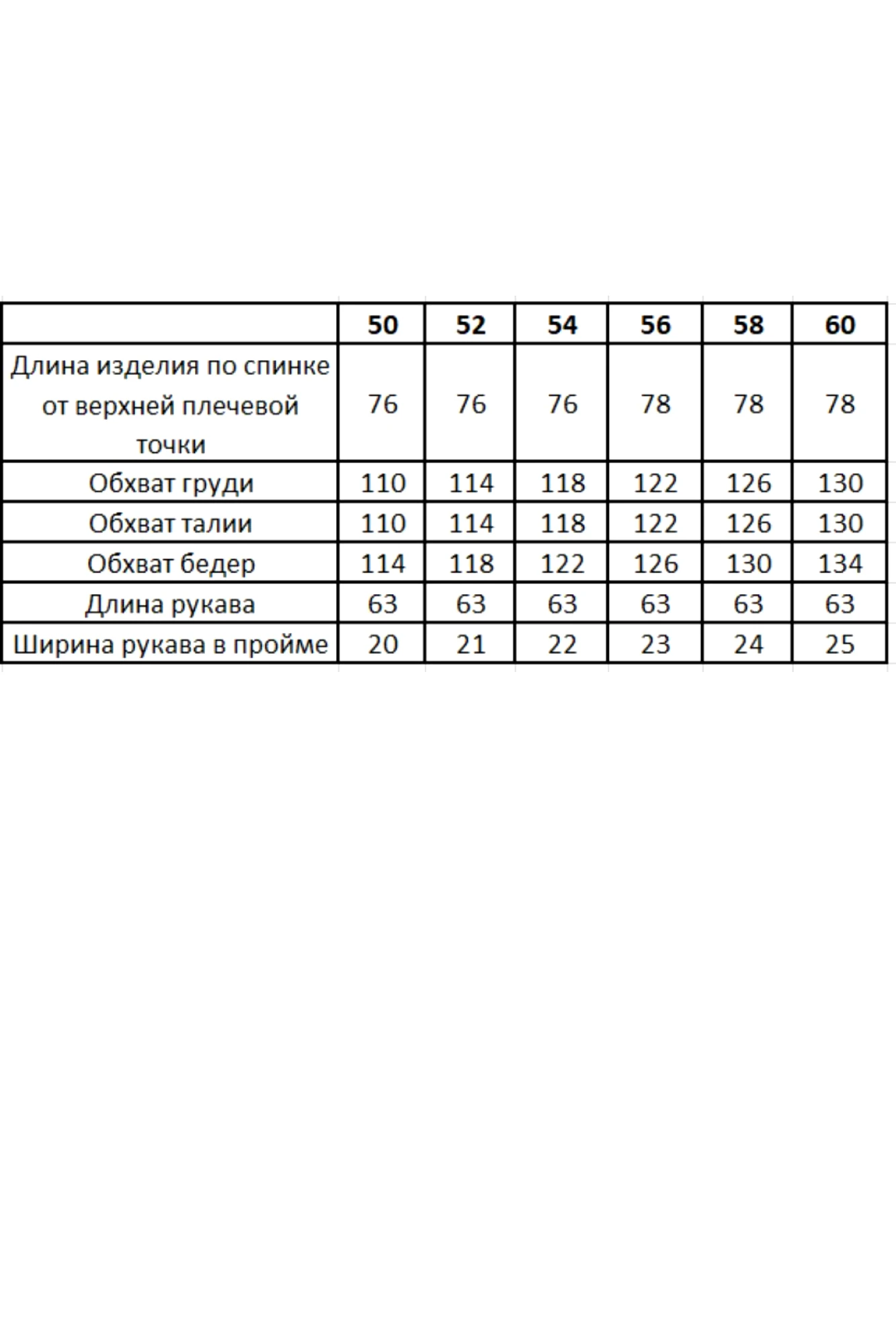 Таблица размеров