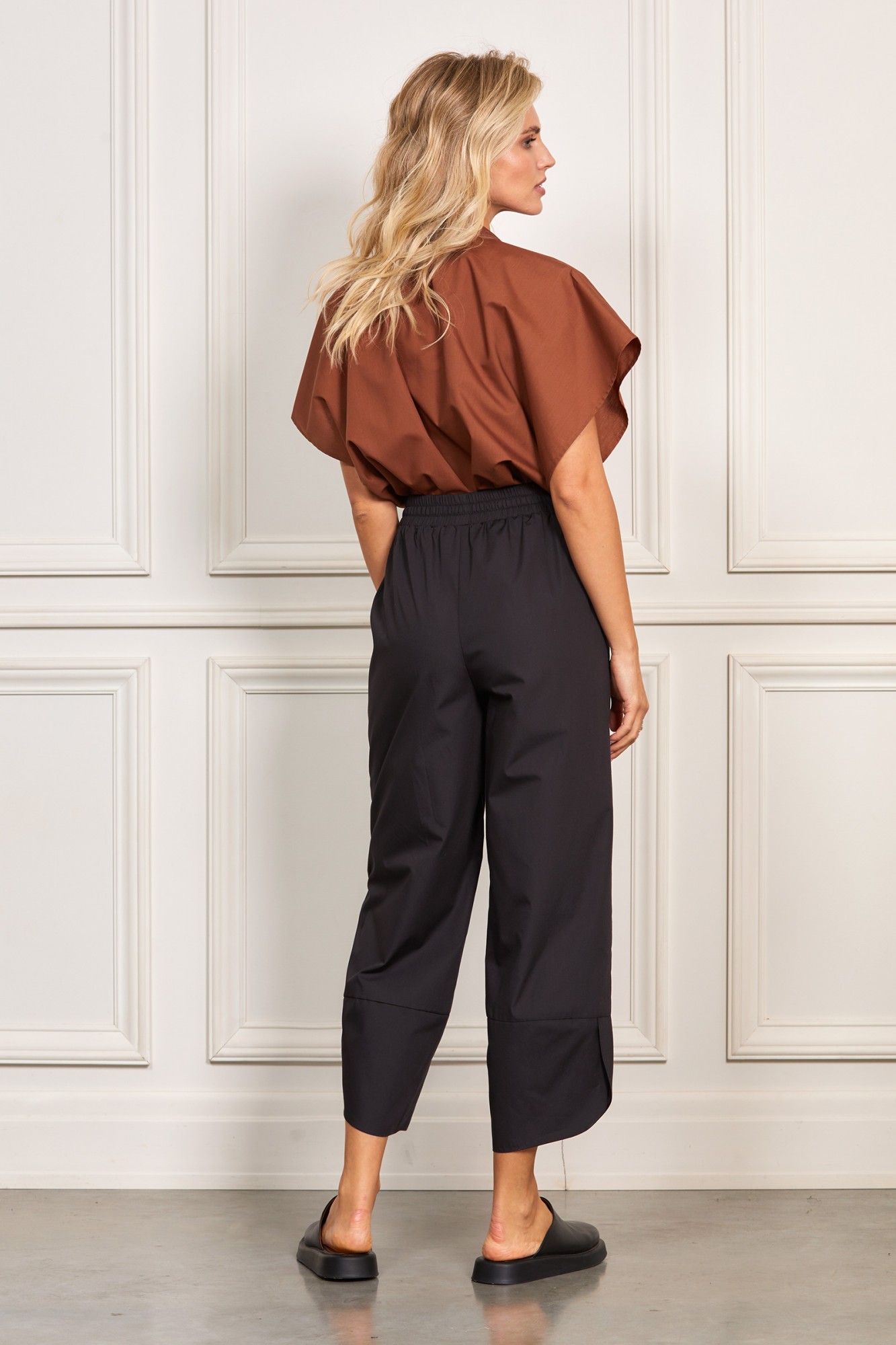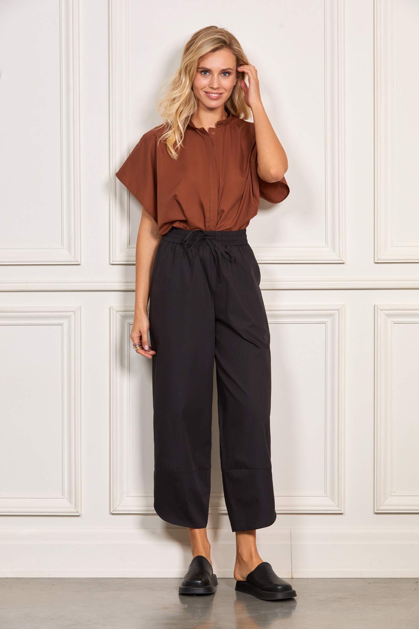 Блуза: - свободный силуэт - воротник-стойка - застежка на пуговицы по потайной планке - рукав цельнокроеный - низ изделия на резинке.