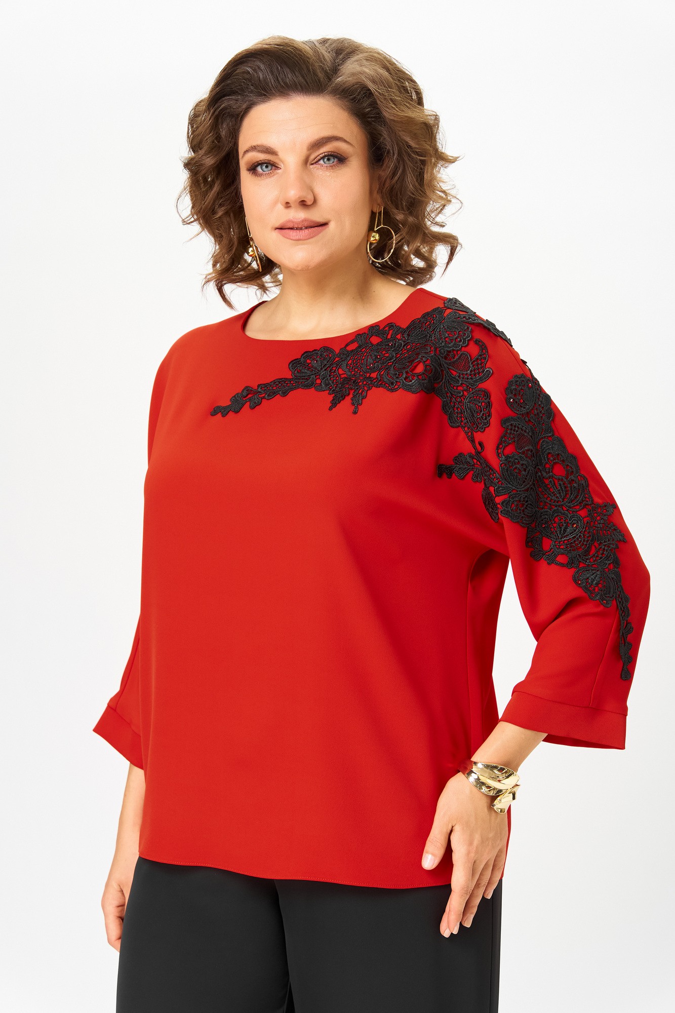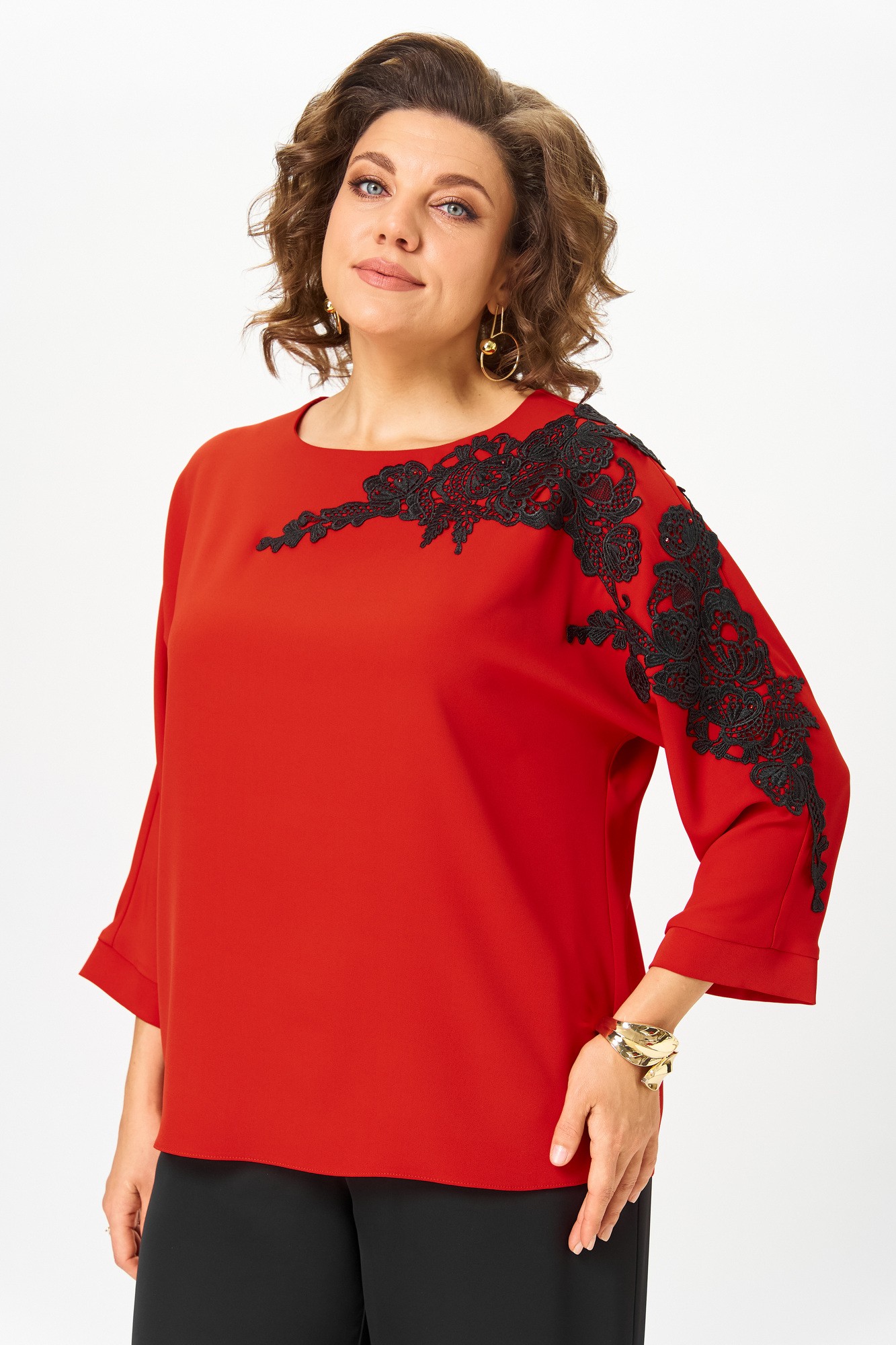 Блузка женская из текстильной ткани с цельнокроеным рукавом. Прямого силуэта. По переду блузки настрочена аппликация. По спинке расположен средний шов. Рукав 3/4, низ рукава с манжетой. Вырез горловины круглый, обработан обтачкой. Блузка застегивается на петлю-пуговицу.