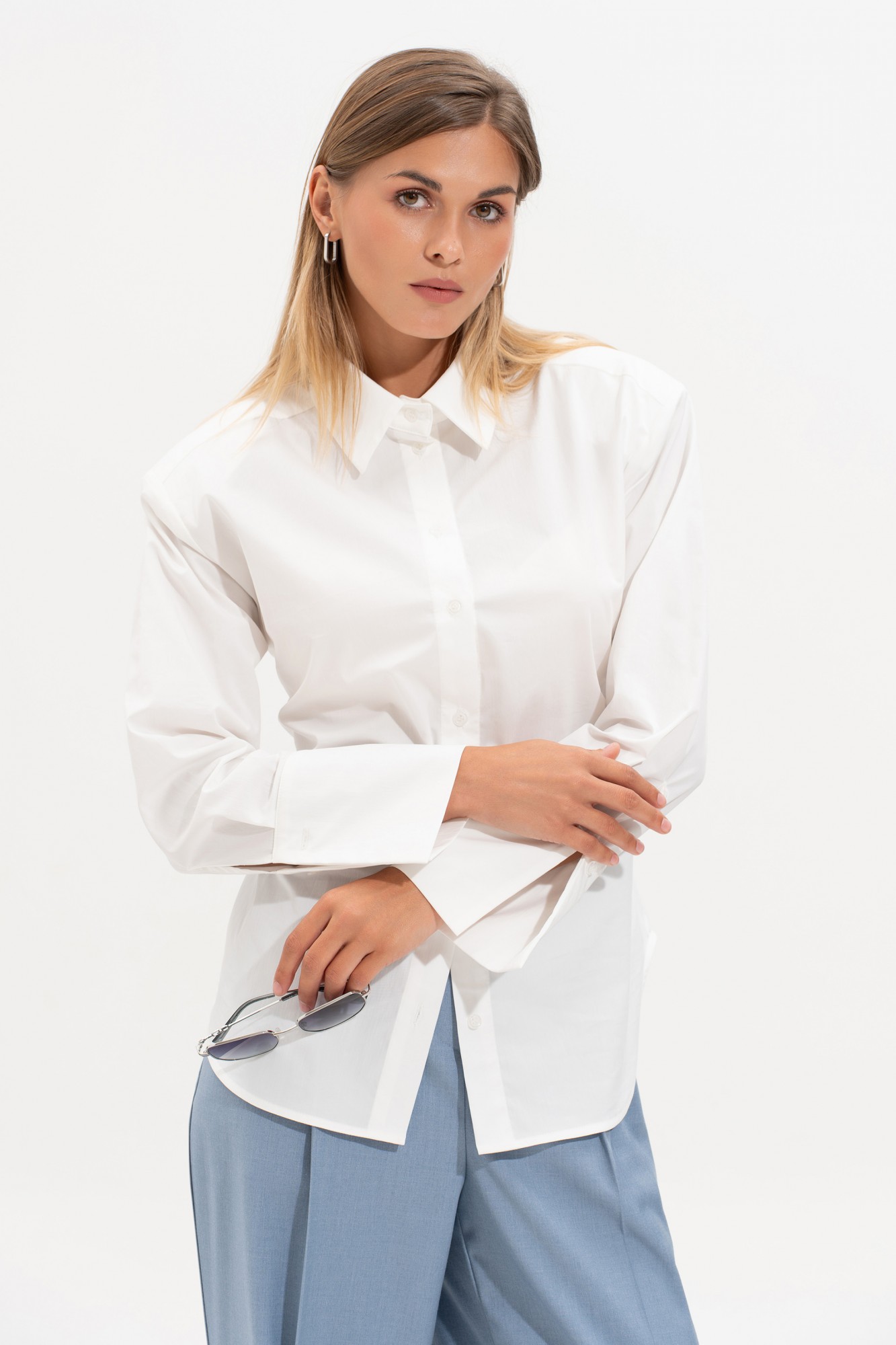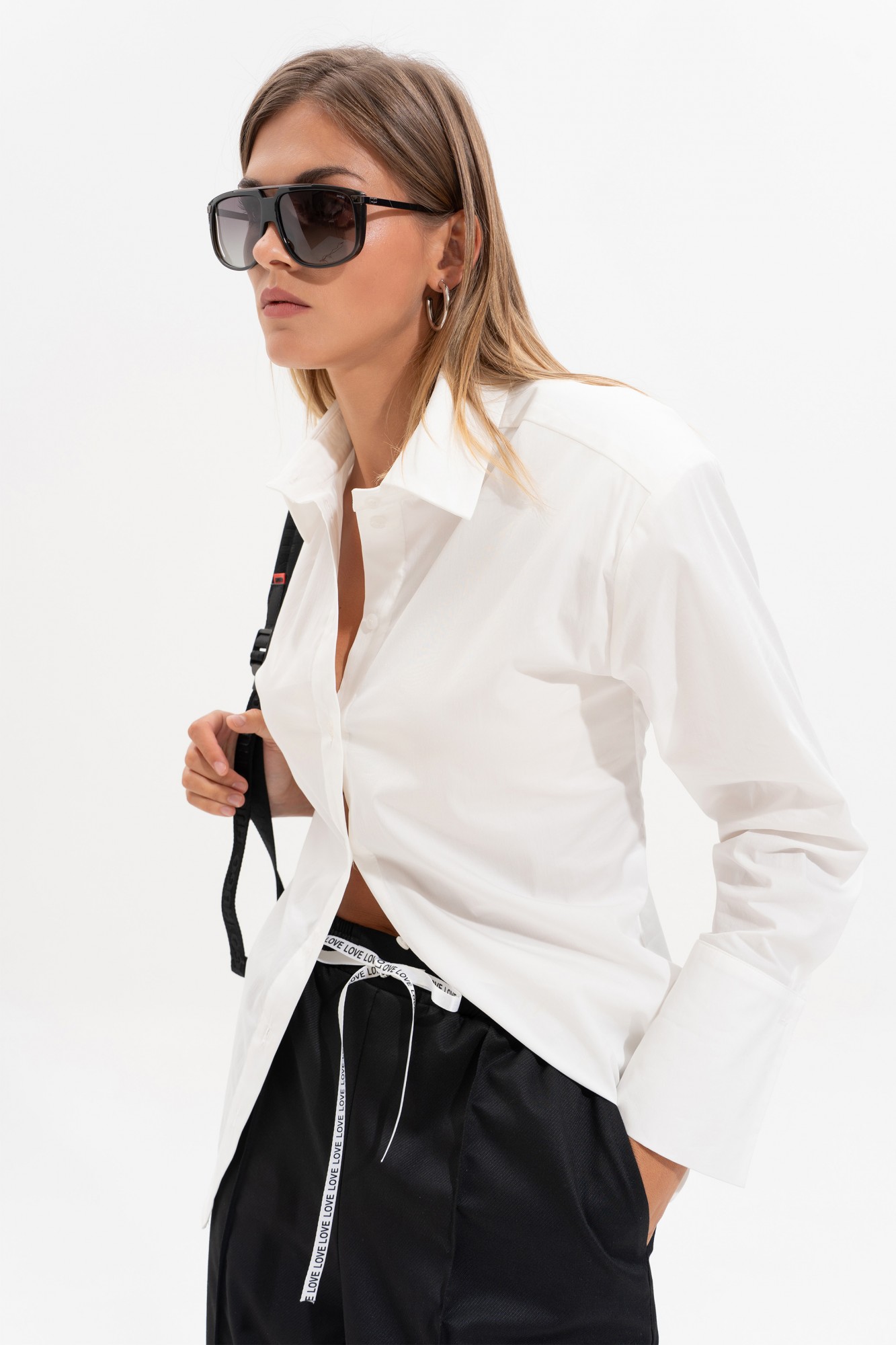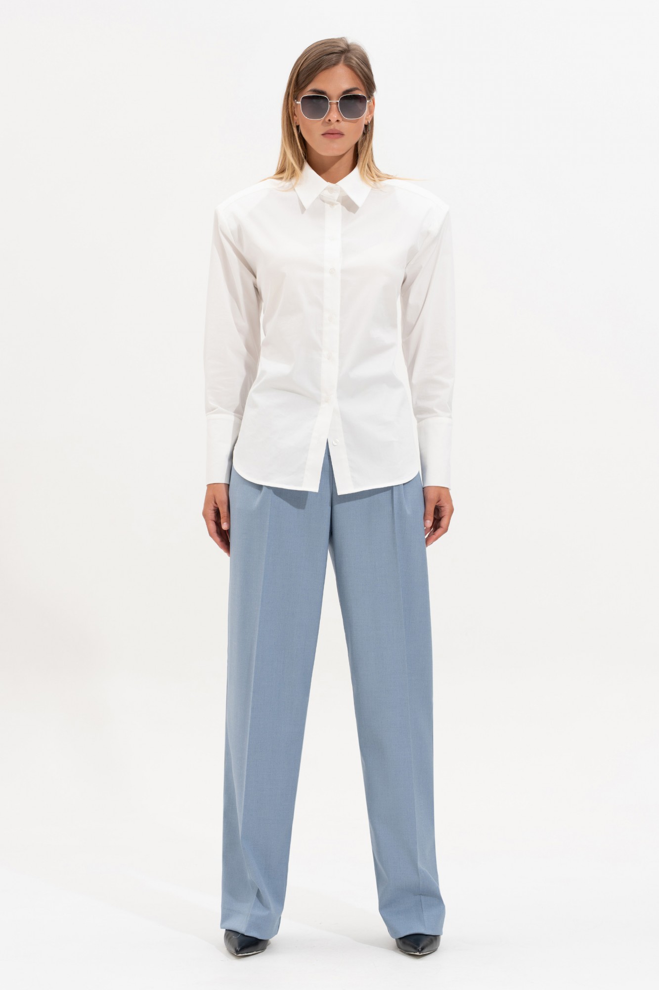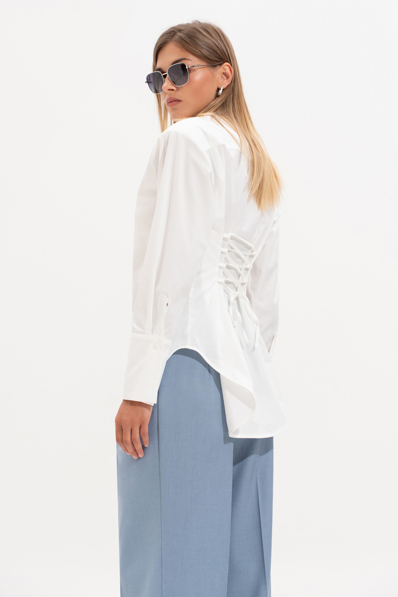 Блузка женская, актуального кроя, буквально украшает свою владелицу: деликатно расширяет плечи, акцентирует талию за счет шнуровки на спине. Рукав втачной, с плечевой накладкой и притачной манжетой, застегивающейся на 1 пуговицу. Воротник стояче-отложной с отрезной стойкой. Линия низа фигурная. Стильная, современная блузка легко встраивается в современный гардероб для любительниц office и old money core.