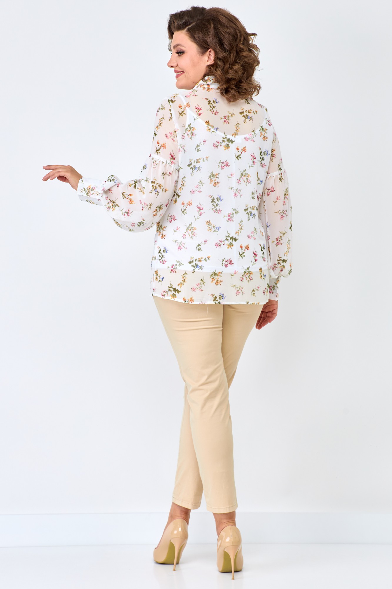 Блузка прямого силуэта. По переду нагрудные вытачки. Застежка на планку на петли-пуговицы. Воротник рубашечного типа. Рукав втачной, состоит из верхней части и средней. Средняя часть объемная со сборкой. Рукав заканчивается манжетой. Топ из хлопковой ткани с нагрудными вытачками.