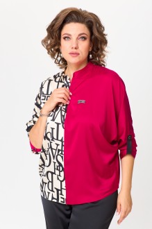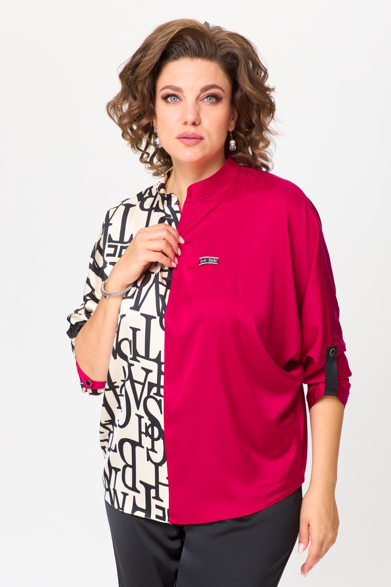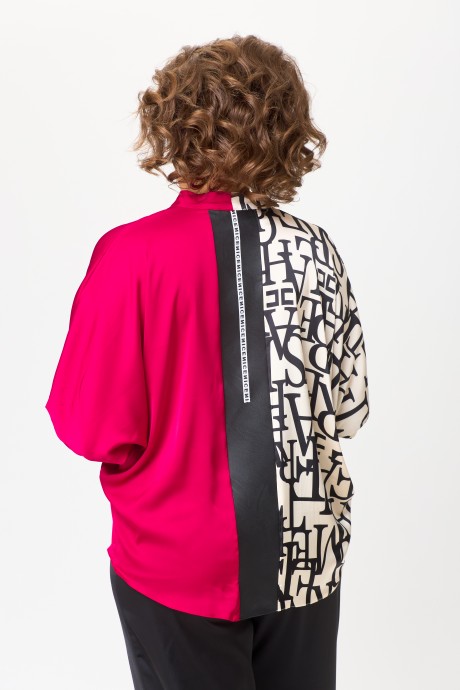 Блузка женская силуэта "летучая мышь" с цельнокроеным рукавом, без плечевых накладок, блуза выполнена из комбинировании 2-х видов ткани. Воротник стойка. Перед: полочка прямого силуэта со средним швом, в верхней части которой обработана потайная молния, на левой части пришито прямоугольное украшение со стразами. Одна полочка из ткани с расцветкой алфавит, другая полочка из ткани красного цвета. Спинка: резная, по центру притачивается планка шириной 8 см из эко-кожи, на которую настрачивается отделочная тесьма с надписями, одна часть спинки из ткани красного цвета, а другая из ткани в расцветку "алфавит" черно-бежевого цвета. Низ рукава обработан манжетой на одну петлю-пуговицу. На уровне локтя выполнен подрез в который вставлена пата застегивающая на пуговицу. которая регулирует длину рукава.