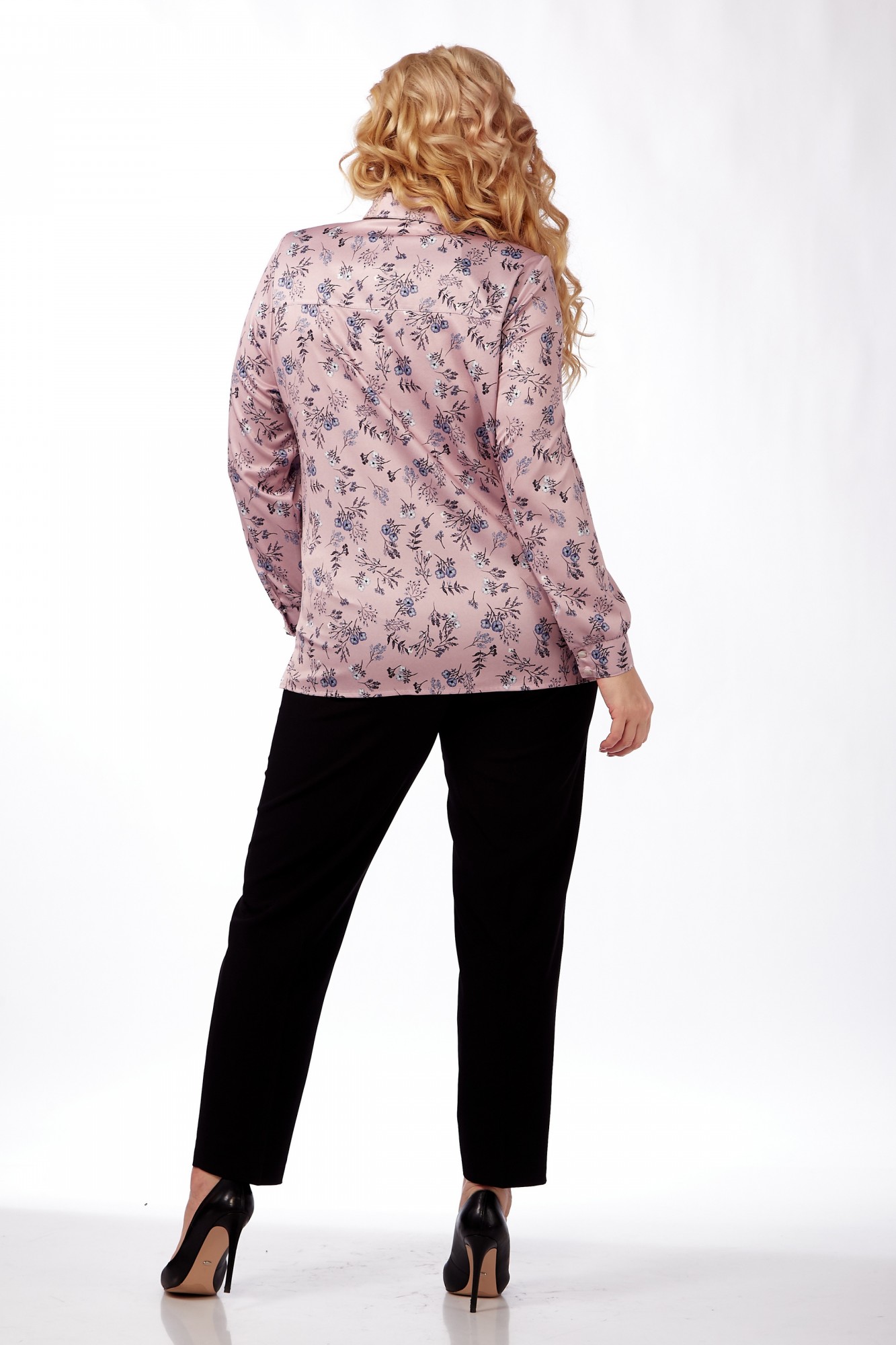Блузка женская прямого силуэта с втачными одношовными рукавами. По низу рукавов притачная манжета с петлями и пуговицами. Перед с нагрудными вытачками, выходящими из проймы. Горловина обработана стояче-отложным воротником. Вырез горловины фигурный, оформлен имитацией цельнокроеной планки. Спинка с кокеткой выше линии лопаток. По низу боковых швов обработаны разрезы. С плечевыми накладками.