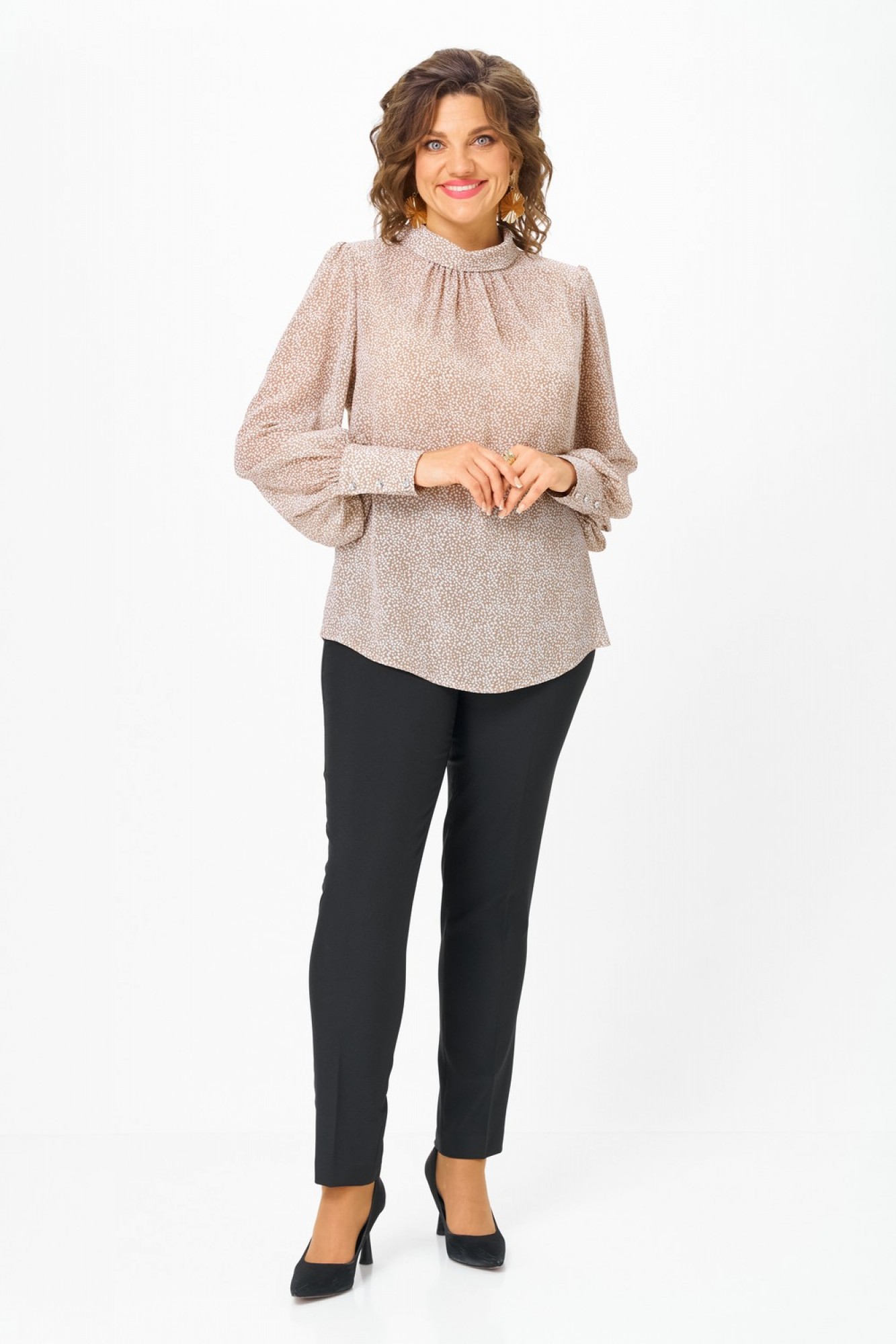 Блузка женская свободного силуэта, с втачным рукавом. Горловина переда с декоративной сборкой и воротником - хомут. Отделкой служит съемный бант. Спинка со средним швом и застежкой по воротнику на две воздушные петли и пуговицы. Рукав длинный со сборкой по окату и низу рукава, на широкой манжете с застежкой на петли и пуговицы. Фурнитура может меняться в зависимости от наличия.