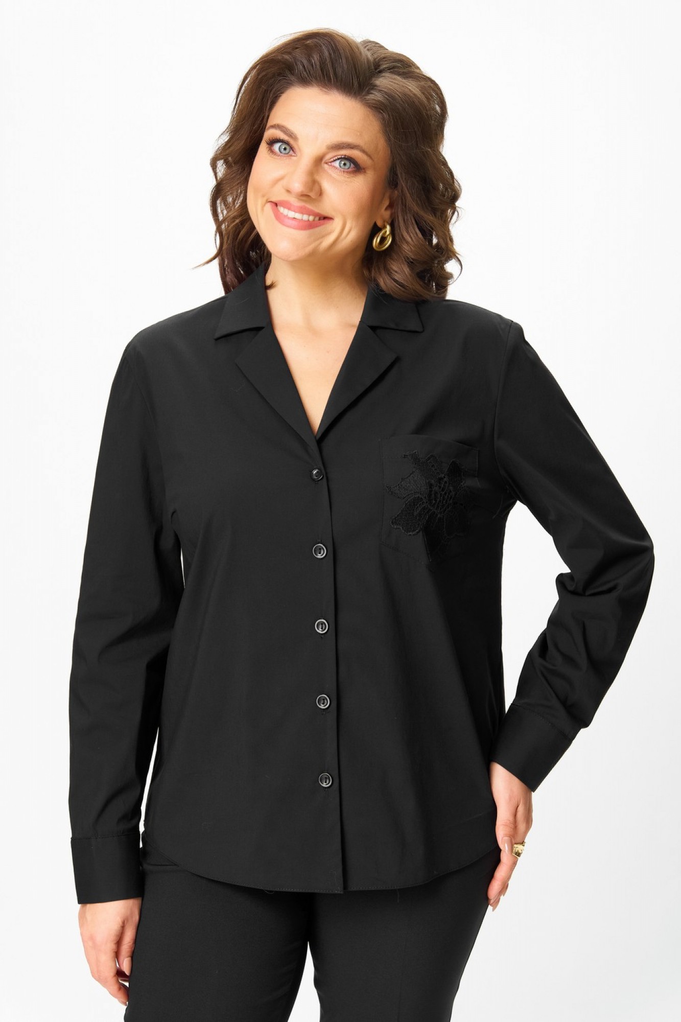 Блузка женская из хлопковой ткани, прямого силуэта с втачным рукавом. Линия плеча слегка спущена. Застежка центральная на петли и пуговицы. Воротник отложной с лацканами. Перед с вытачками по линии груди. По левой части переда накладной карман с отделкой. Рукав длинный рубашечный, по низу притачная манжета с застежкой петли и пуговицы. Линия низа фигурная. Фурнитура может меняться от наличия.